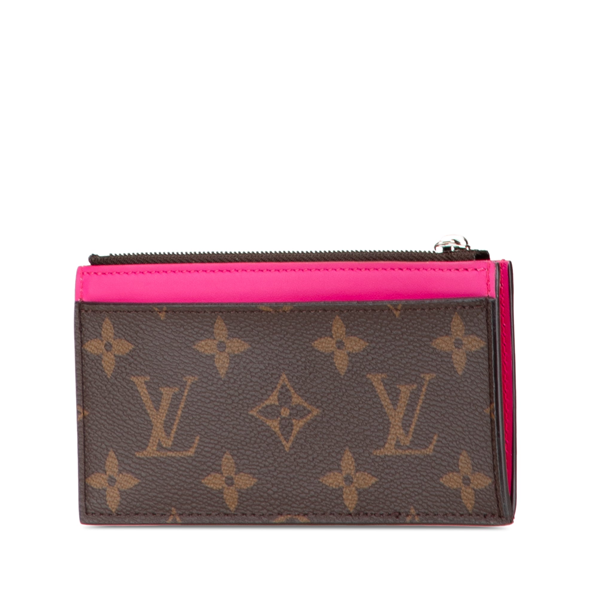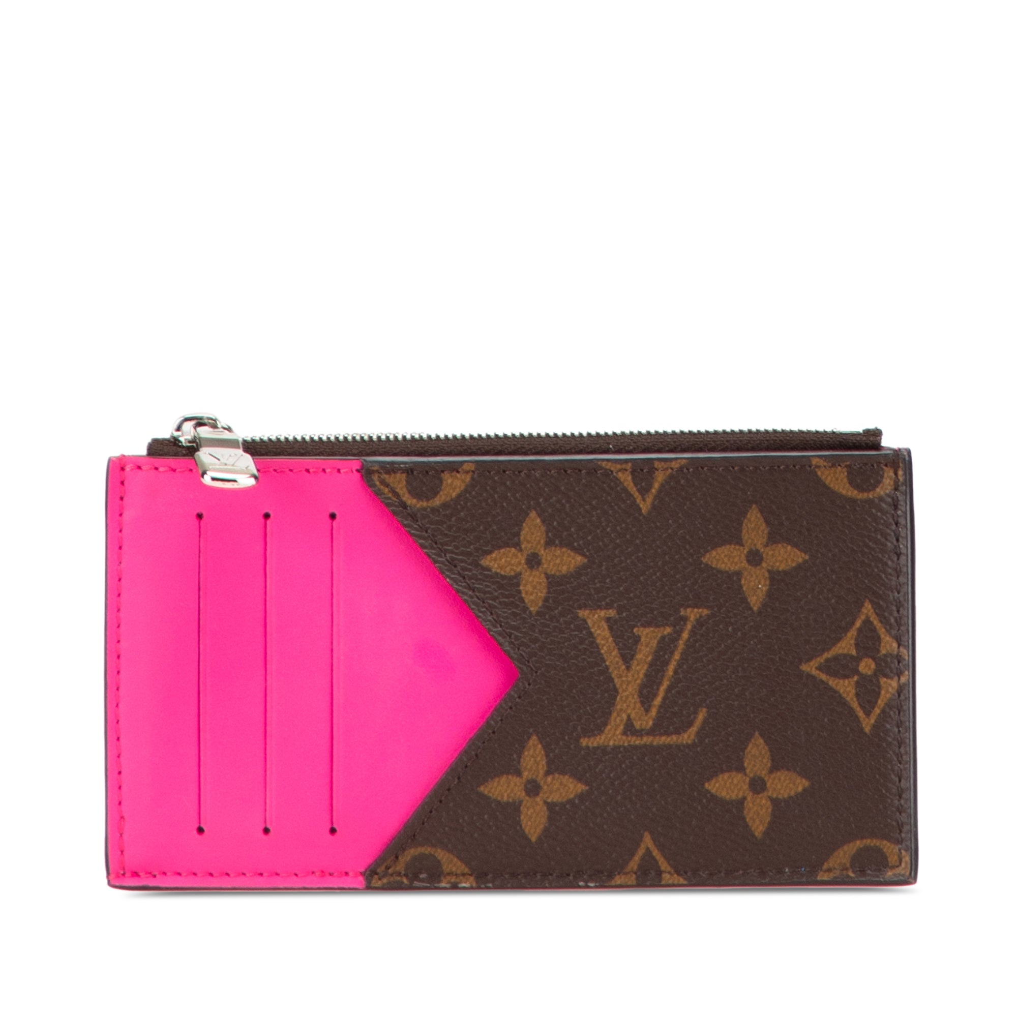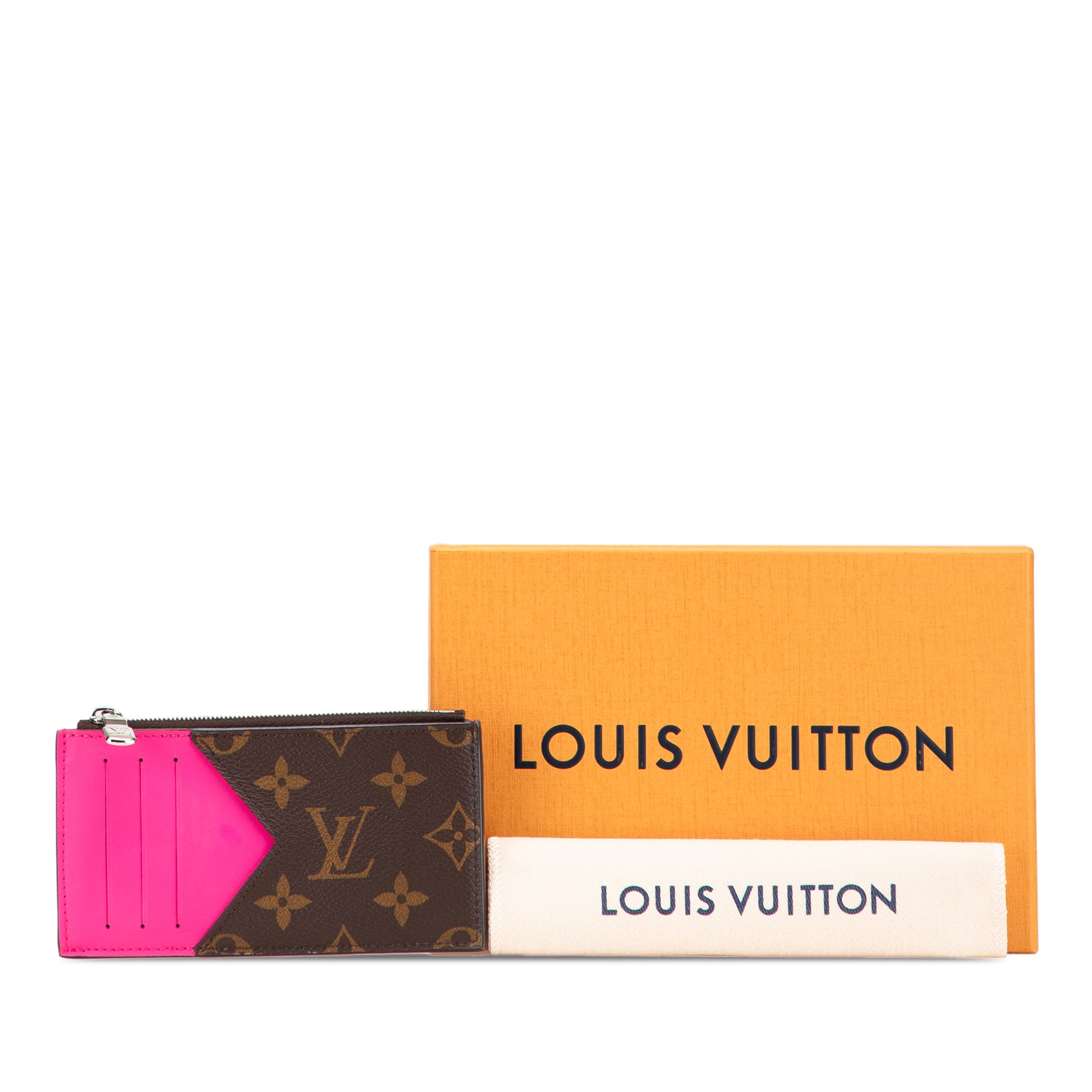 This coin card holder features a monogram canvas body, a top zip closure, and exterior slip pockets. Inclusion: Dust bag, box. Retail Price: 845.00