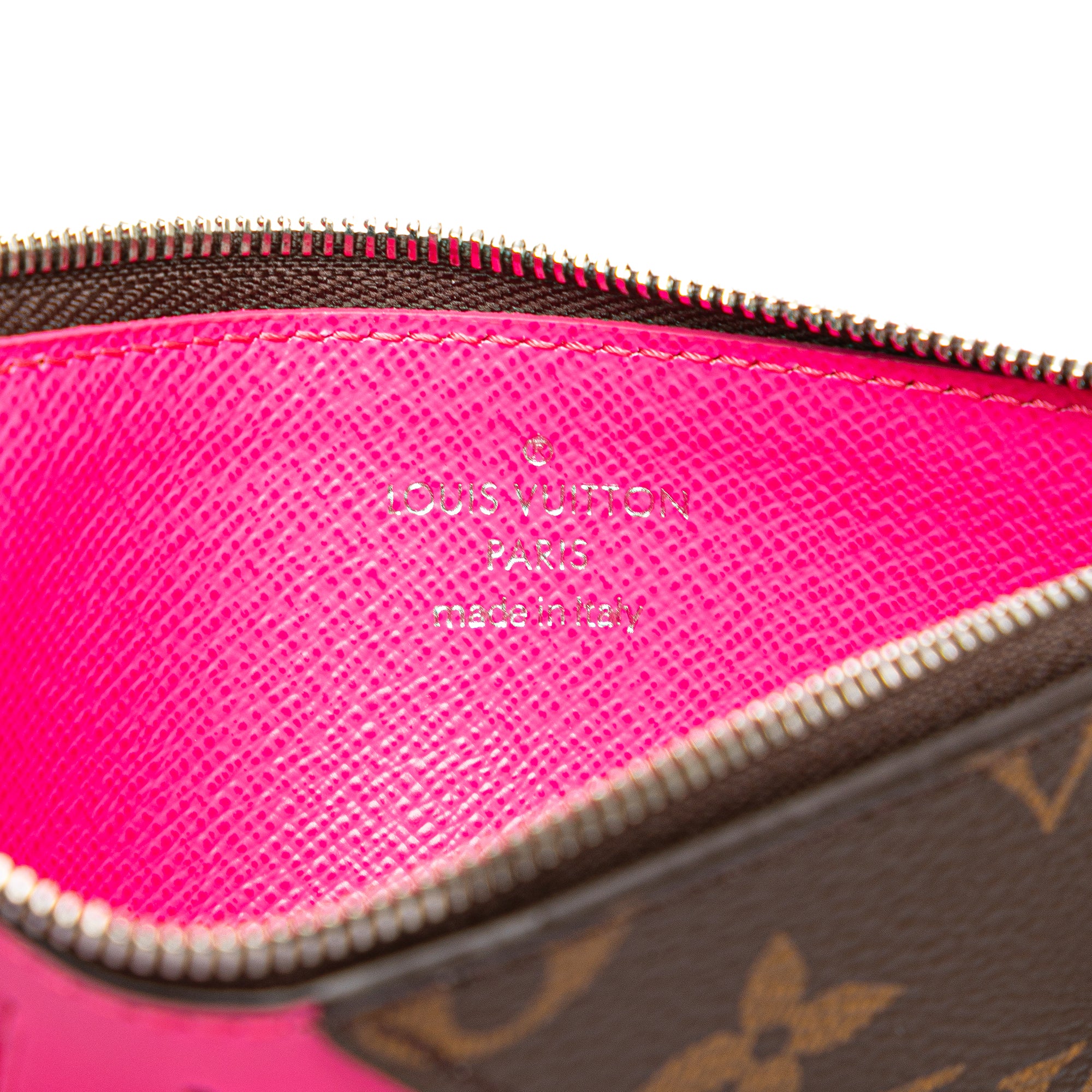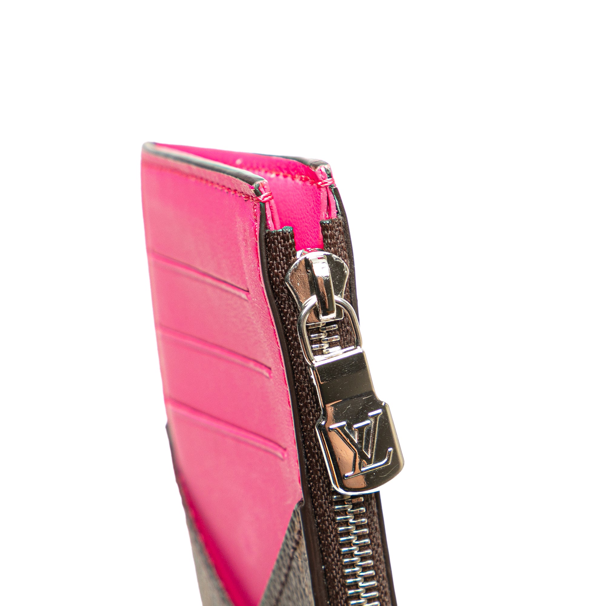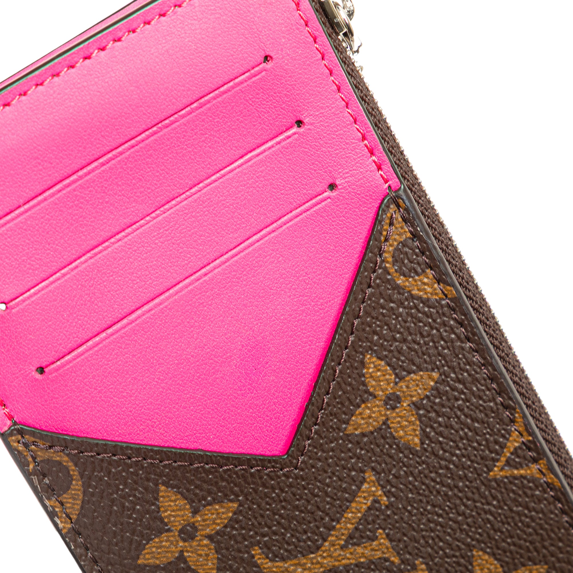 This coin card holder features a monogram canvas body, a top zip closure, and exterior slip pockets. Inclusion: Dust bag, box. Retail Price: 845.00