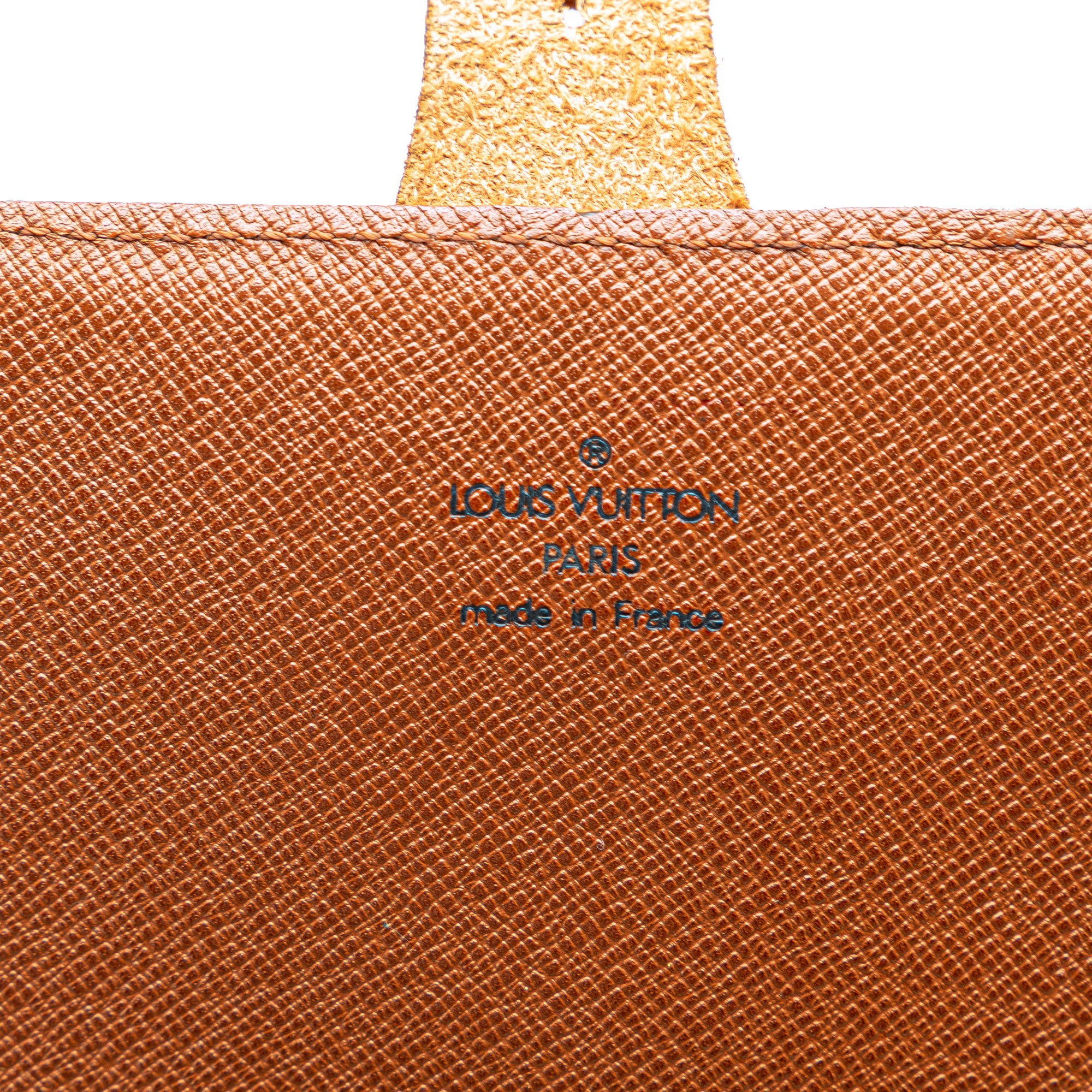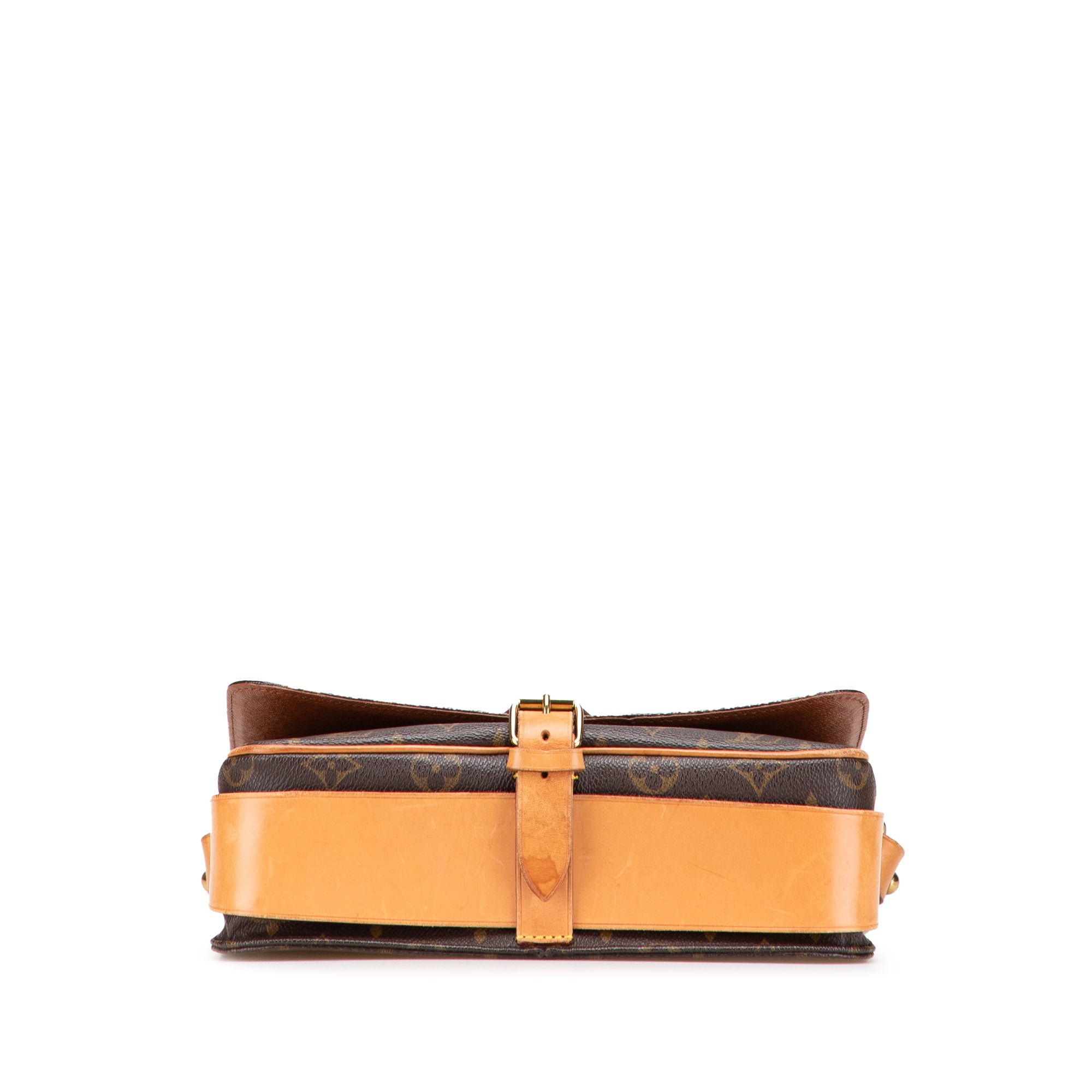 The Cartouchiere features a monogram canvas body with vachetta leather trim, an adjustable flat vachetta leather strap, a front flap with buckle closure, and an interior slip pocket. Retail Price: 1240.00