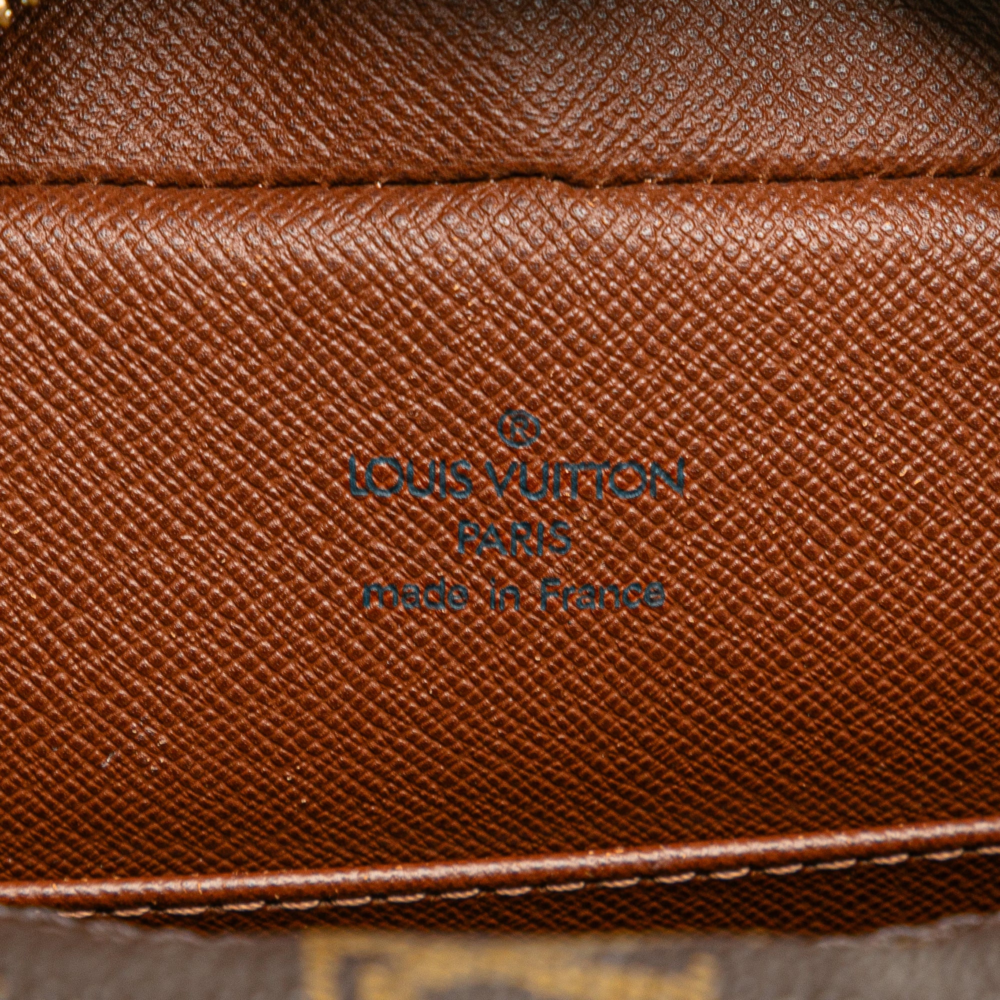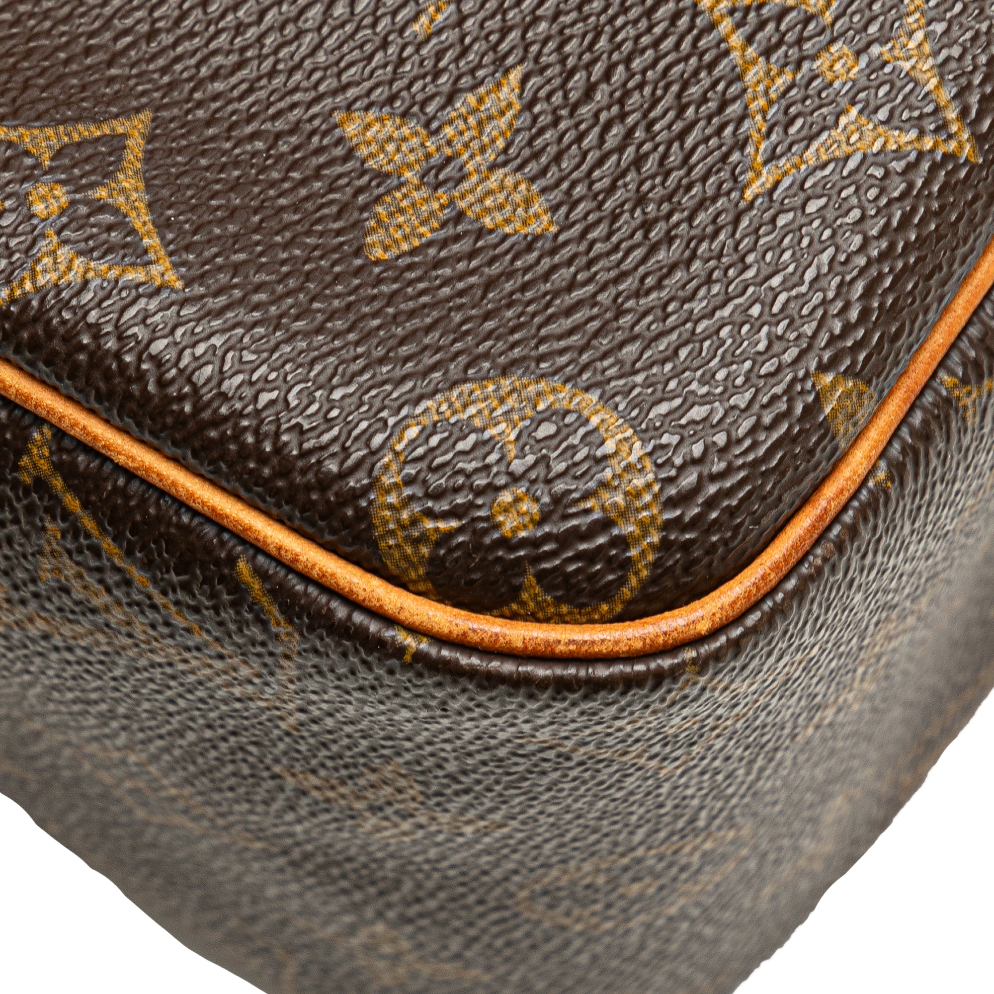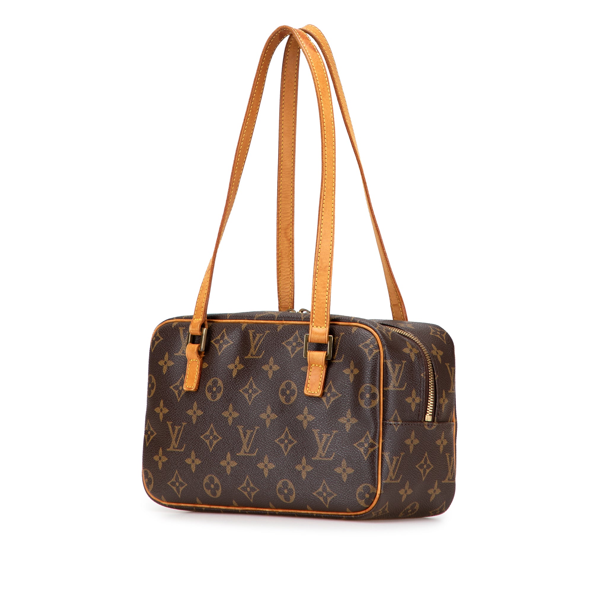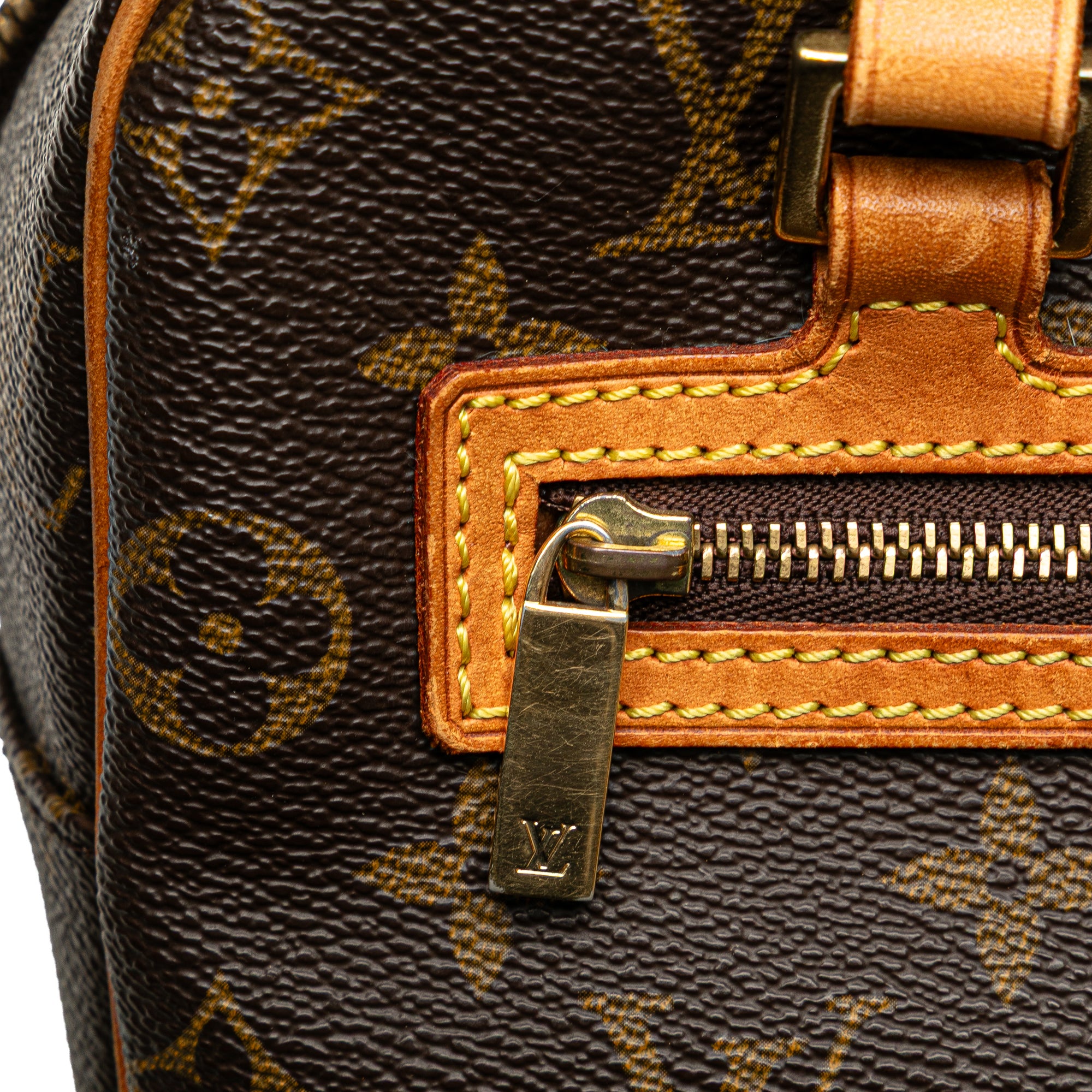 The Cite MM features a monogram canvas body with vachetta leather trim, flat vachetta leather shoulder straps, an exterior front zip pocket, a top zip closure, and interior open and slip pockets. Retail Price: 1220.00