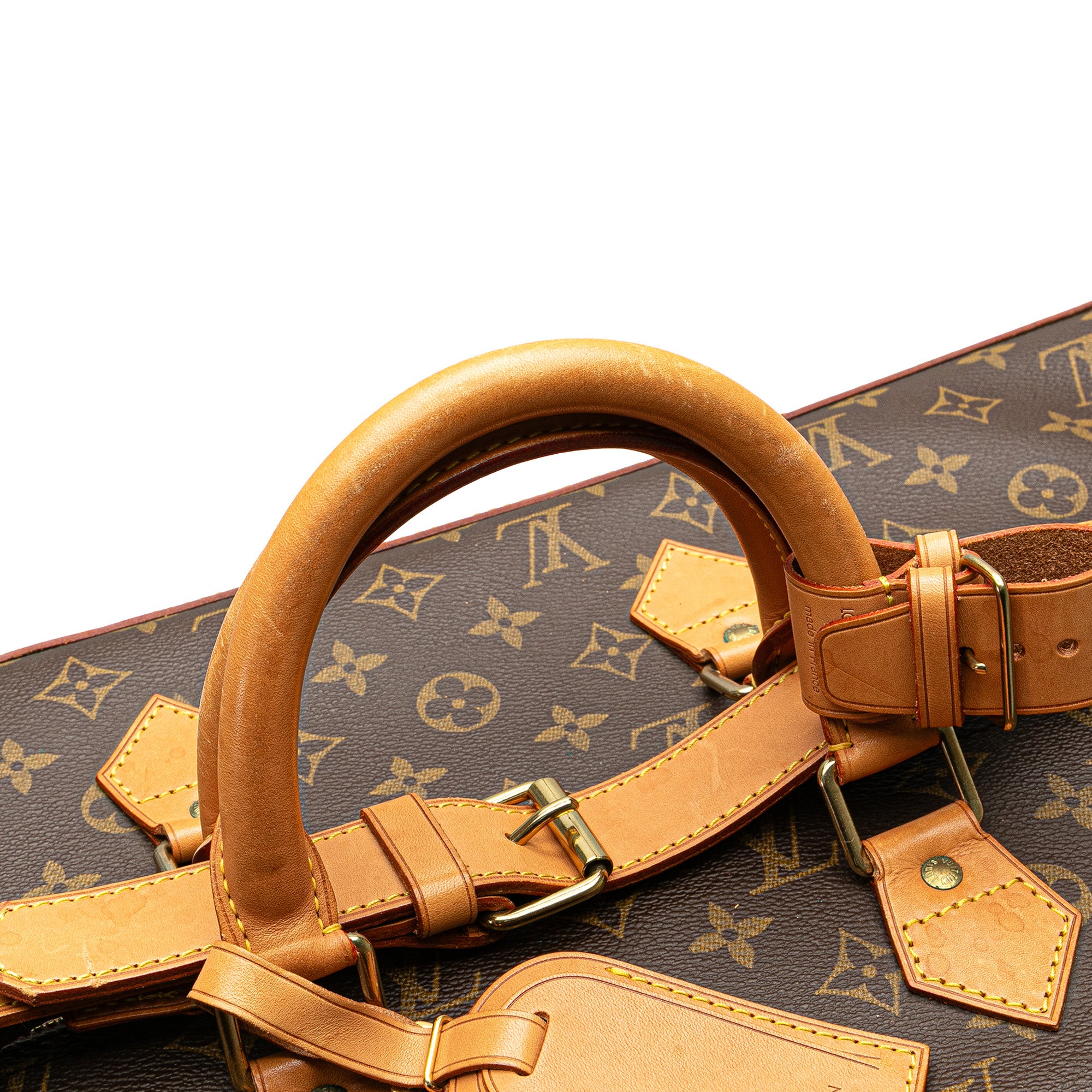 The Cruiser 50 features a monogram canvas body with vachetta leather trim, rolled vachetta leather handles, a top buckle closure, a top zip closure, and an interior slip pocket. Retail Price: 2800.00