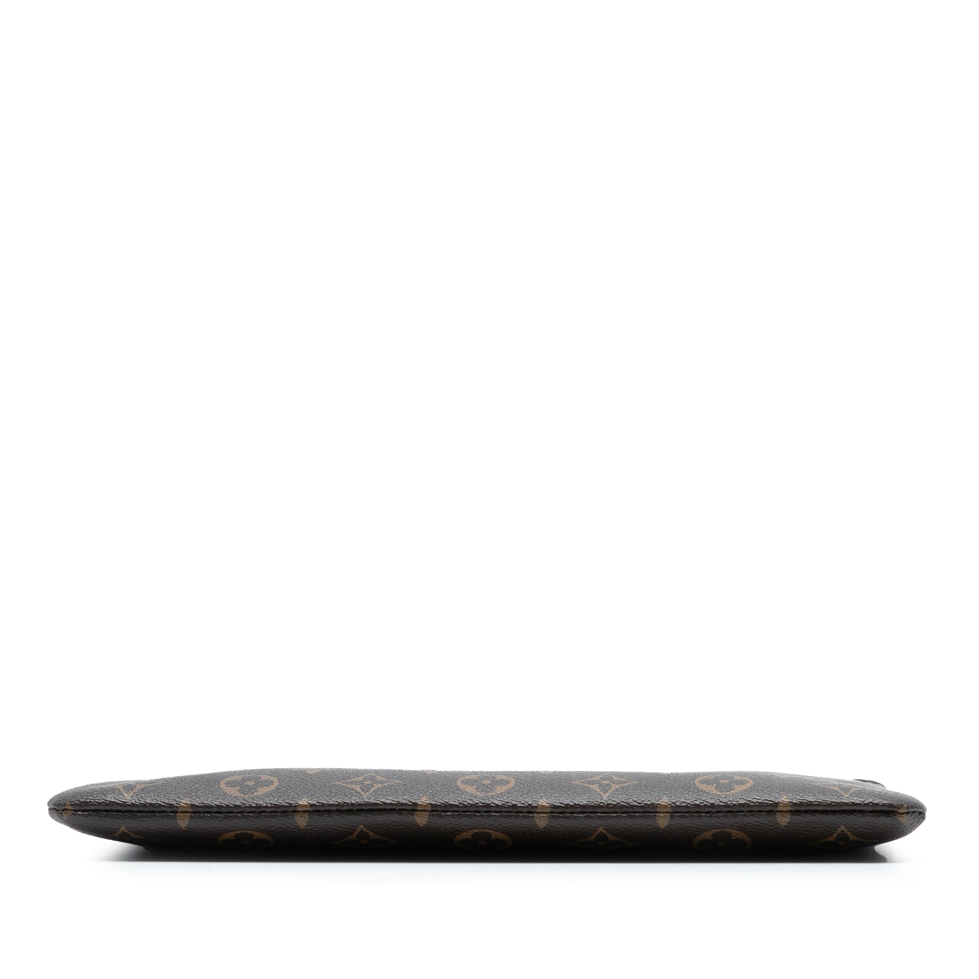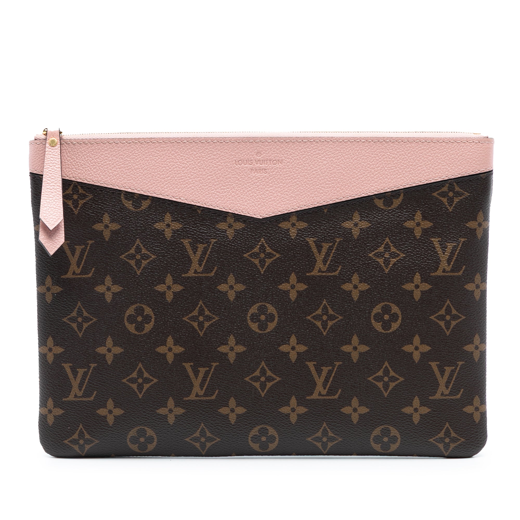 The Daily Pouch features a monogram canvas body with leather trim, a top zip closure, and an interior slip pocket. Retail Price: 870.00