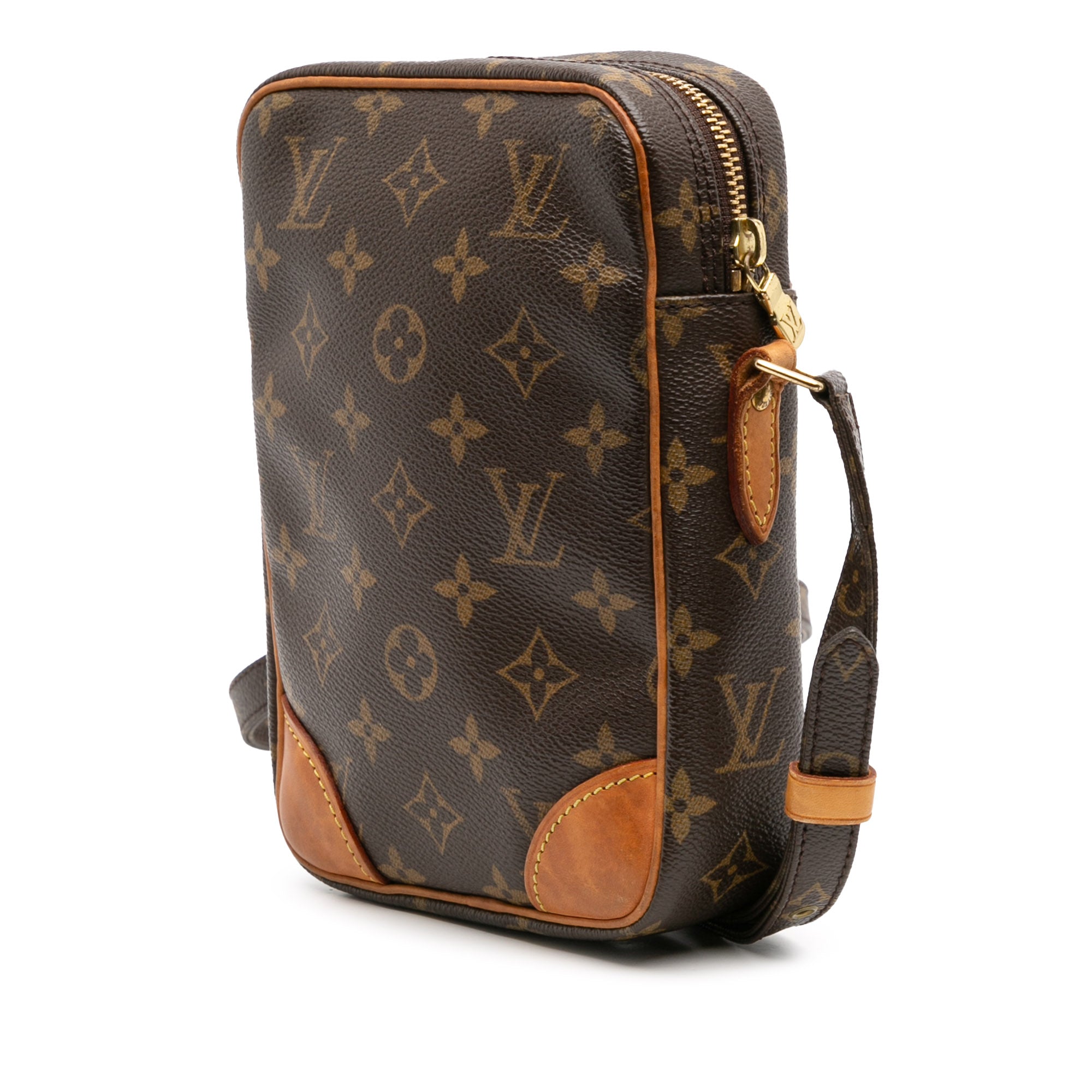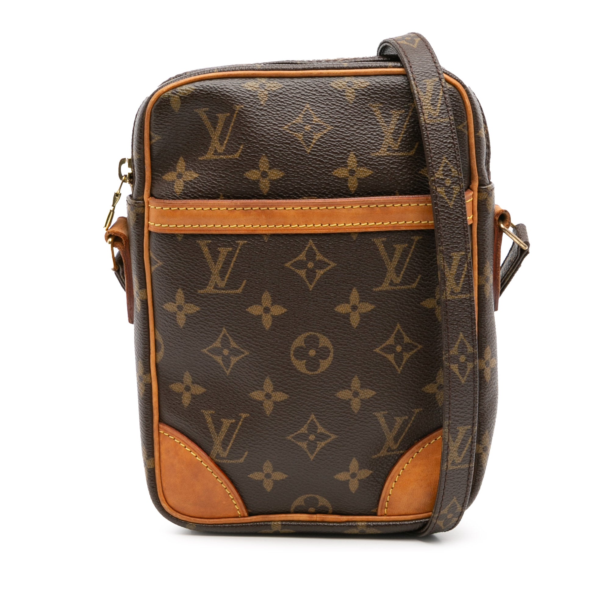 The Danube features a monogram canvas body with vachetta leather trim, an adjustable shoulder strap with leather details, a top zip closure, an exterior front slip pocket, and an interior slip pocket. Retail Price: 855.00