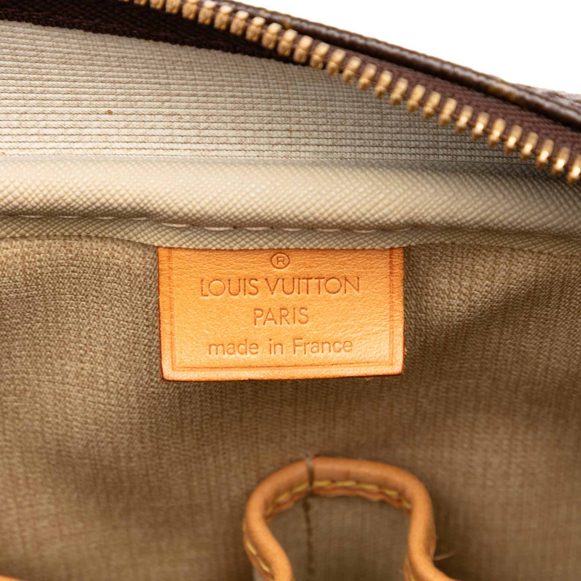 The Deauville features a monogram canvas body with vachetta leather trim, rolled vachetta leather handles, a top zip closure, an exterior slip pocket, and interior open pockets. Retail Price: 968.00