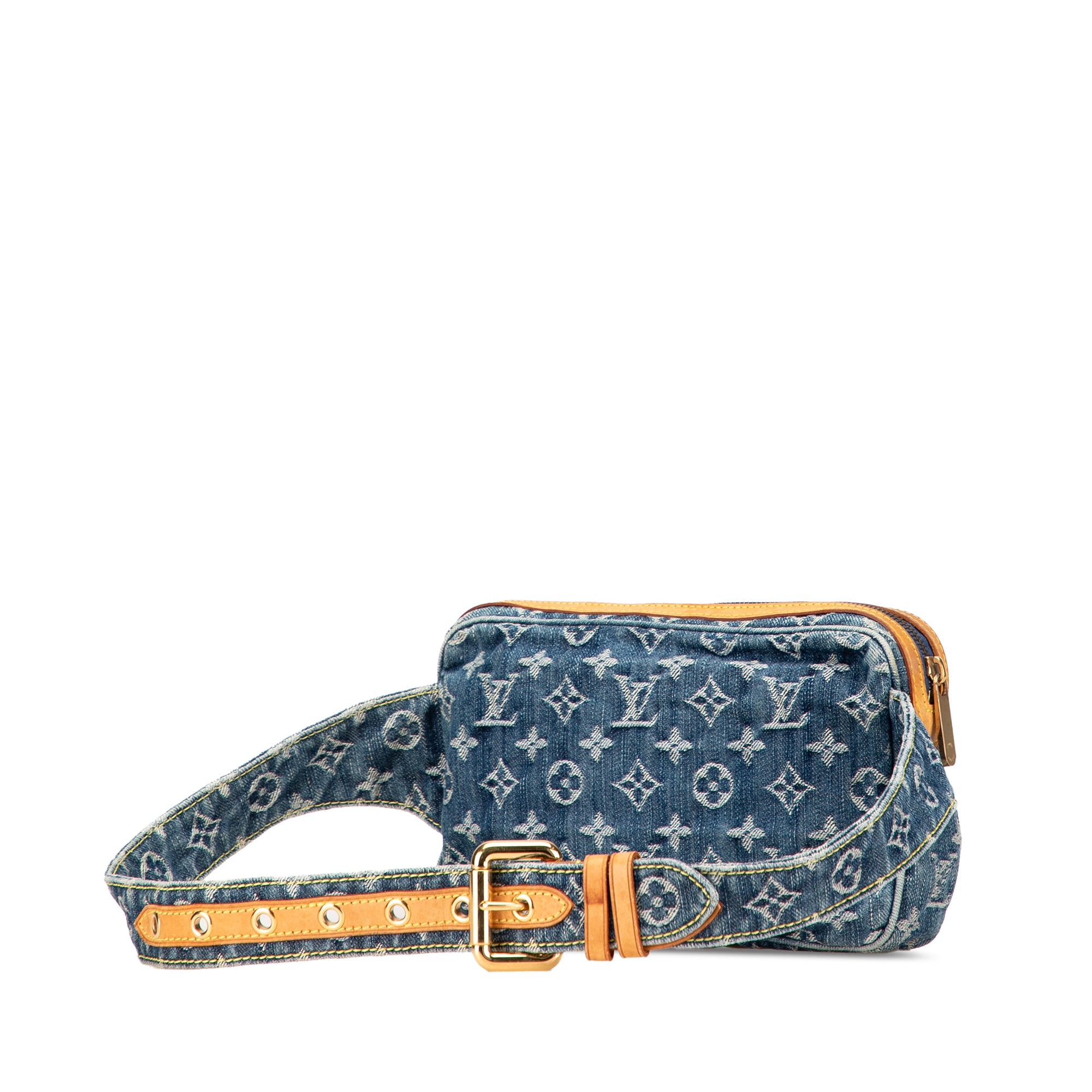This belt bag features a monogram denim body with vachetta leather trim, an adjustable flat waist strap, a top zip closure, an exterior flap pocket with metal push lock closure, and interior open pockets. Retail Price: 3100.00