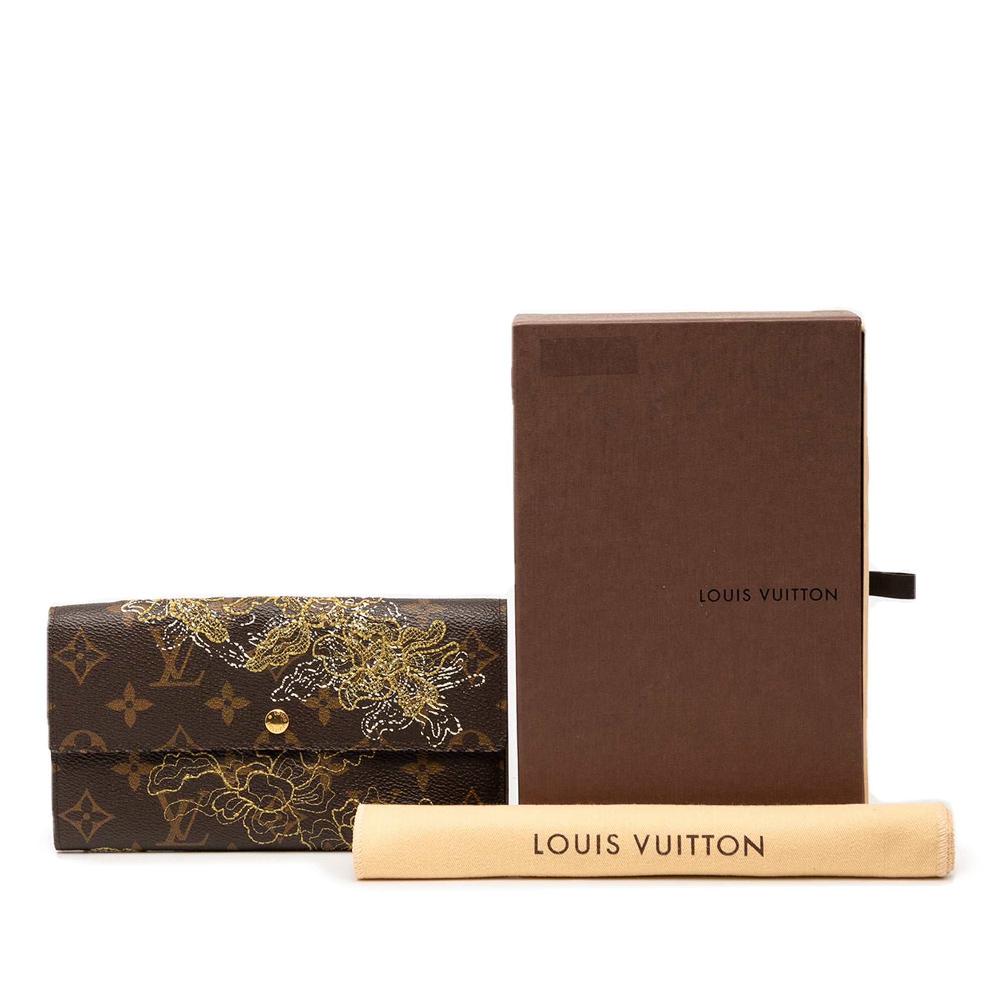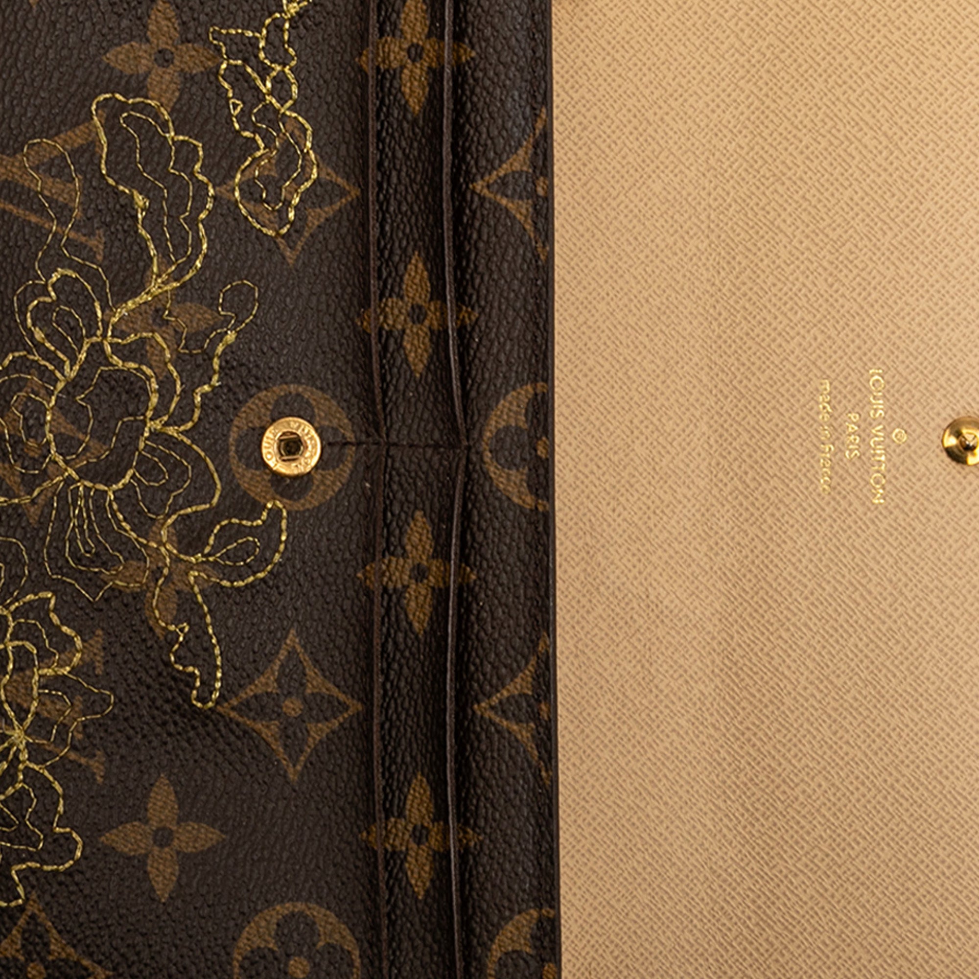 This long wallet features a monogram canvas body with floral details, a flap with a snap button closure, and interior zip and slip compartments. Inclusion: Dust bag, box. Retail Price: 805.00