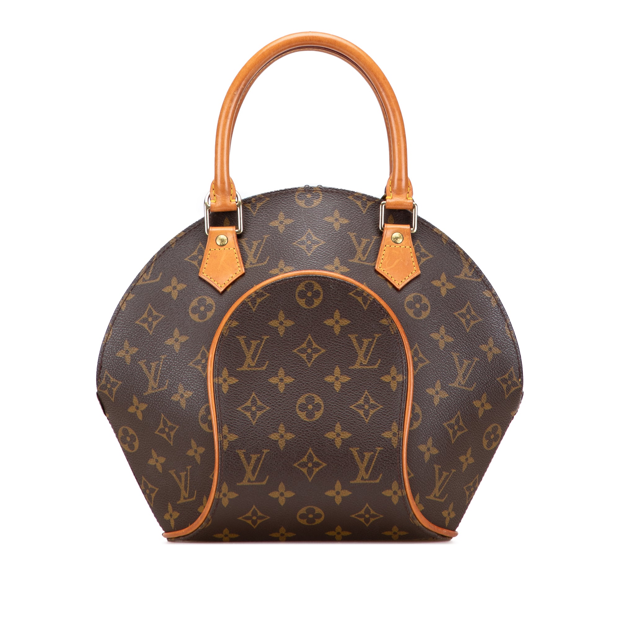 The Ellipse PM features a structured monogram canvas body with vachetta leather trim, rolled vachetta leather handles, a top zip closure, and an interior slip pocket. Retail Price: 1120.00