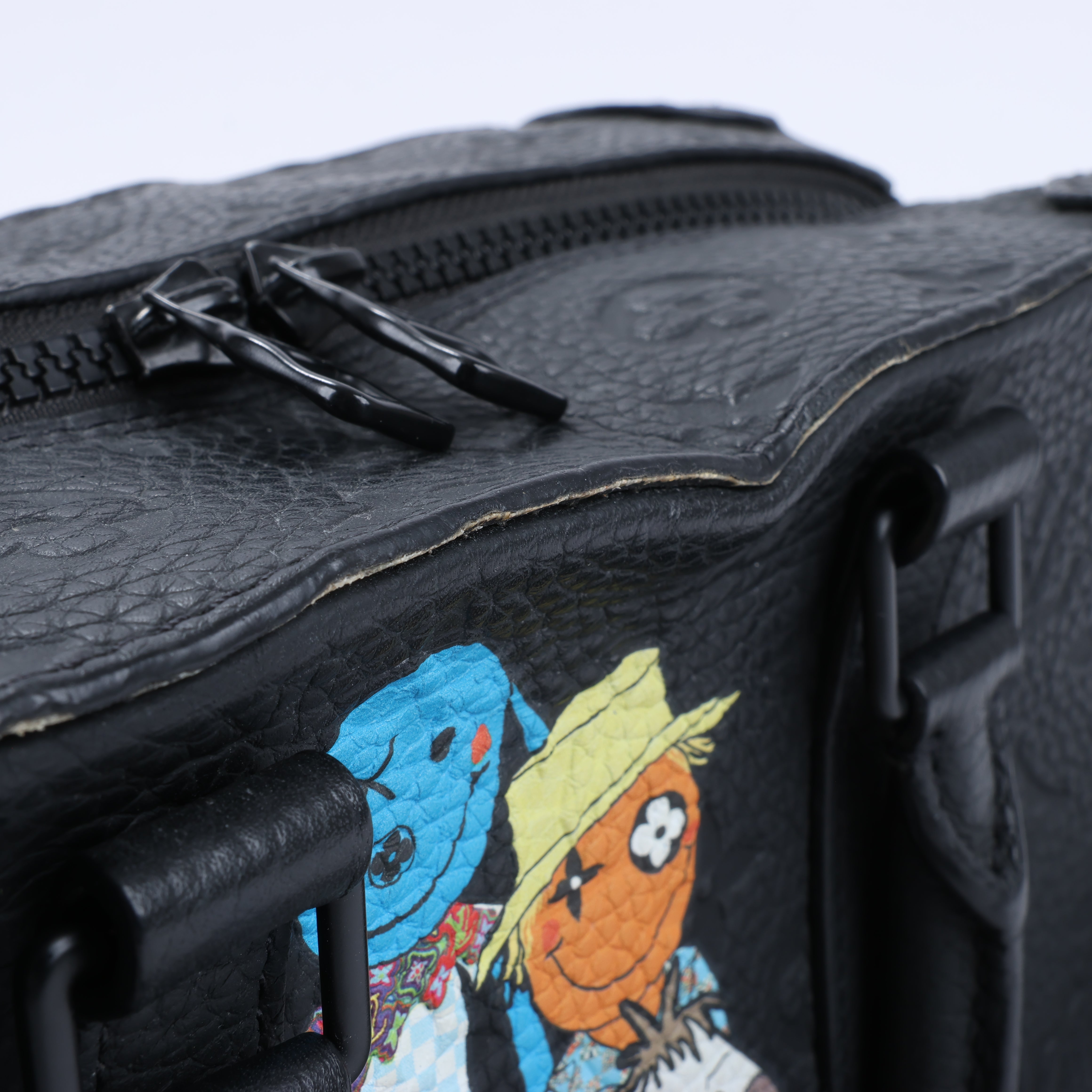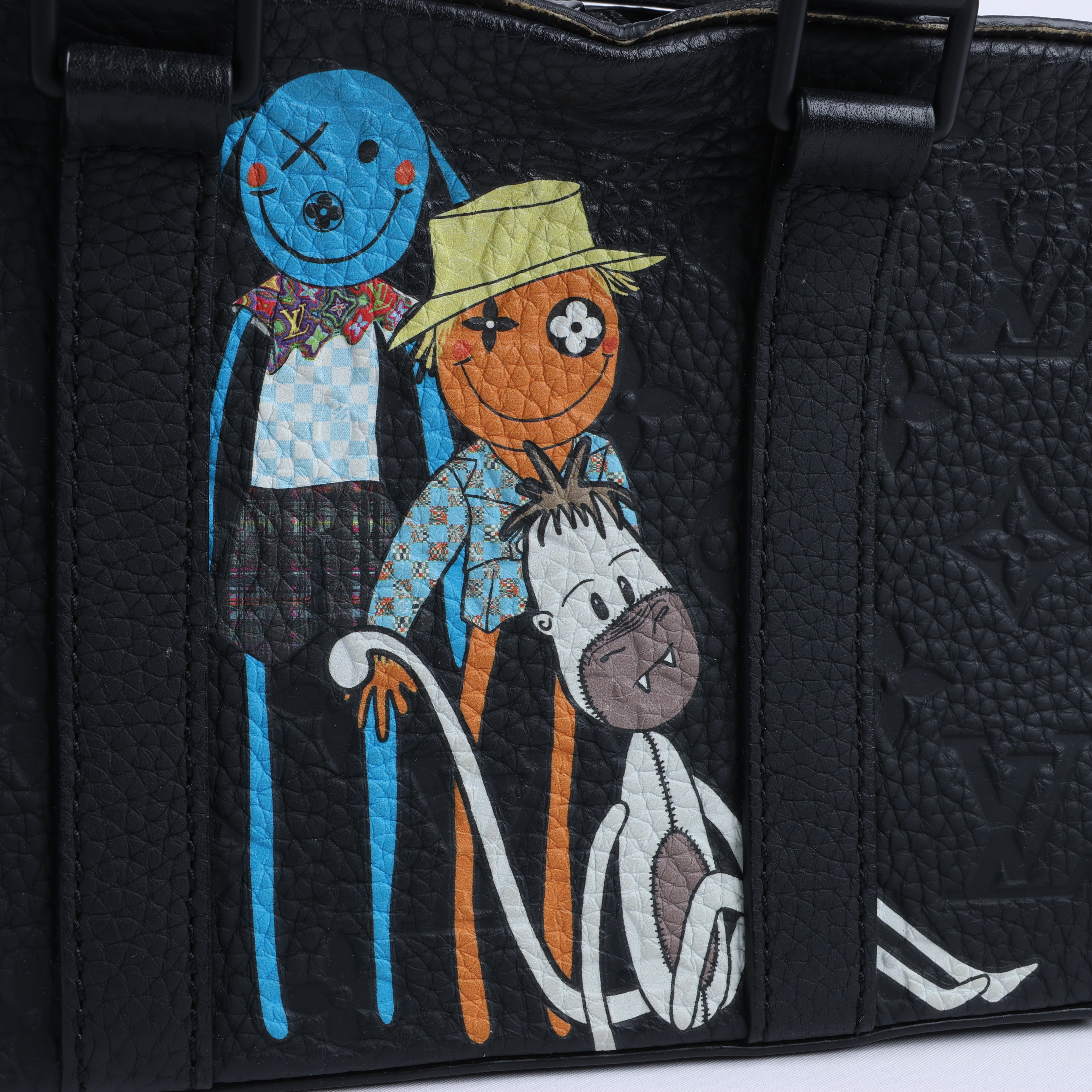 Express your individuality with the Louis Vuitton Monogram Emboss Soft Trunk in black. Featuring quirky doll artwork, embossed leather, and silver-tone hardware, this versatile 2-way bag offers both top handles and a detachable strap for effortless style. A collector's dream!