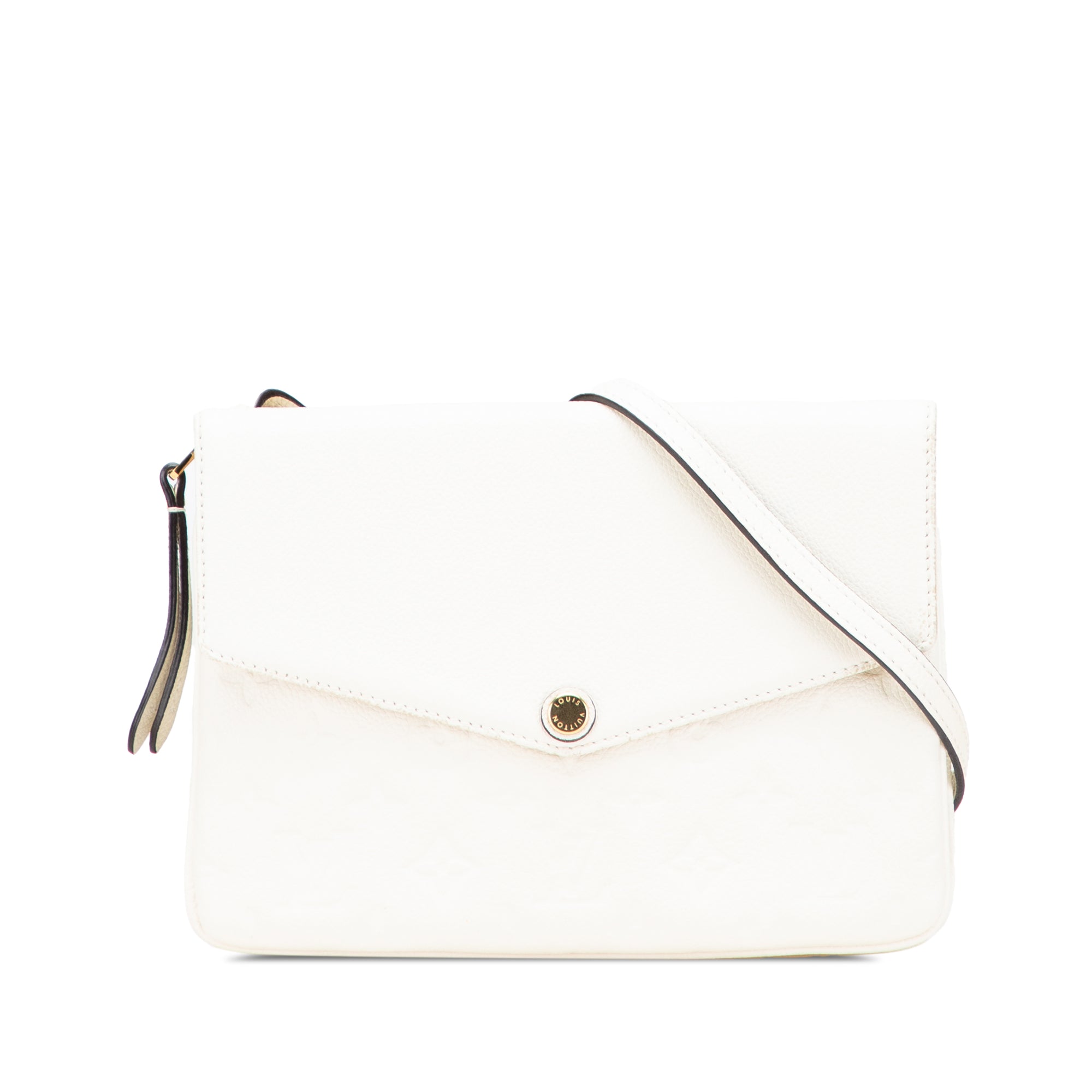 The Twice features a monogram empreinte leather body, a detachable flat leather strap, a front flap with snap closure, and an exterior zip compartment. Retail Price: 1440.00