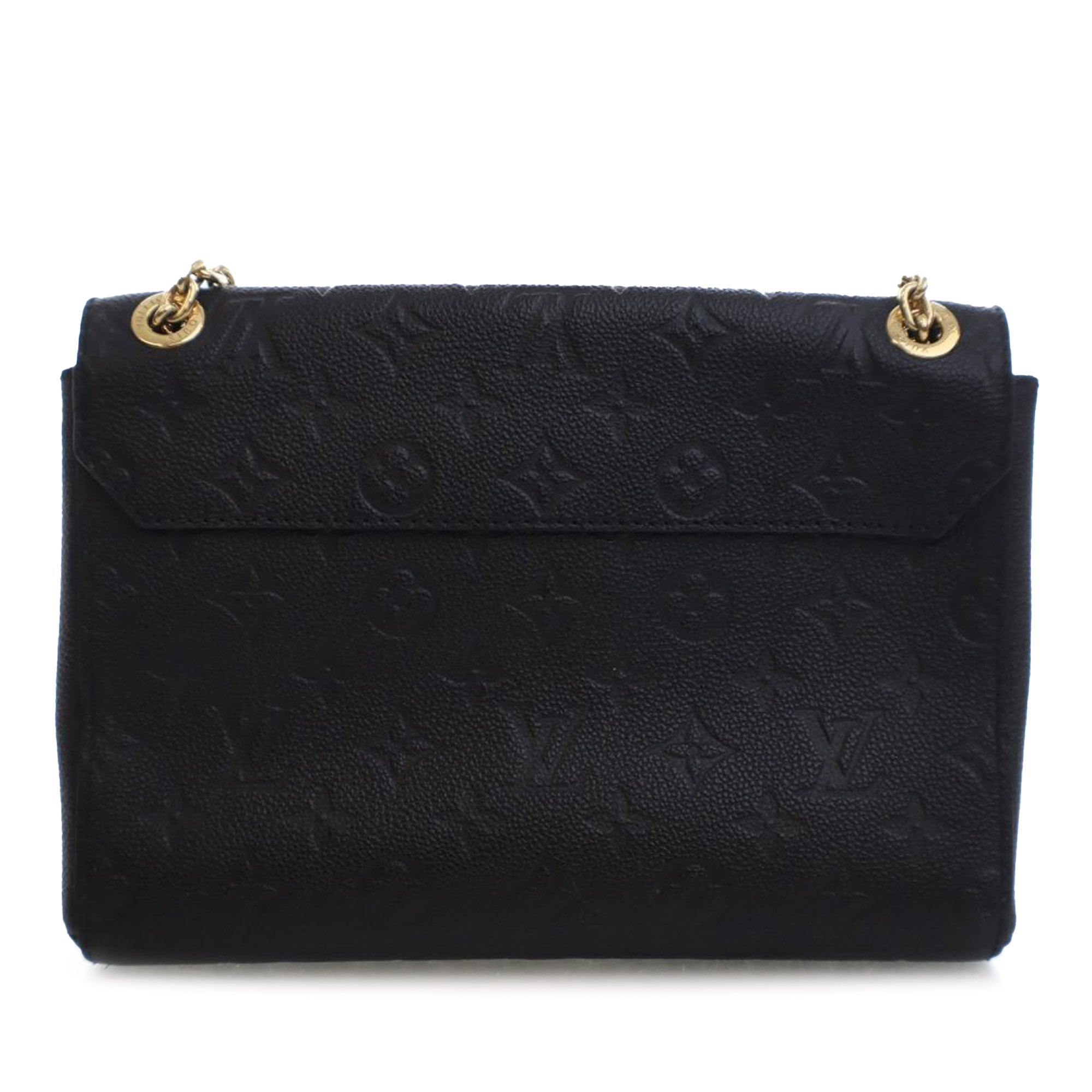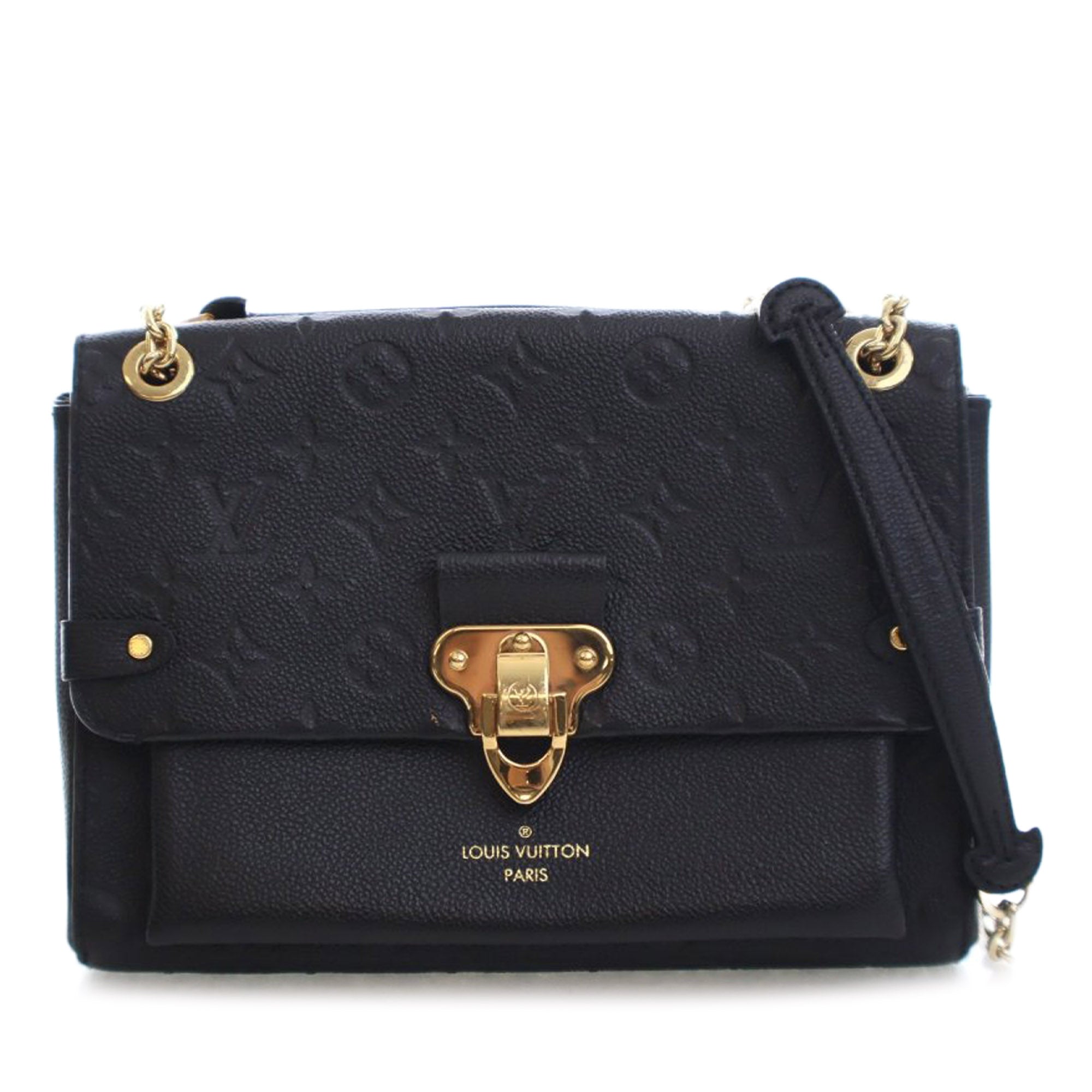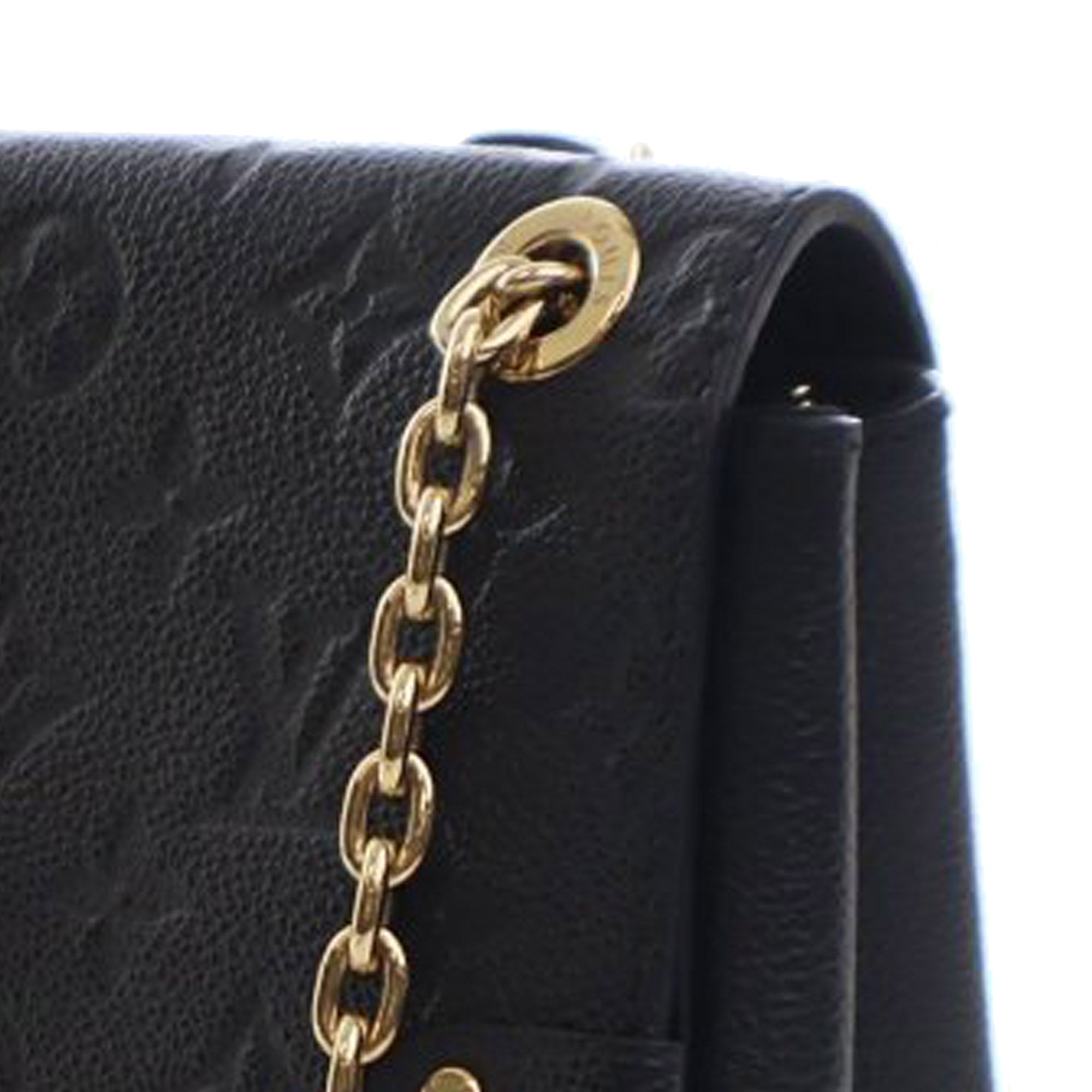 The Vavin PM features a monogram empreinte leather body, a gold-tone curb chain shoulder straps with leather guard, a front flap with flip-lock closure, an exterior front slip pocket under the flap, and an interior zip pocket. Retail Price: 2690.00