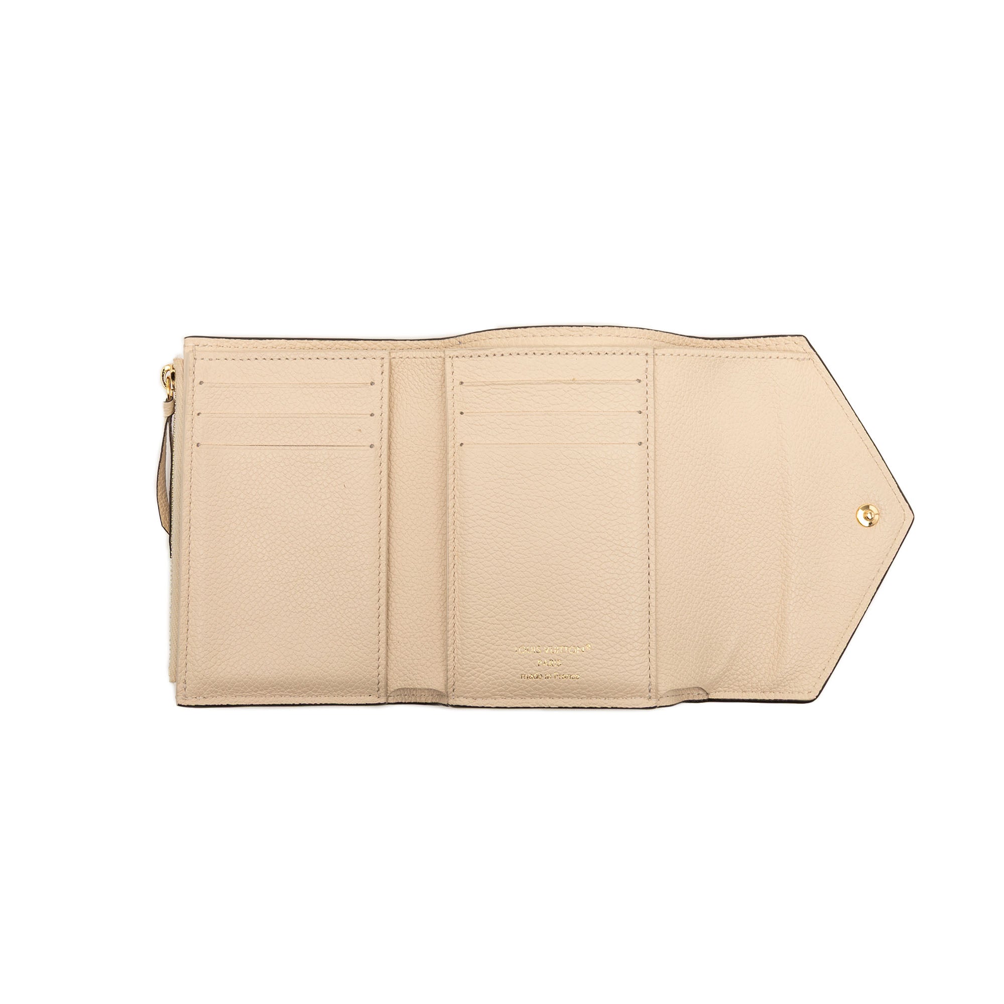 The Victorine wallet features a monogram empreinte leather body, a top flap with a snap button closure, and interior zip and slip pockets. Retail Price: 755.00