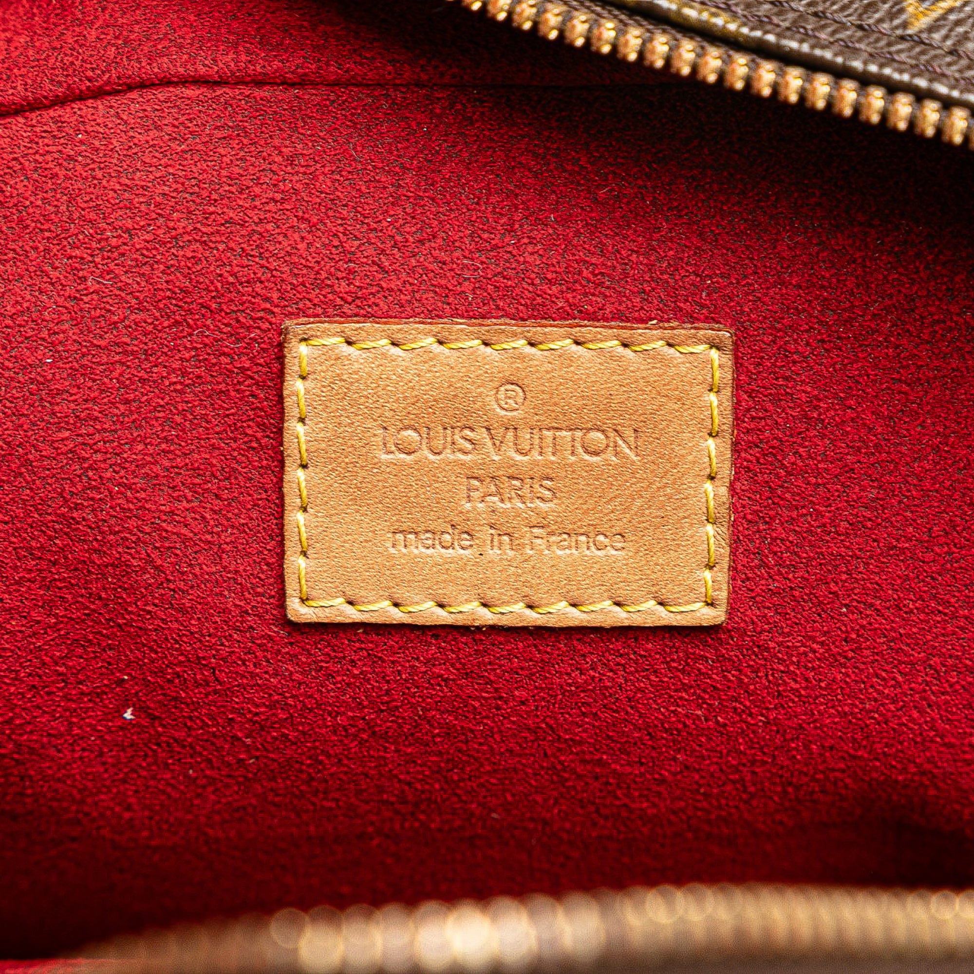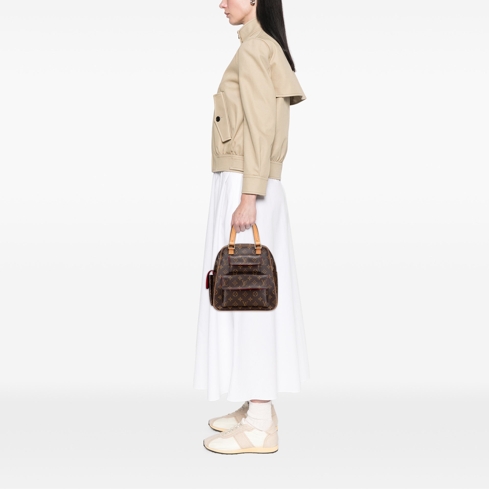 The Excentri-Cite features the monogram canvas body with vachetta leather trim, flat vachetta leather handles, a two-way top zip closure, exterior flap pockets, and an interior slip pocket. Retail Price: 903.00