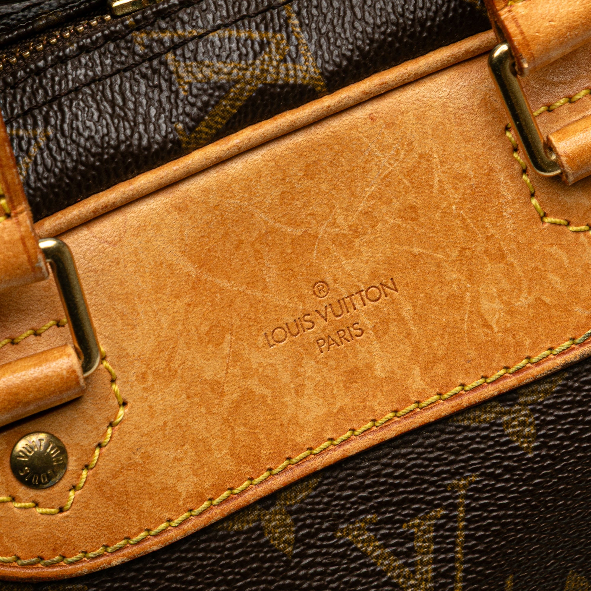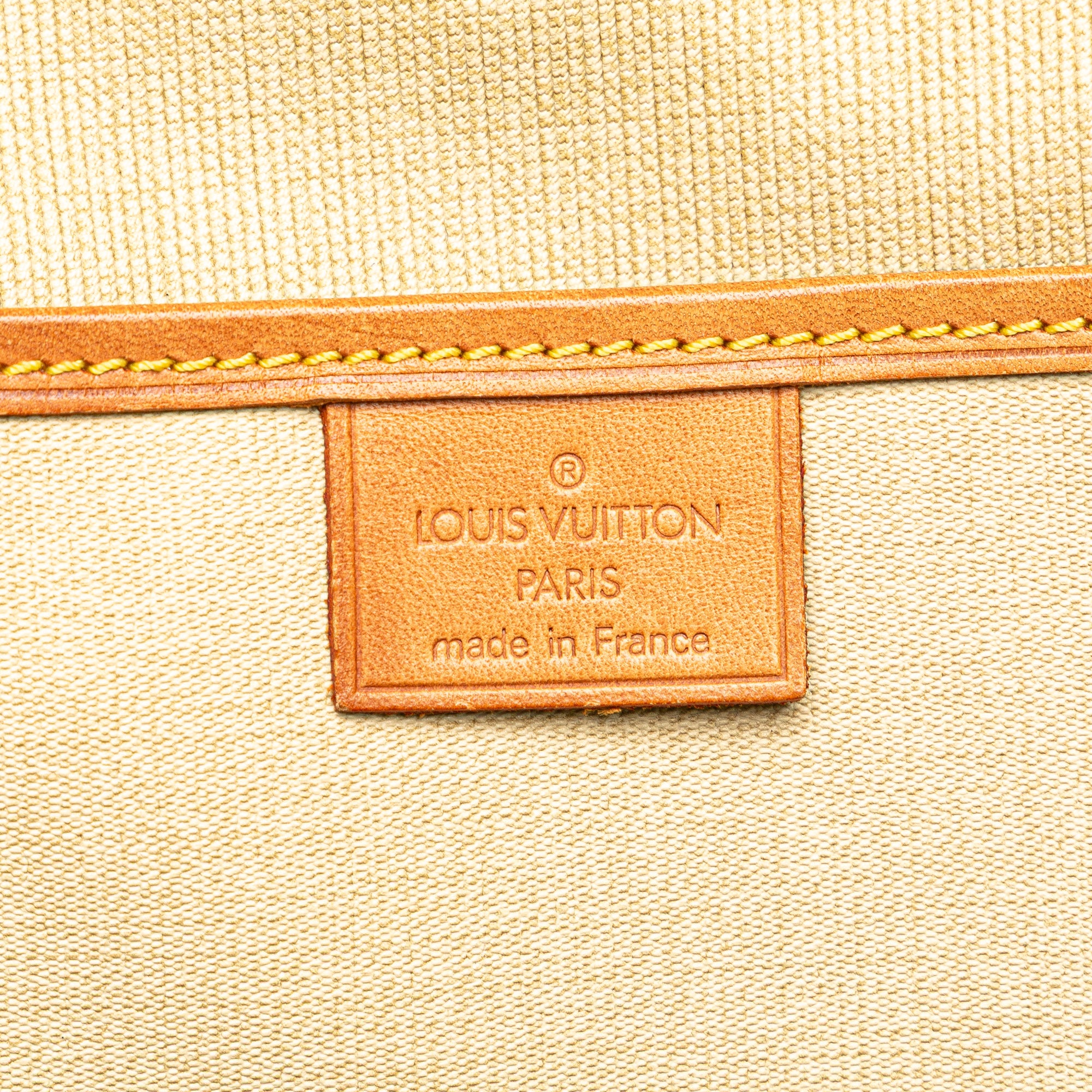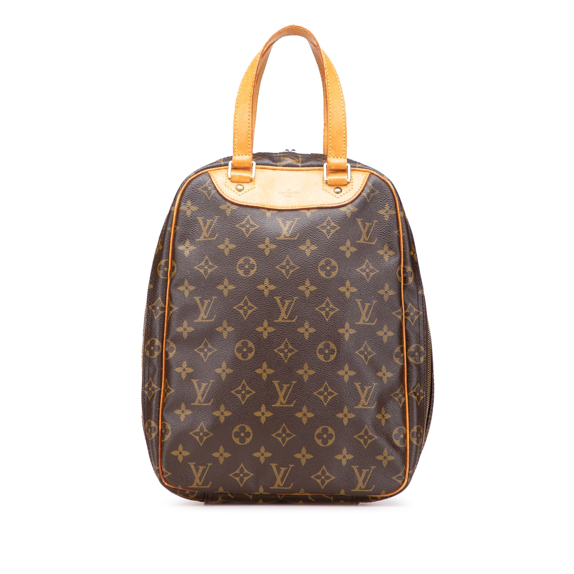 The Excursion features a monogram canvas body with vachetta leather trim, flat vachetta handles, a zip around closure, and an interior slip pocket. Retail Price: 1300.00