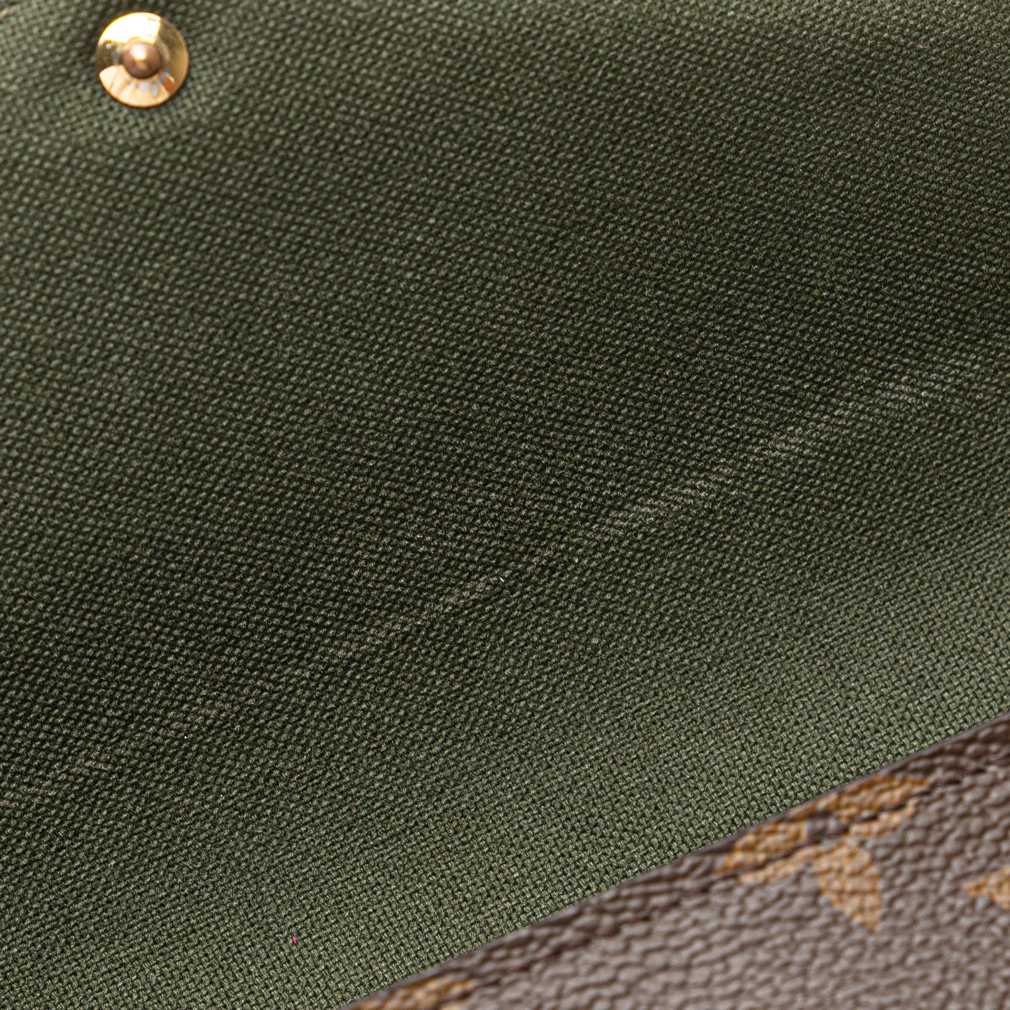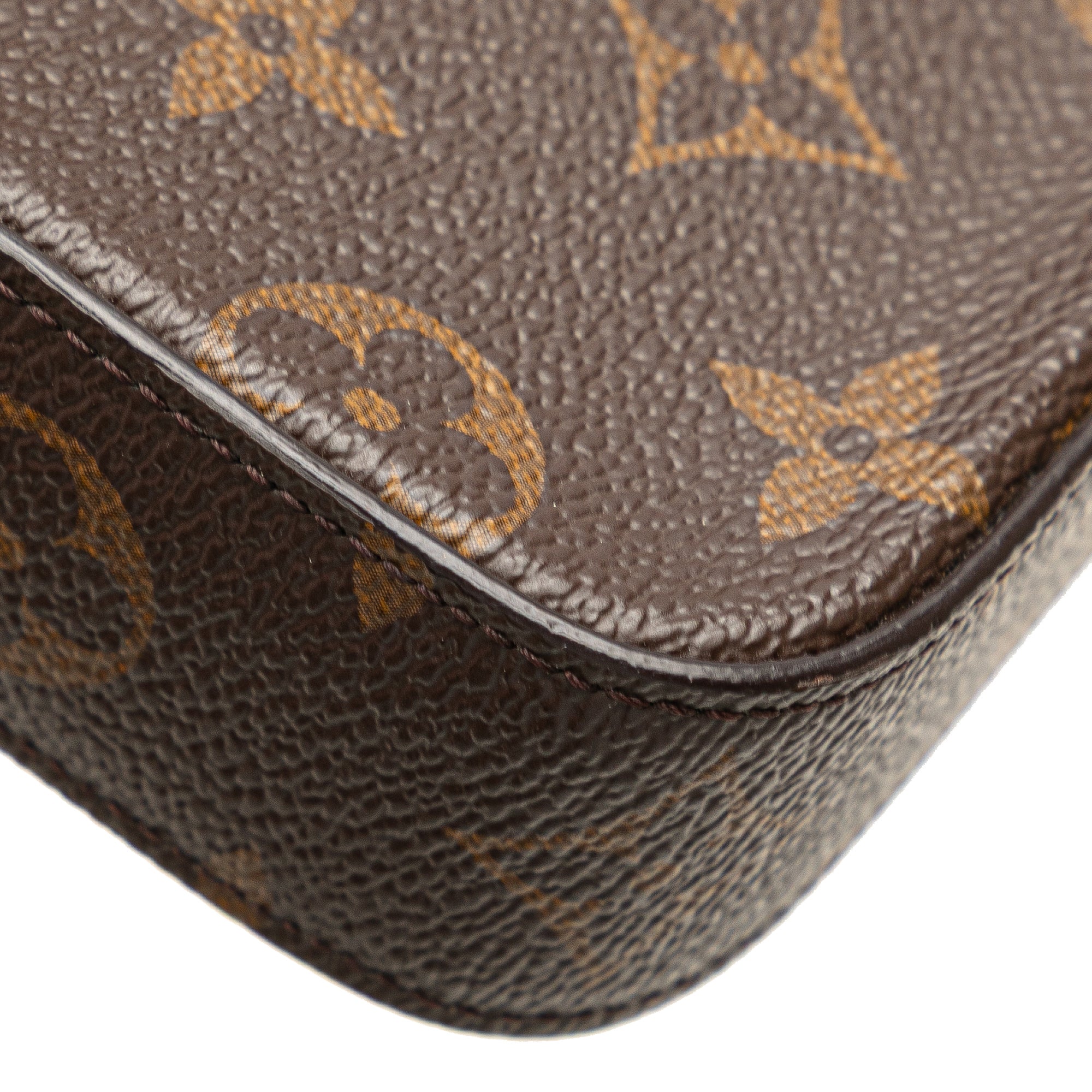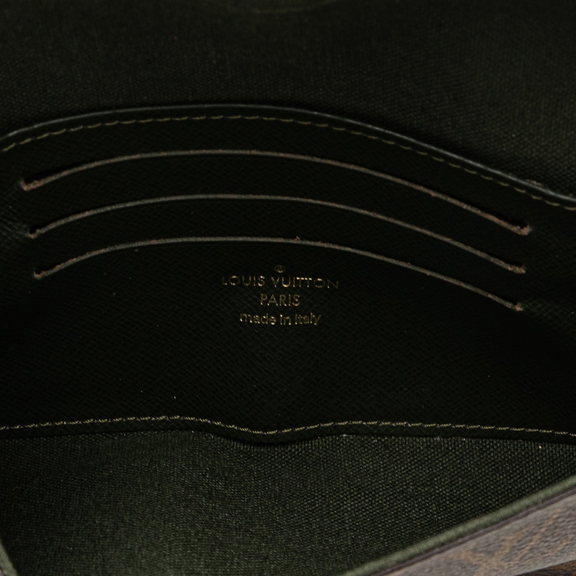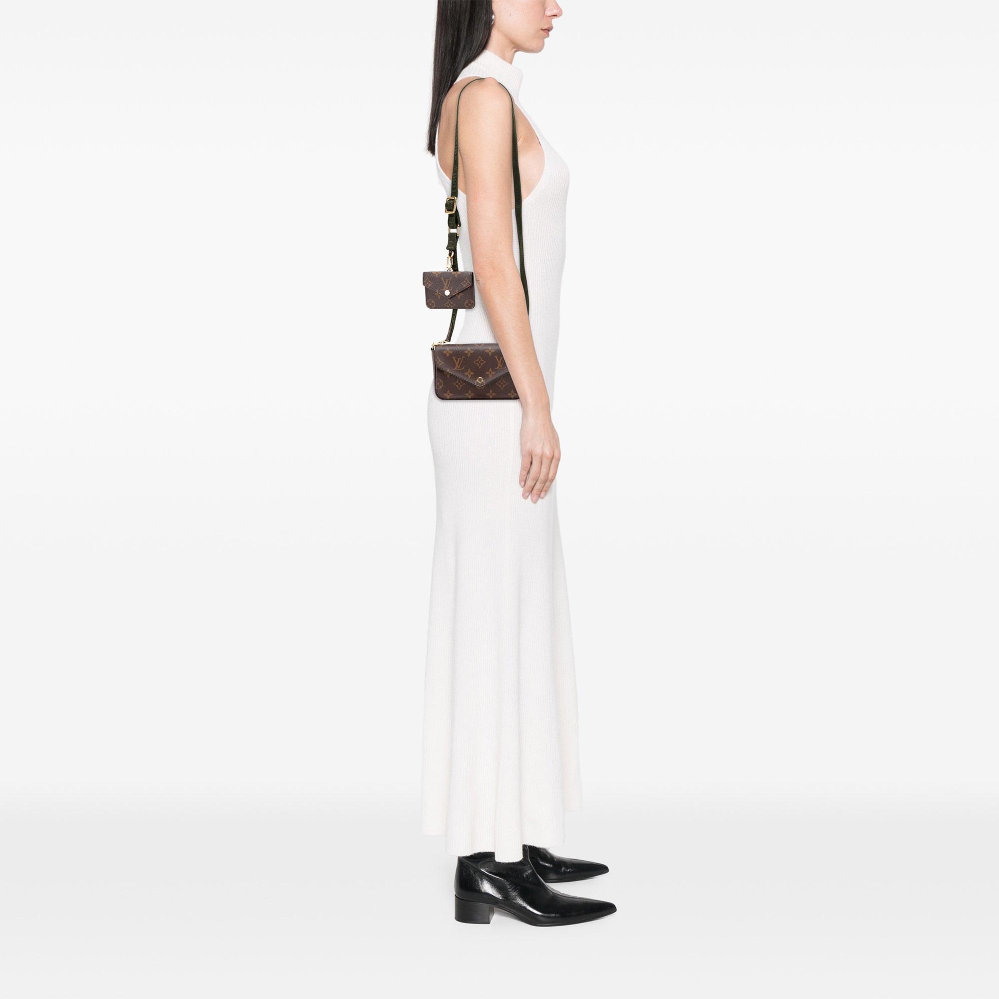 The Felicie Strap and Go features a monogram canvas body, an adjustable and detachable flat strap, a front flap with snap closure, an interior slip pocket, and interior card slots. It comes with a detachable flap pouch with snap closure. Retail Price: 2450.00