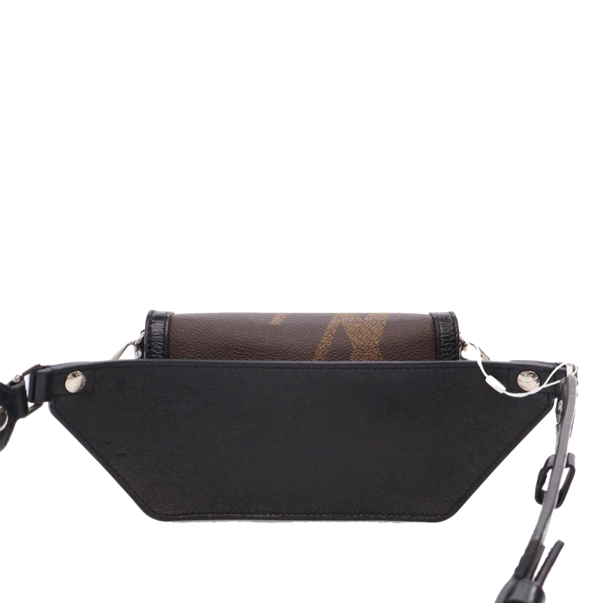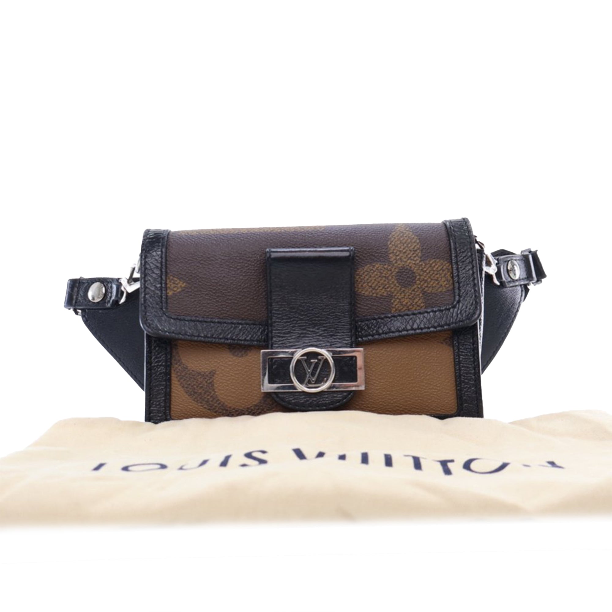 The Dauphine features a monogram and monogram giant reverse canvas body with leather trim, a removable leather belt, a flap with magnetic button closure, a zip compartment and interior slip pockets. Inclusion: Dust bag. Retail Price: 3600.00