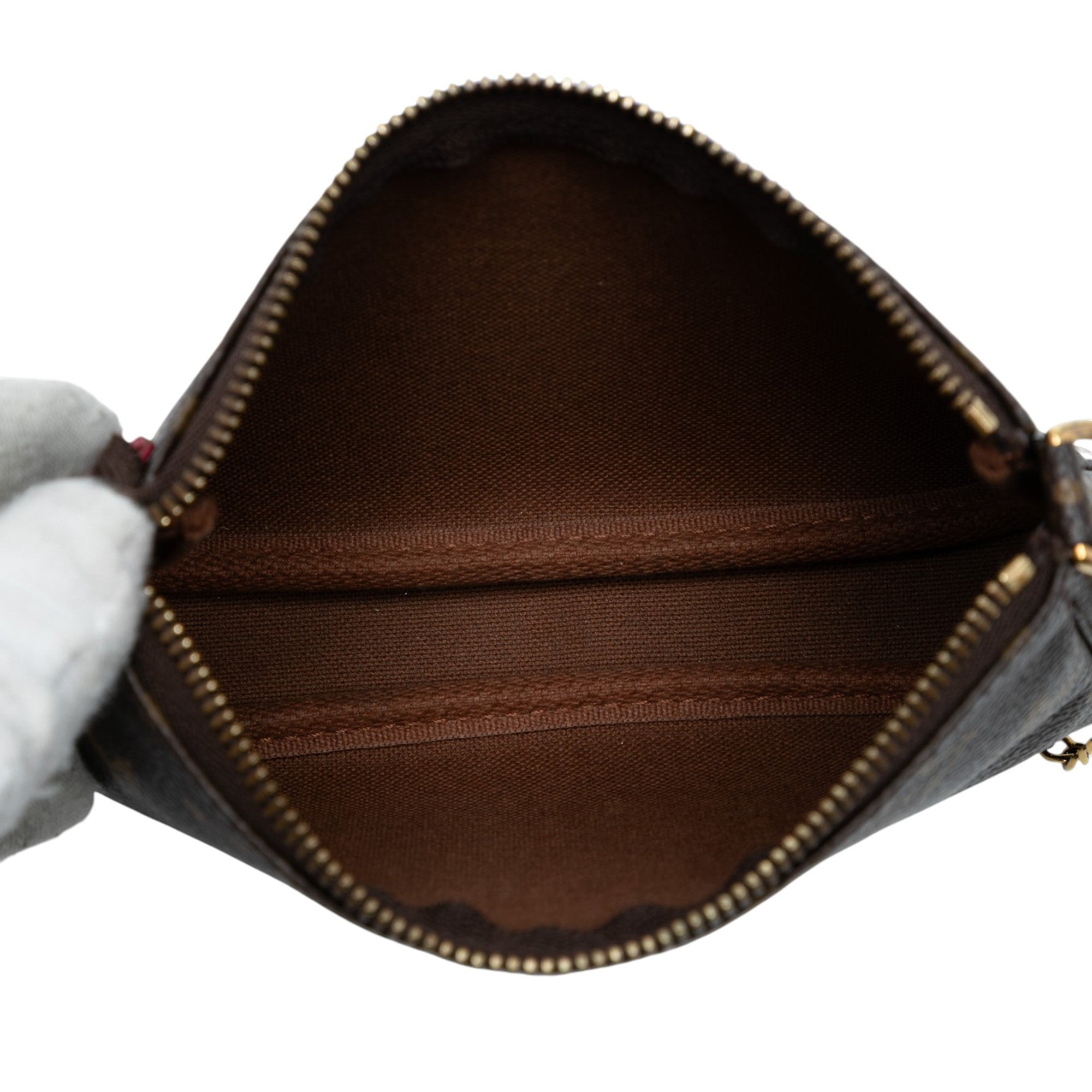 The Mini Pochette Accessoires features a monogram canvas body, a gold-tone chain link handle, and a top zip closure. Retail Price: 630.00