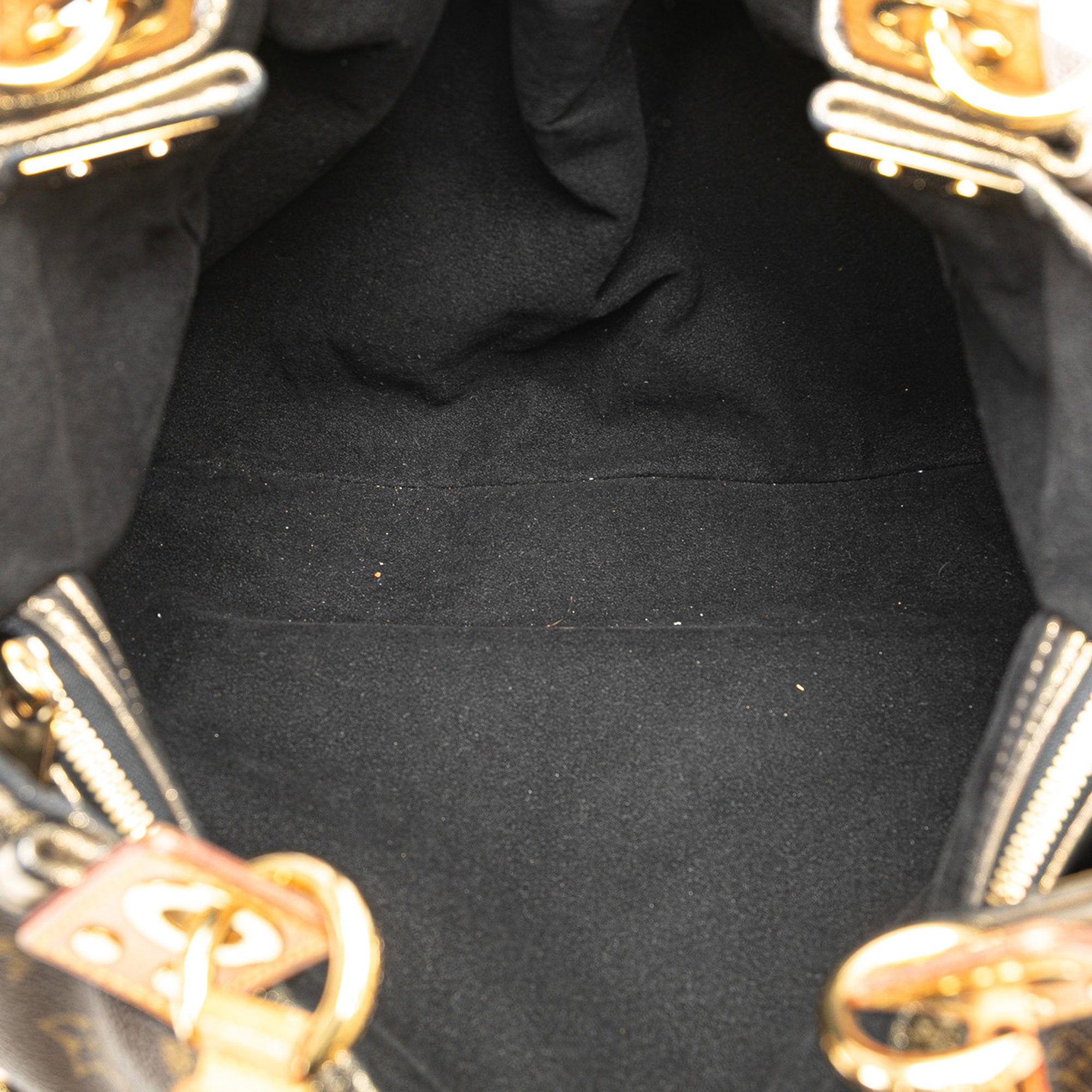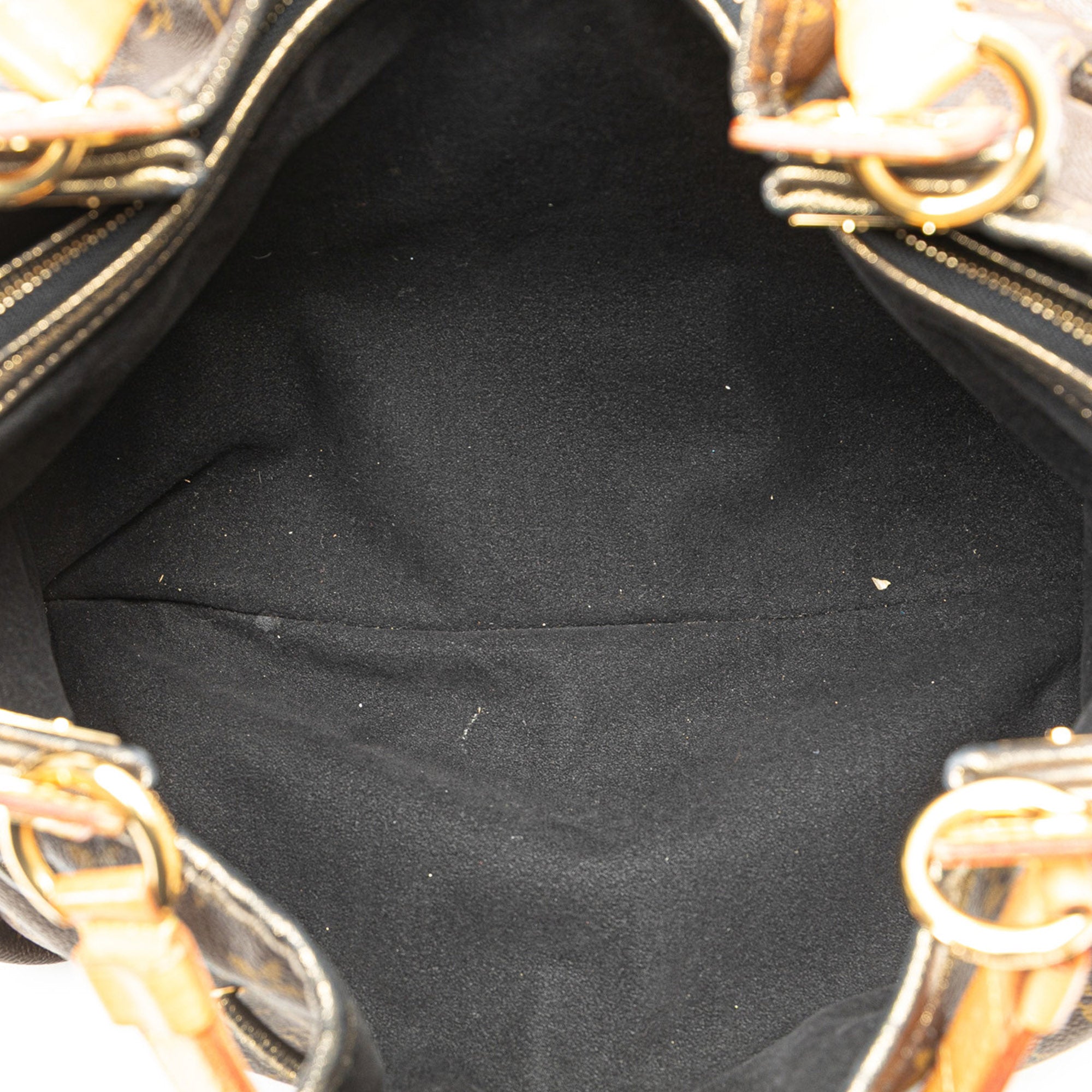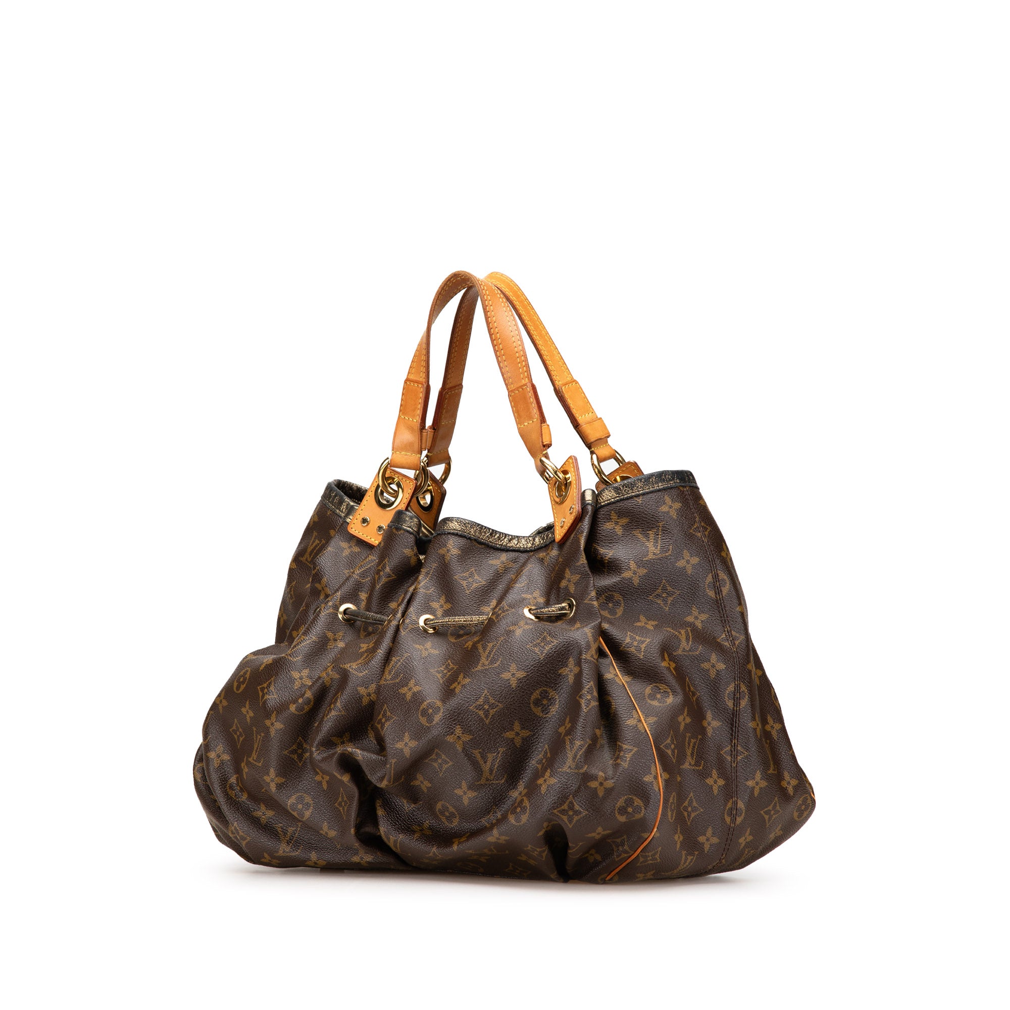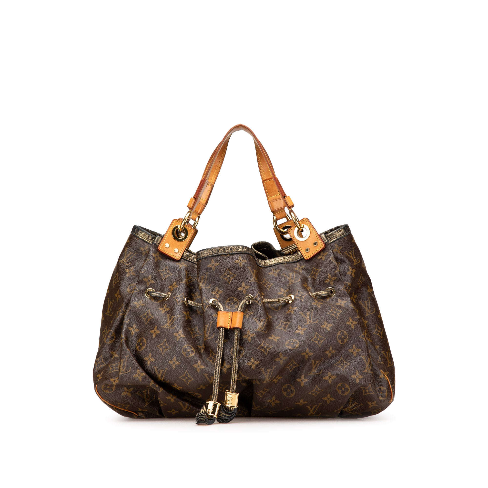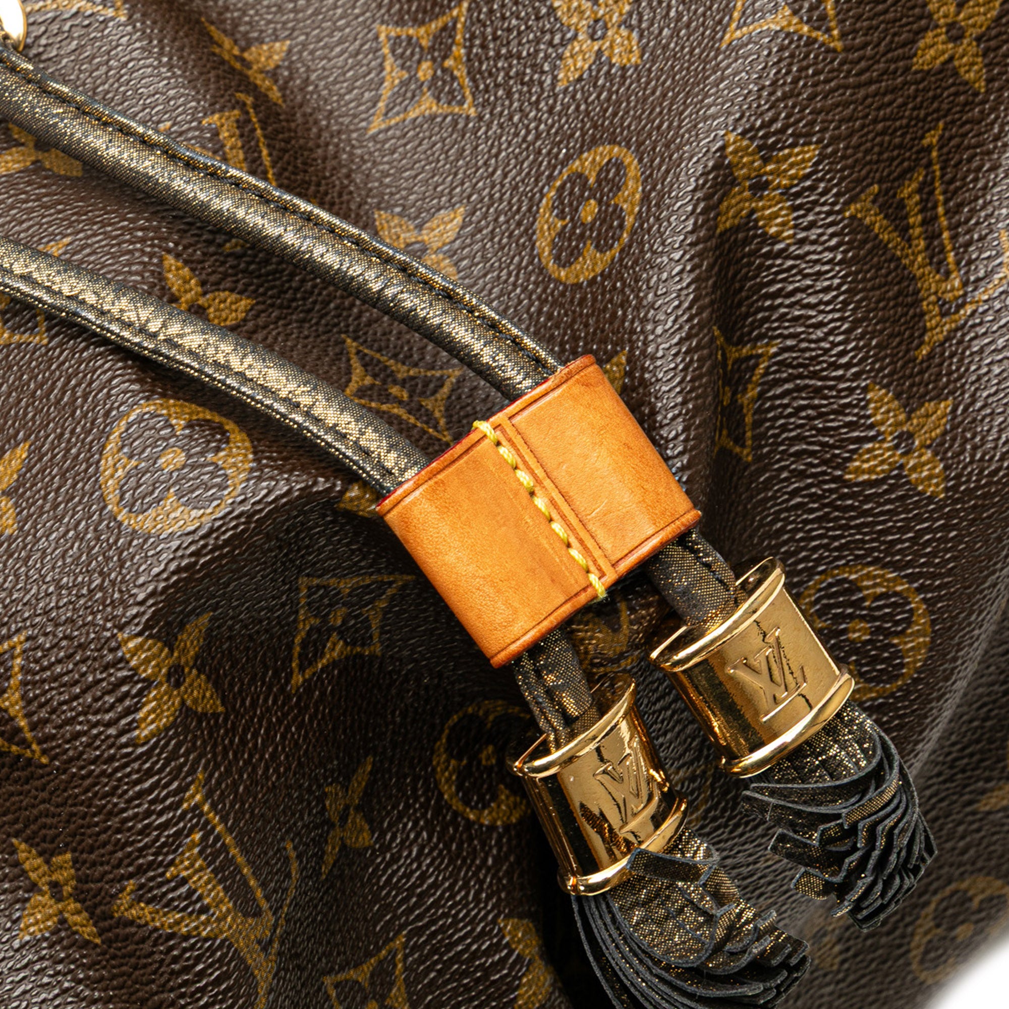 The Irene features a monogram canvas body with leather trim, flat vachetta handles, a drawstring closure, and interior zip and slip pockets. Retail Price: 2640.00