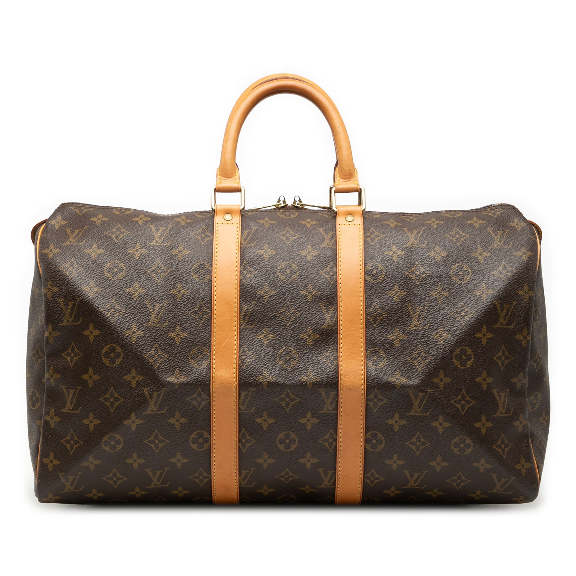 The Keepall 45 features a monogram canvas body with vachetta leather trim, rolled vachetta leather handles, and a top zip closure. Retail Price: 2020.00