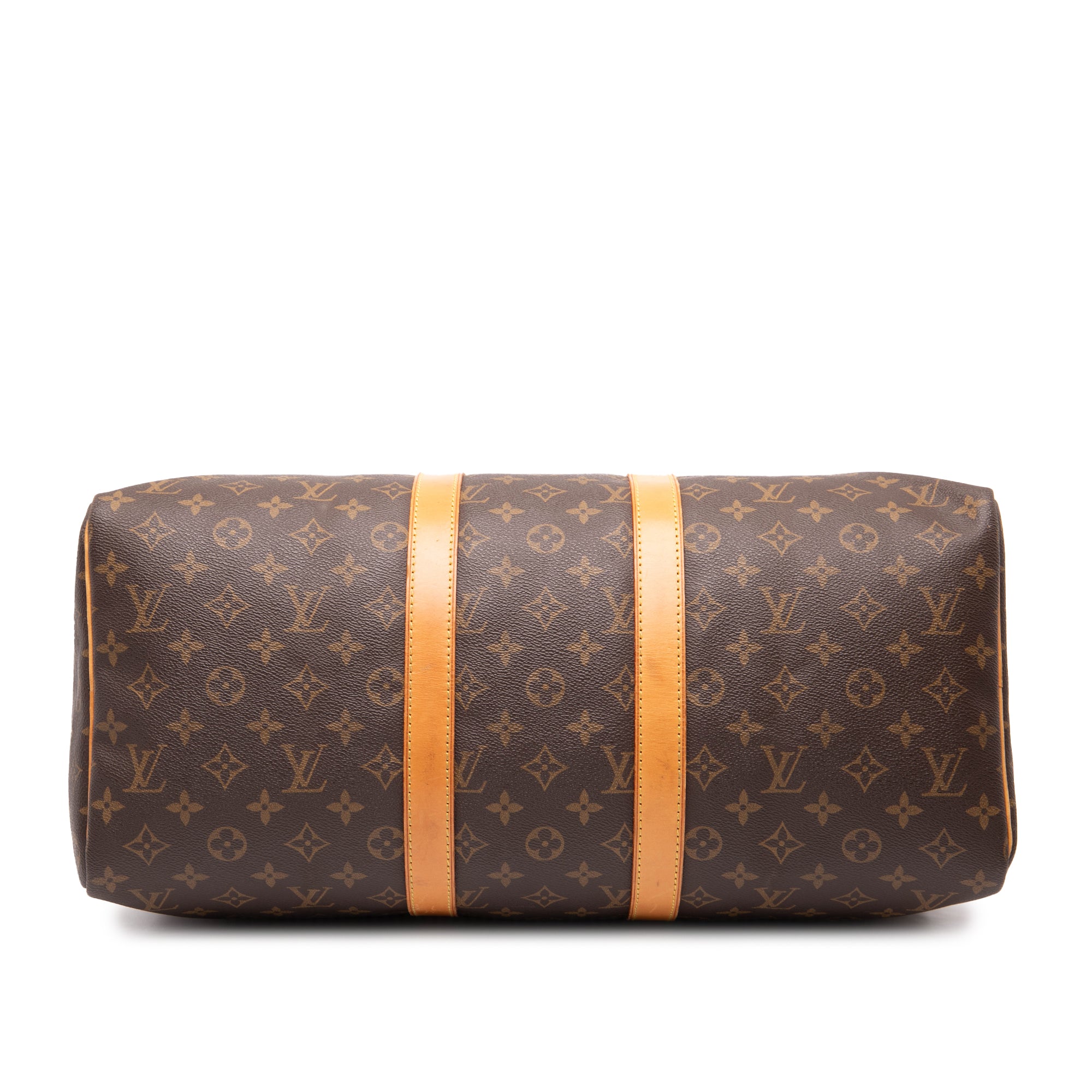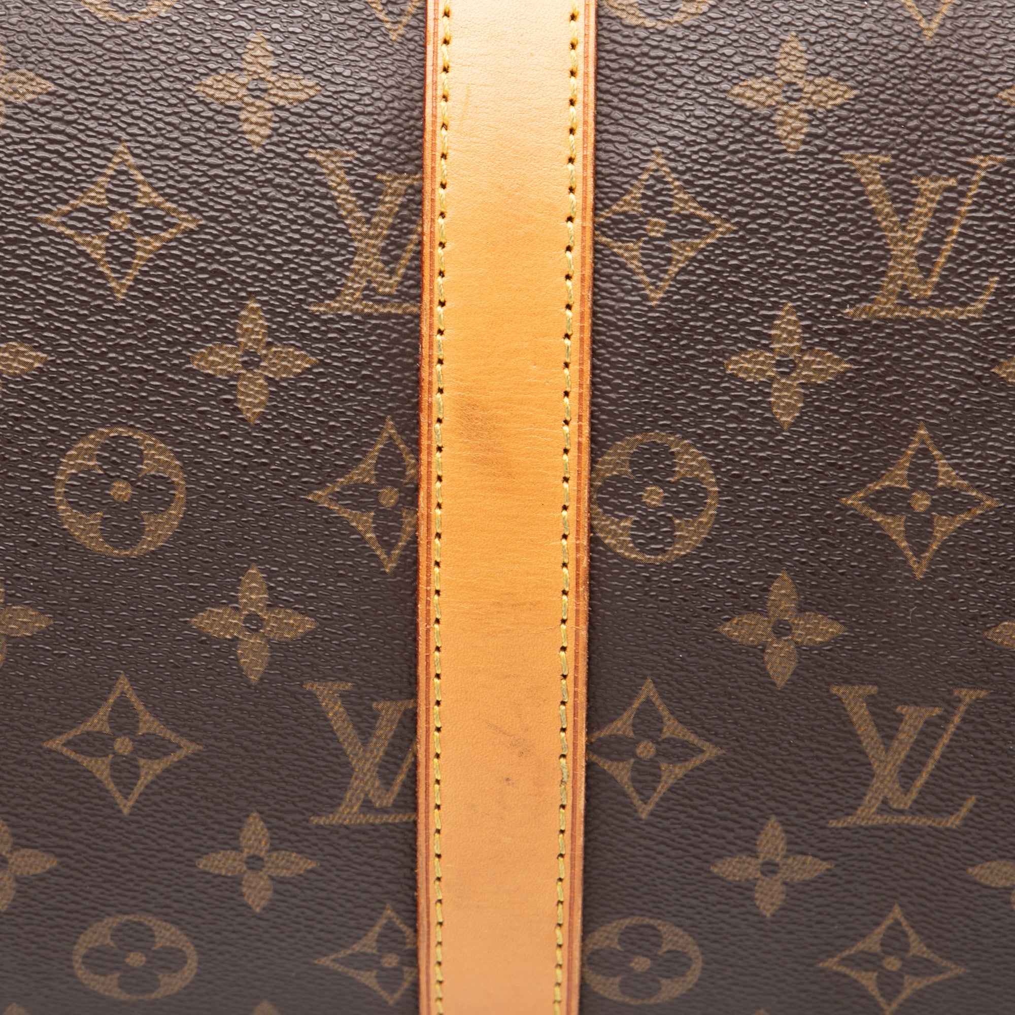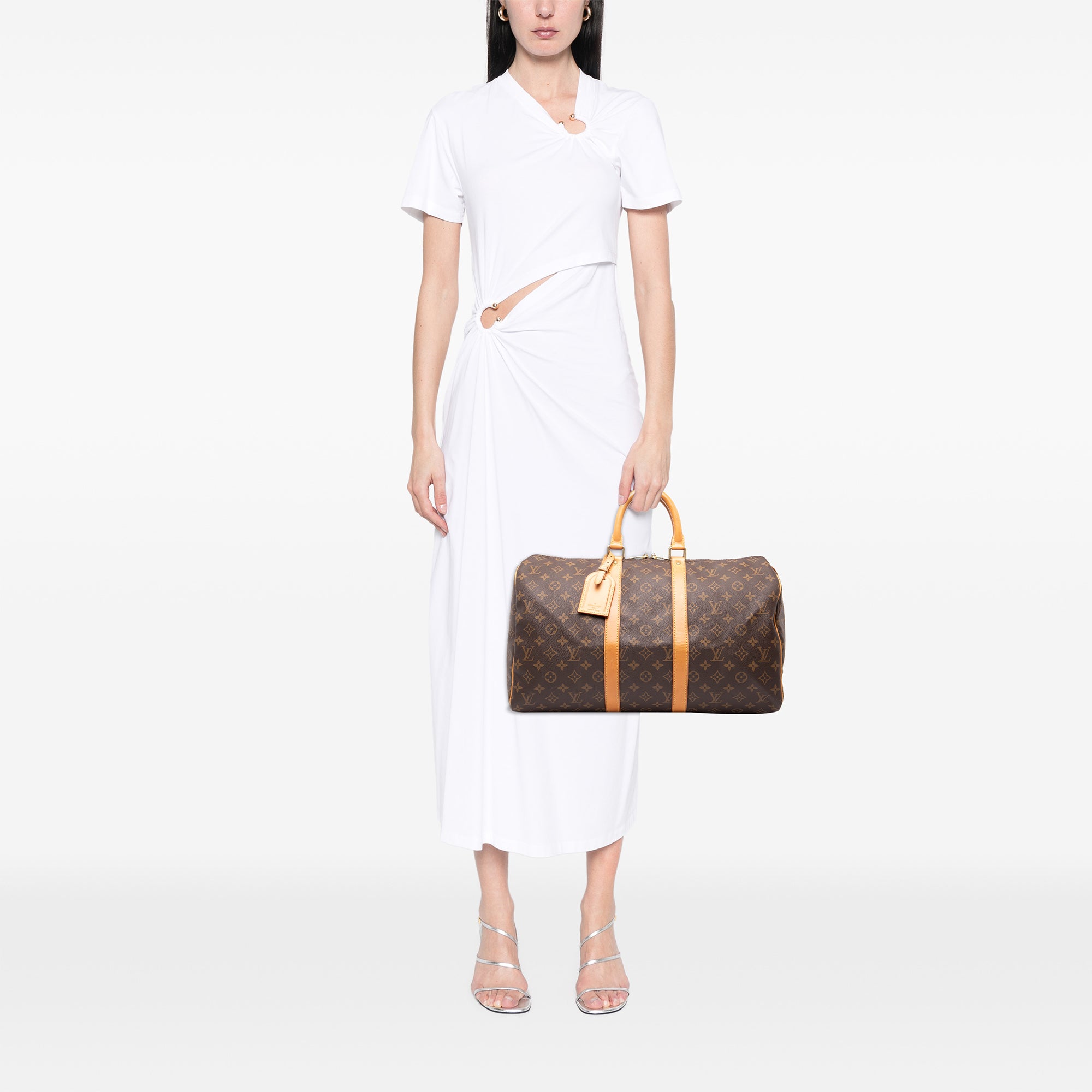 The Keepall 45 features a monogram canvas body with vachetta leather trim, rolled vachetta leather handles, and a top zip closure. Retail Price: 2020.00