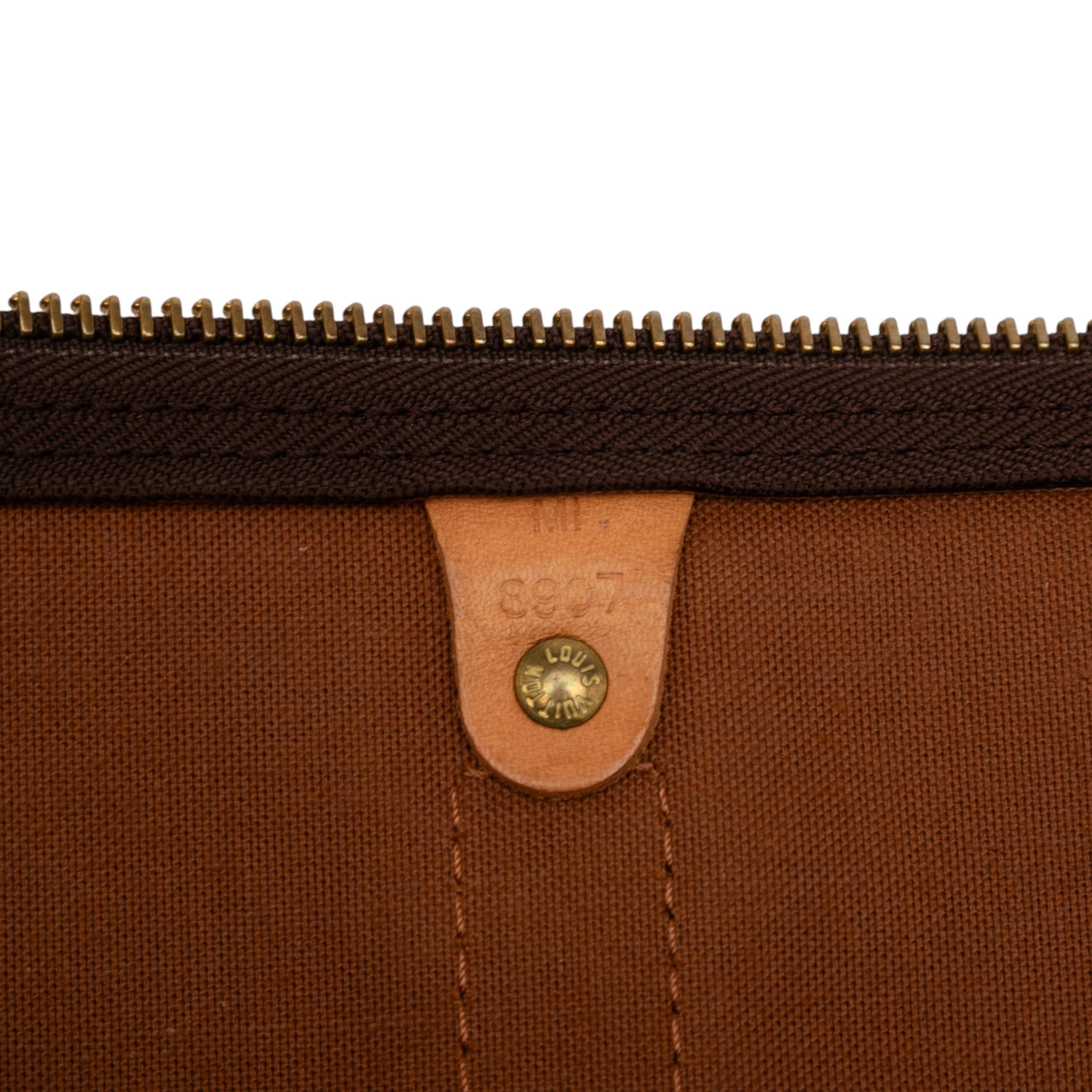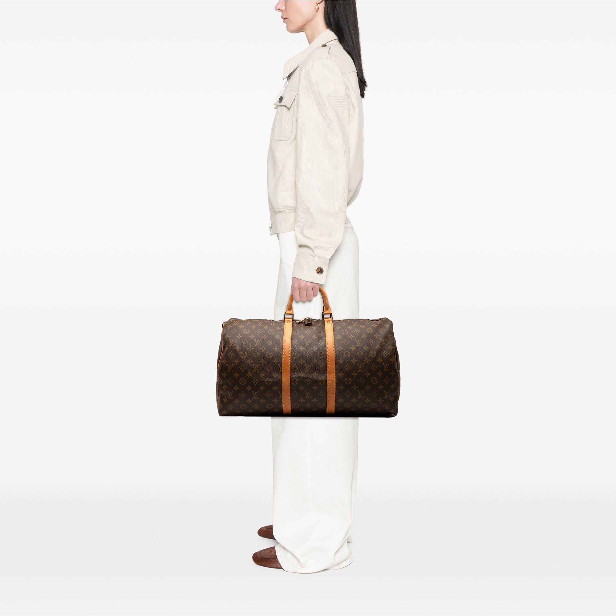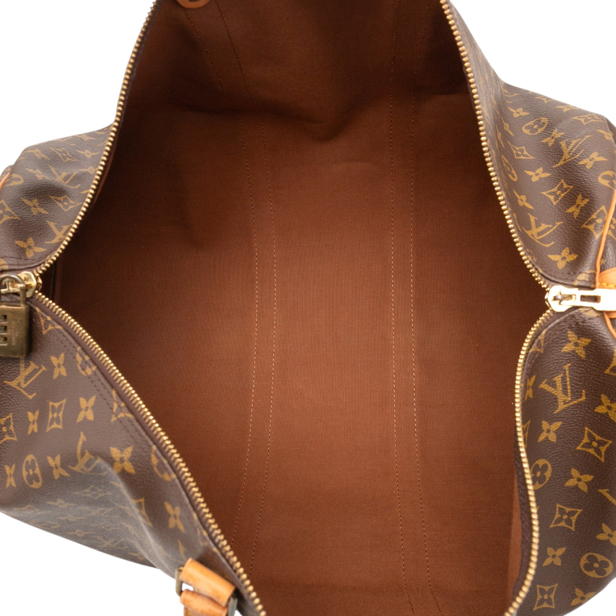 The Keepall 55 features a monogram canvas body with vachetta leather trim, rolled vachetta leather handles and a top zip closure. Retail Price: 1864.00