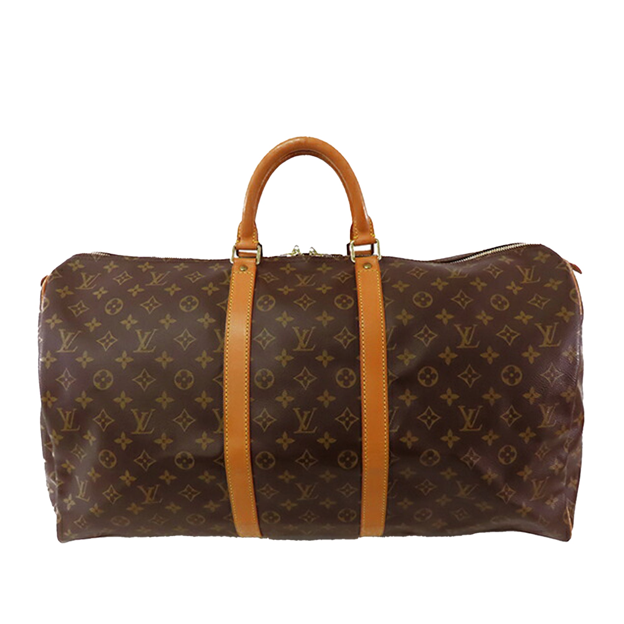 The Keepall 55 features a monogram canvas body with vachetta leather trim, rolled vachetta leather handles, and a top zip closure. Retail Price: 1903.00