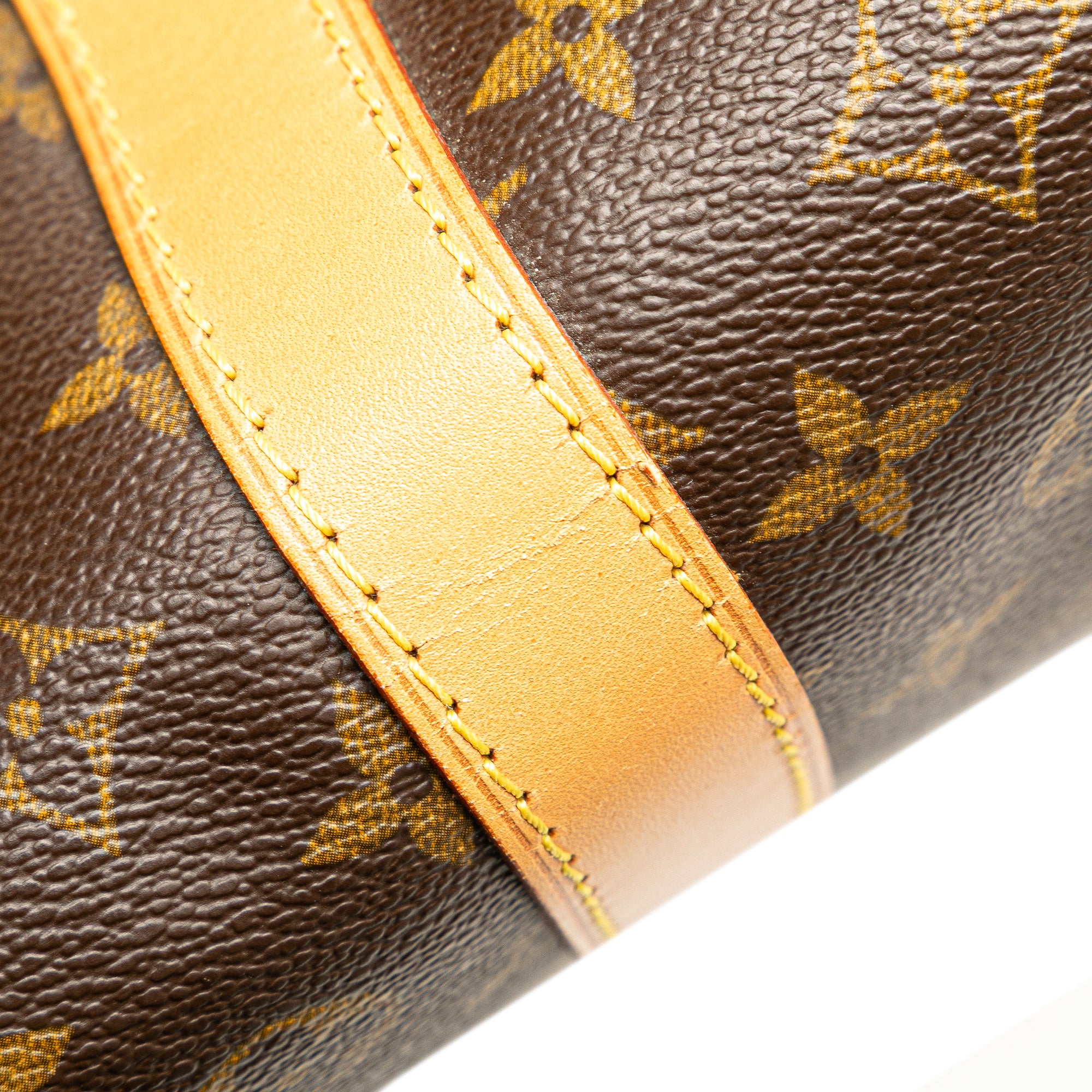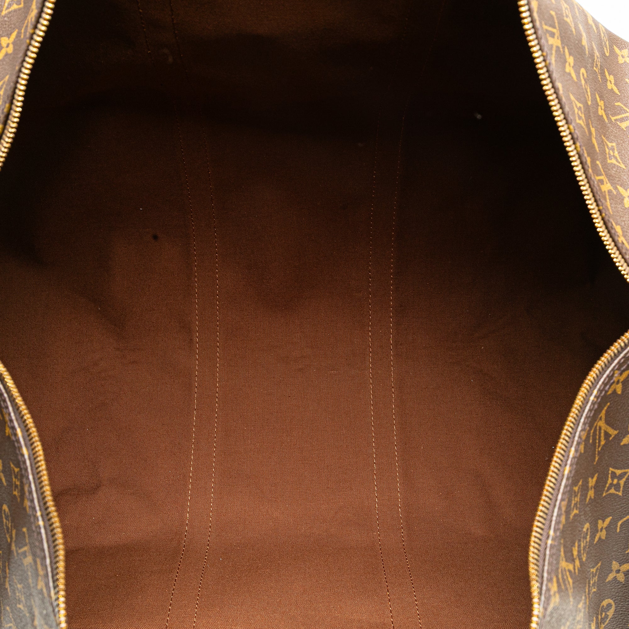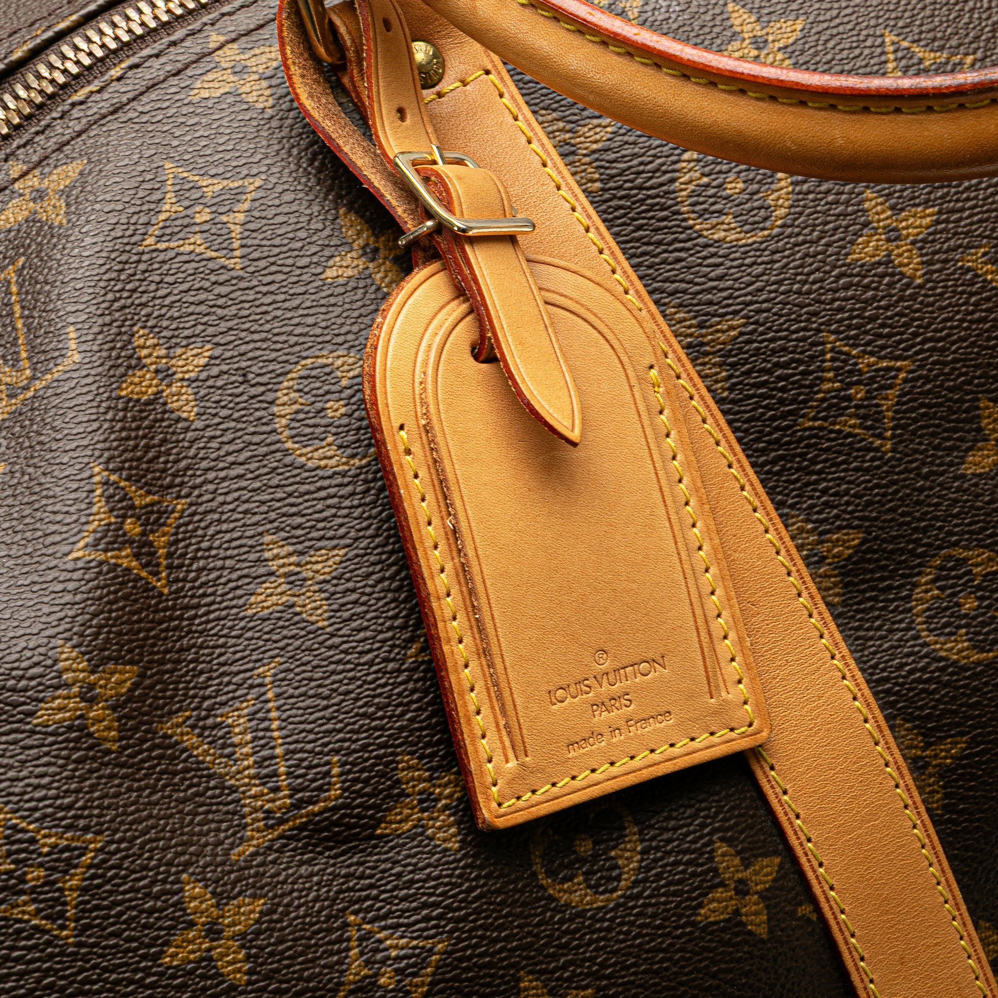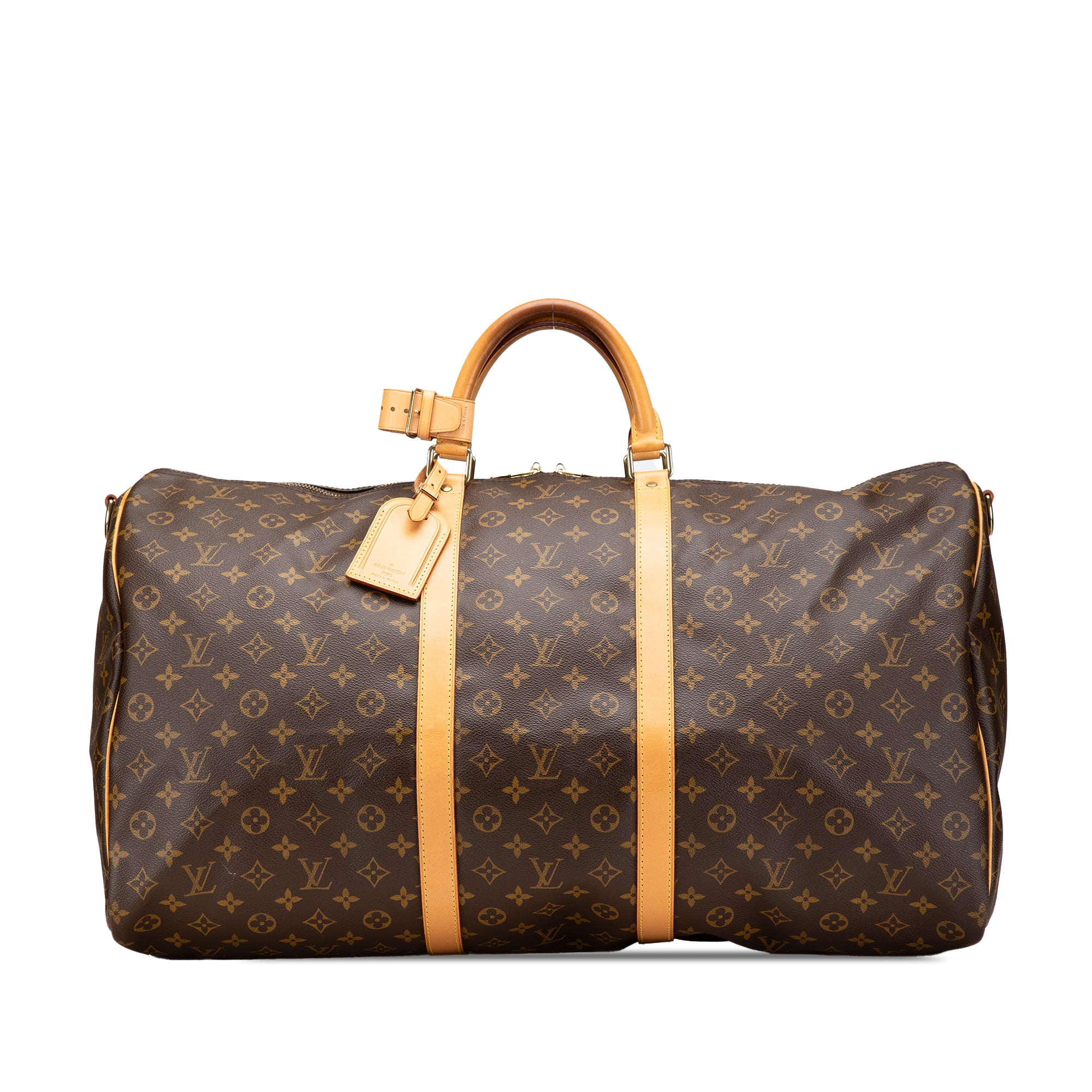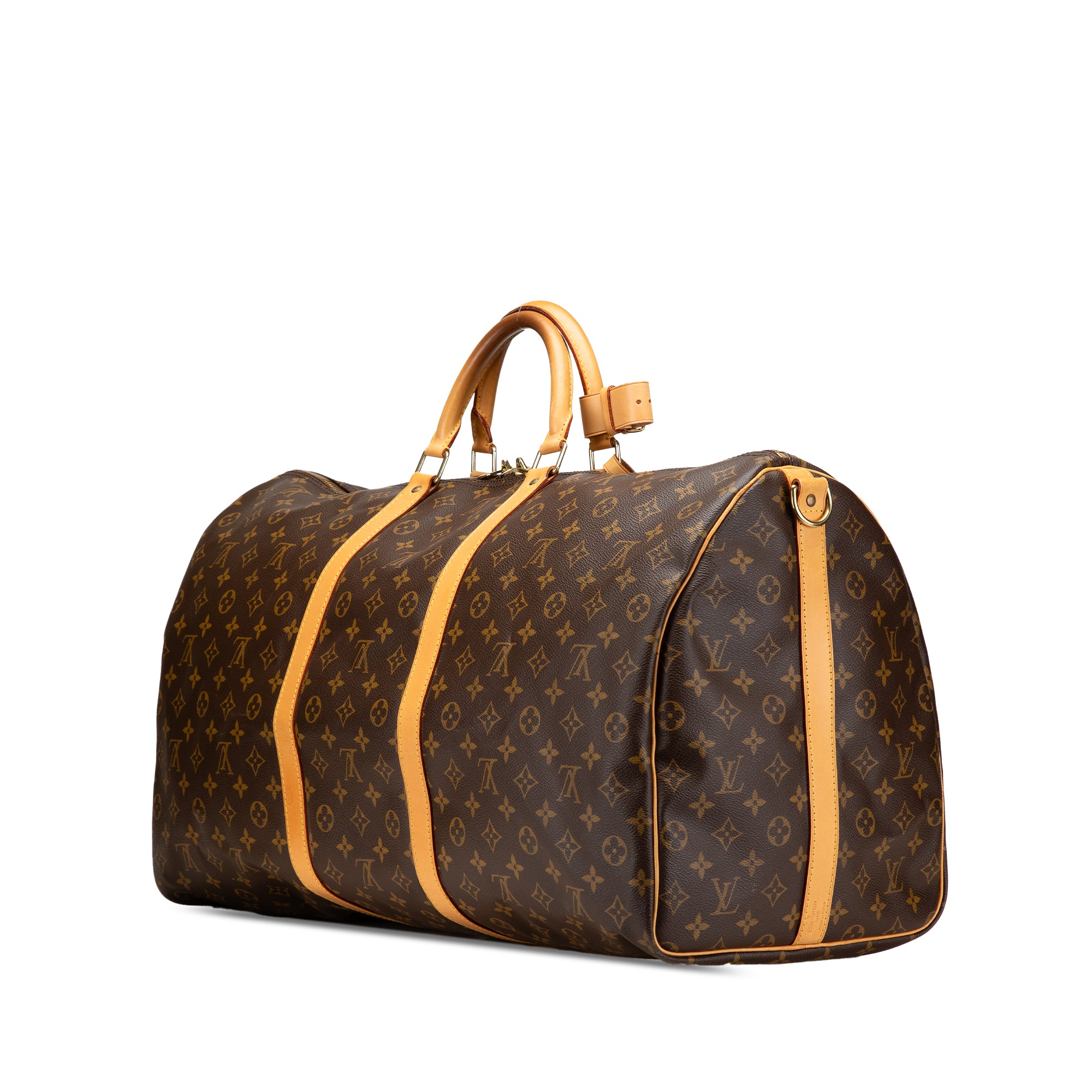 The Keepall 60 features a monogram canvas body with vachetta leather trim, rolled vachetta leather handles, and a top zip closure. Retail Price: 1968.00