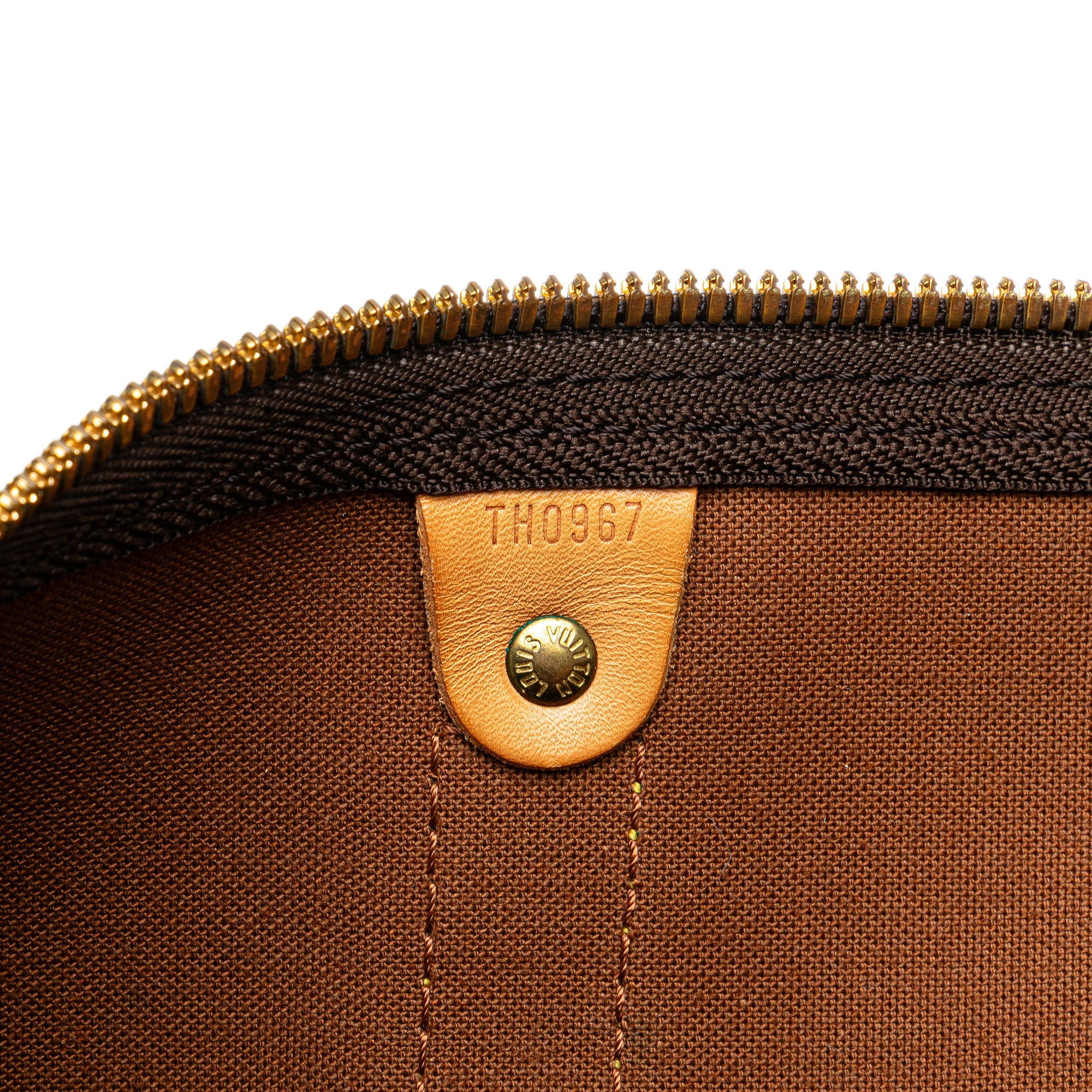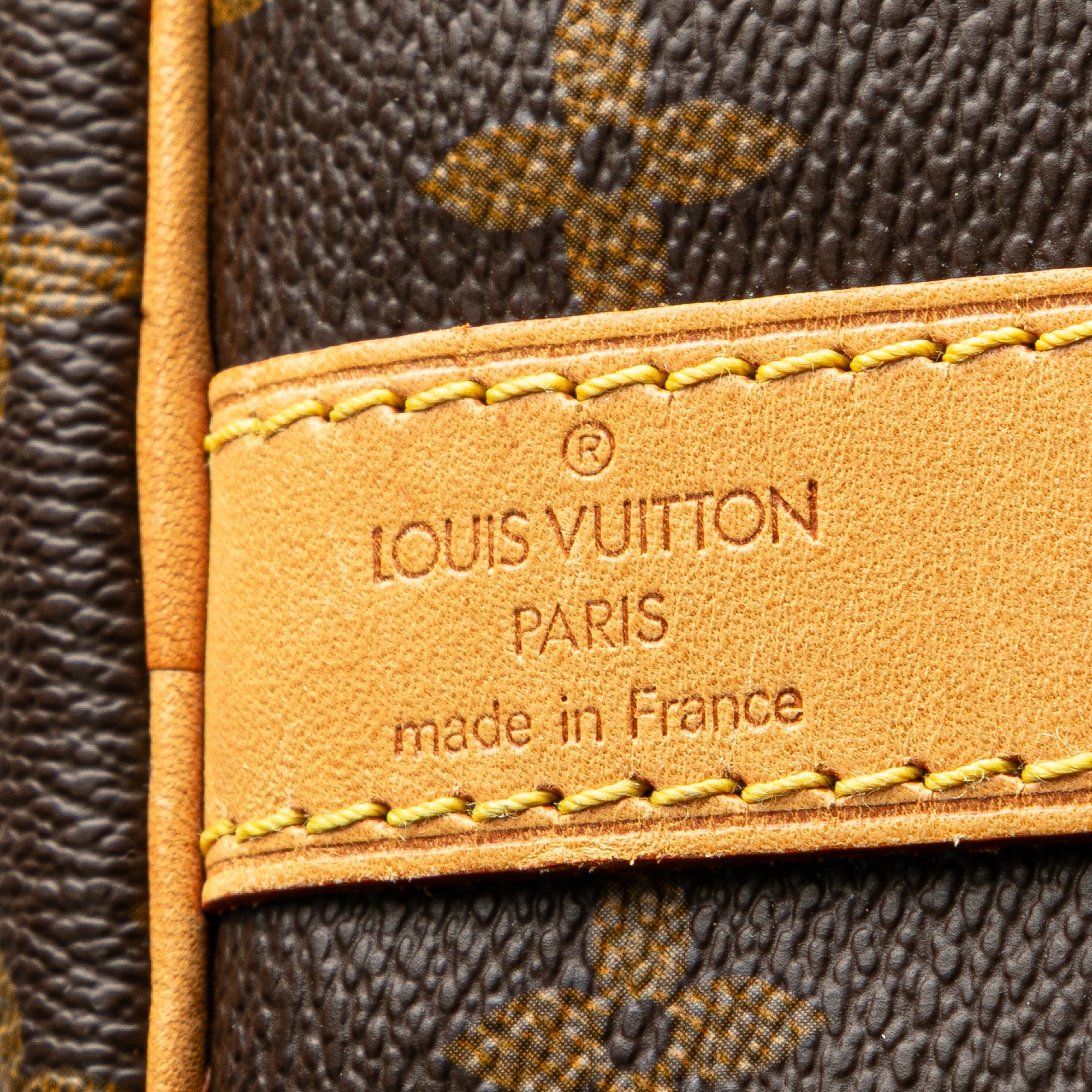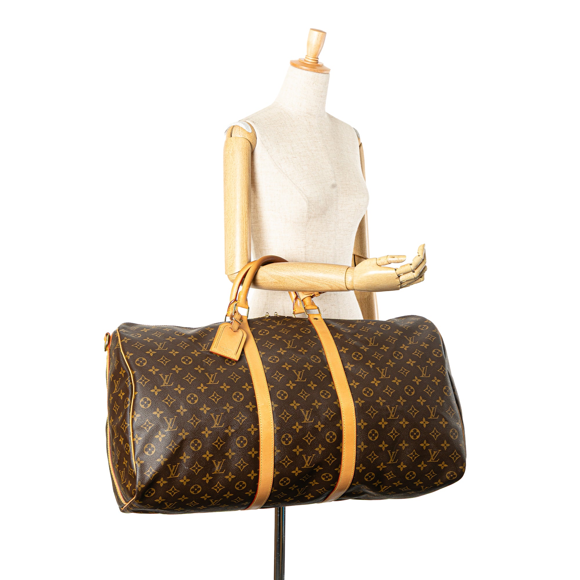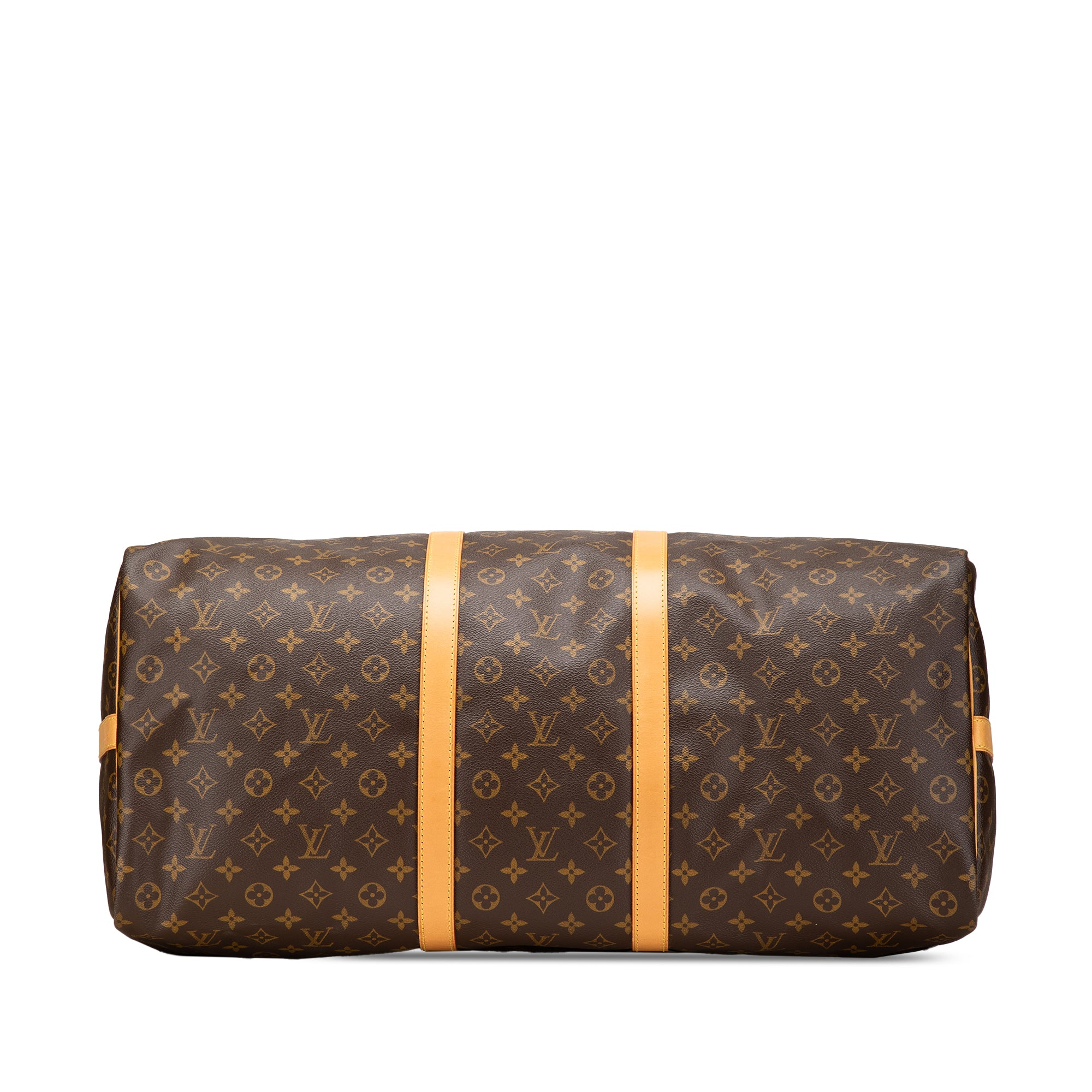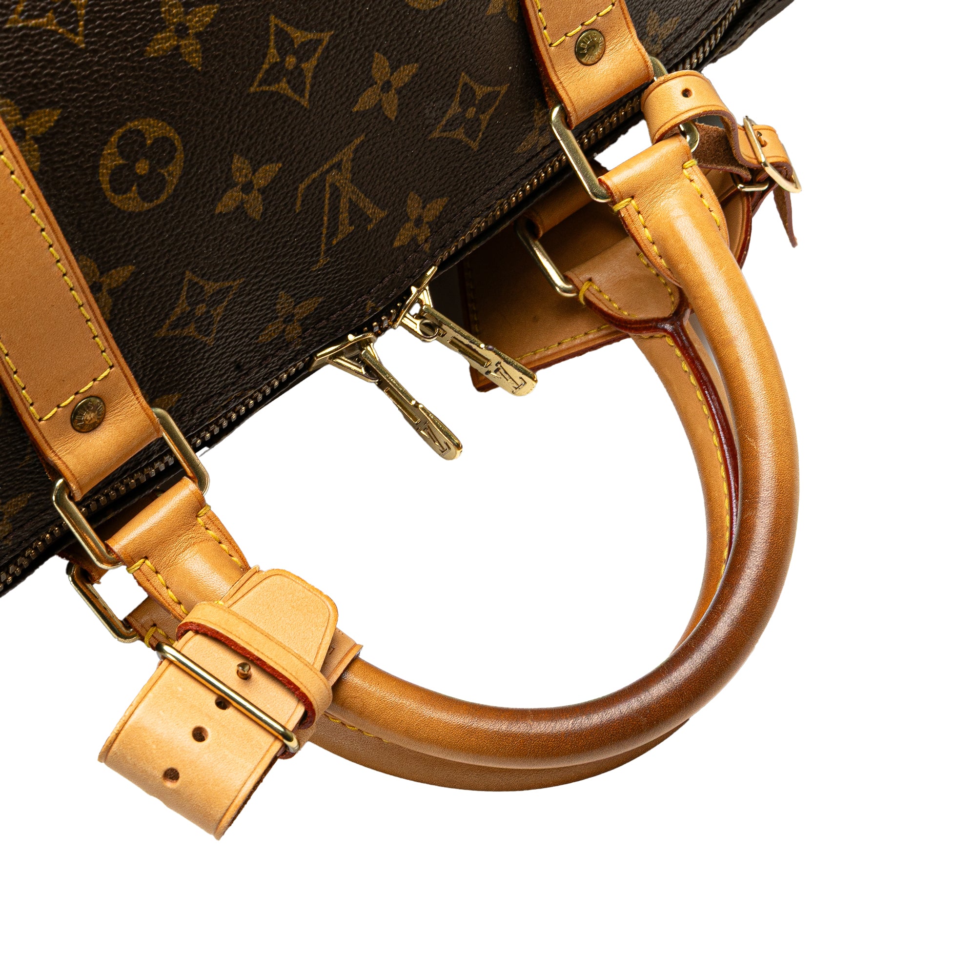 The Keepall 60 features a monogram canvas body with vachetta leather trim, rolled vachetta leather handles, and a top zip closure. Retail Price: 1968.00