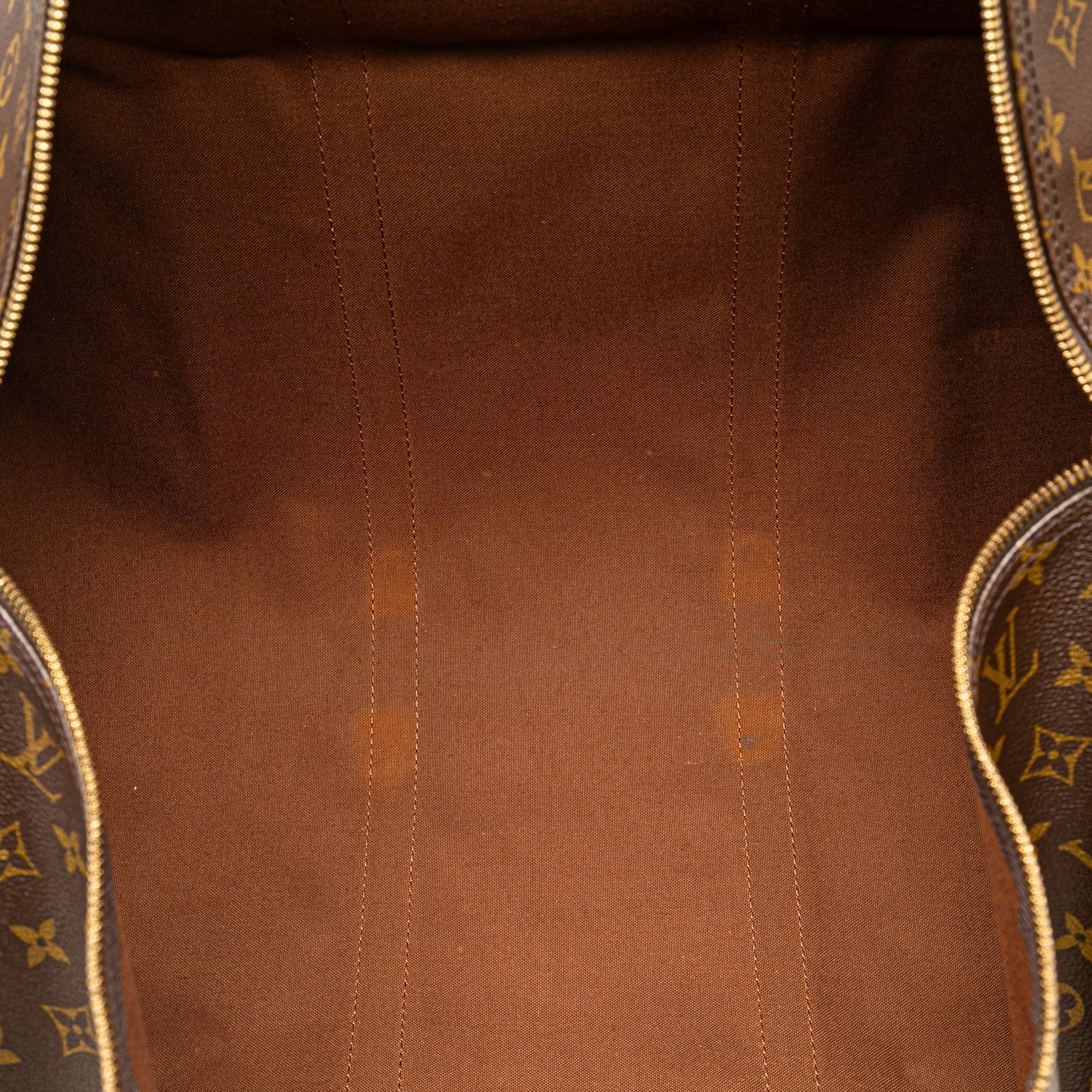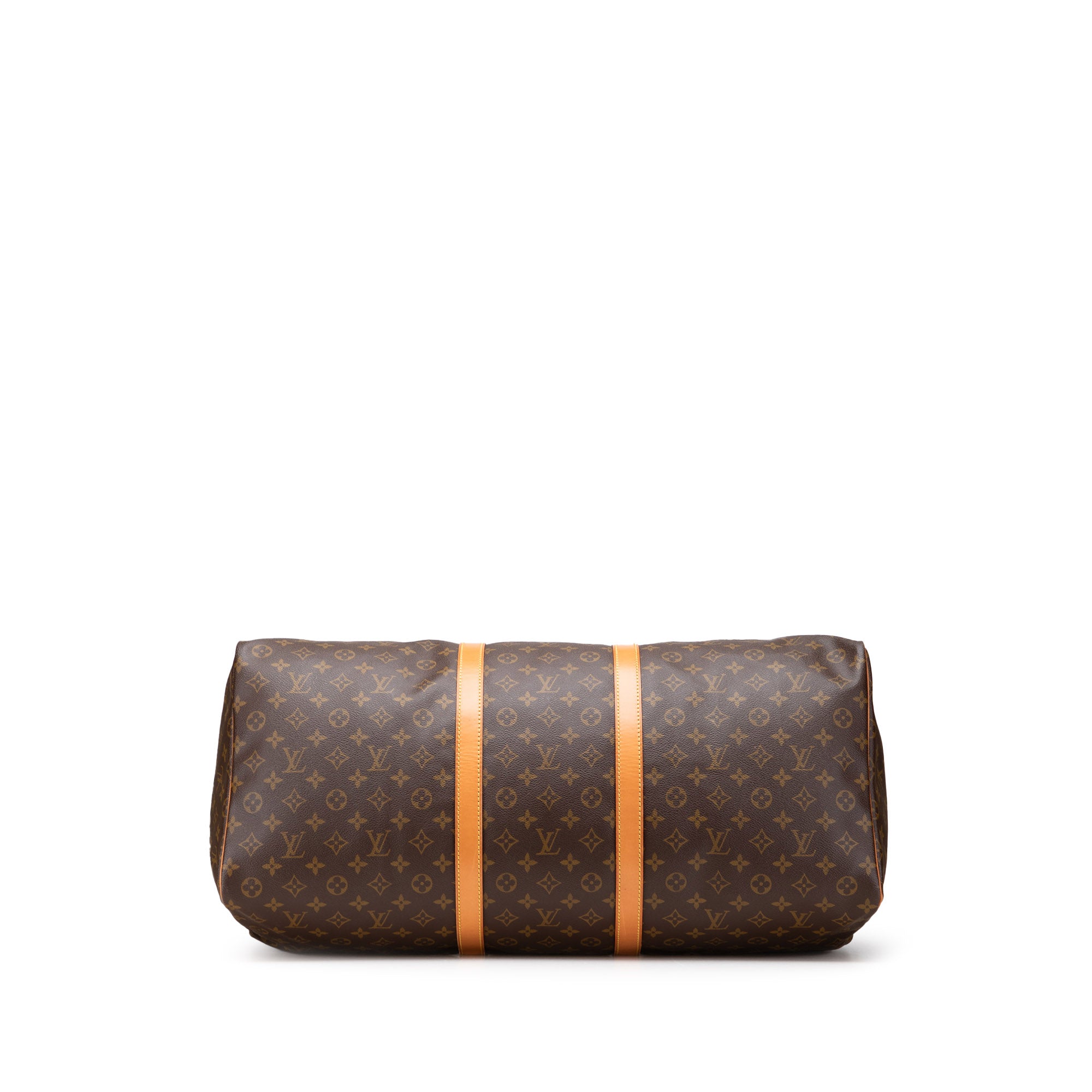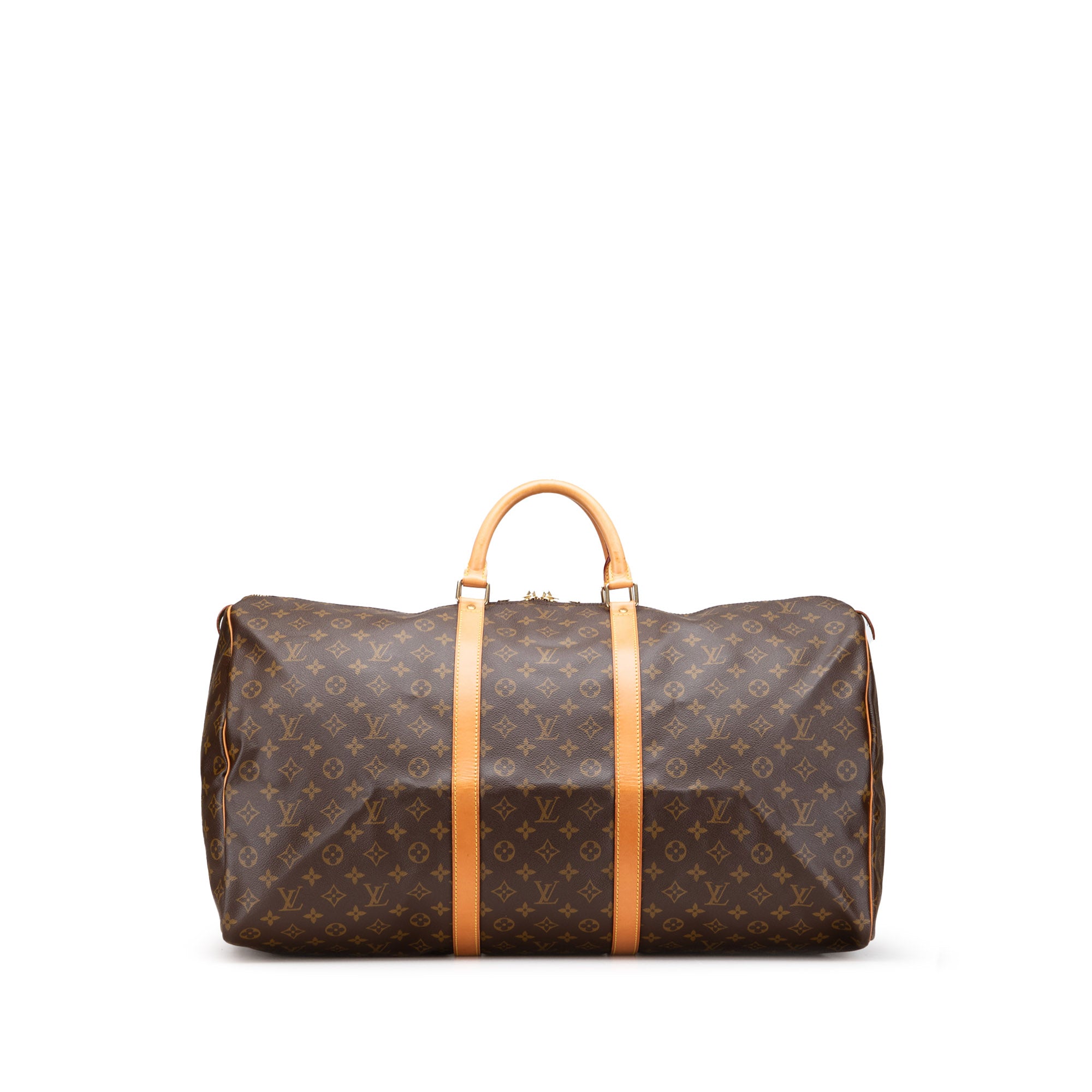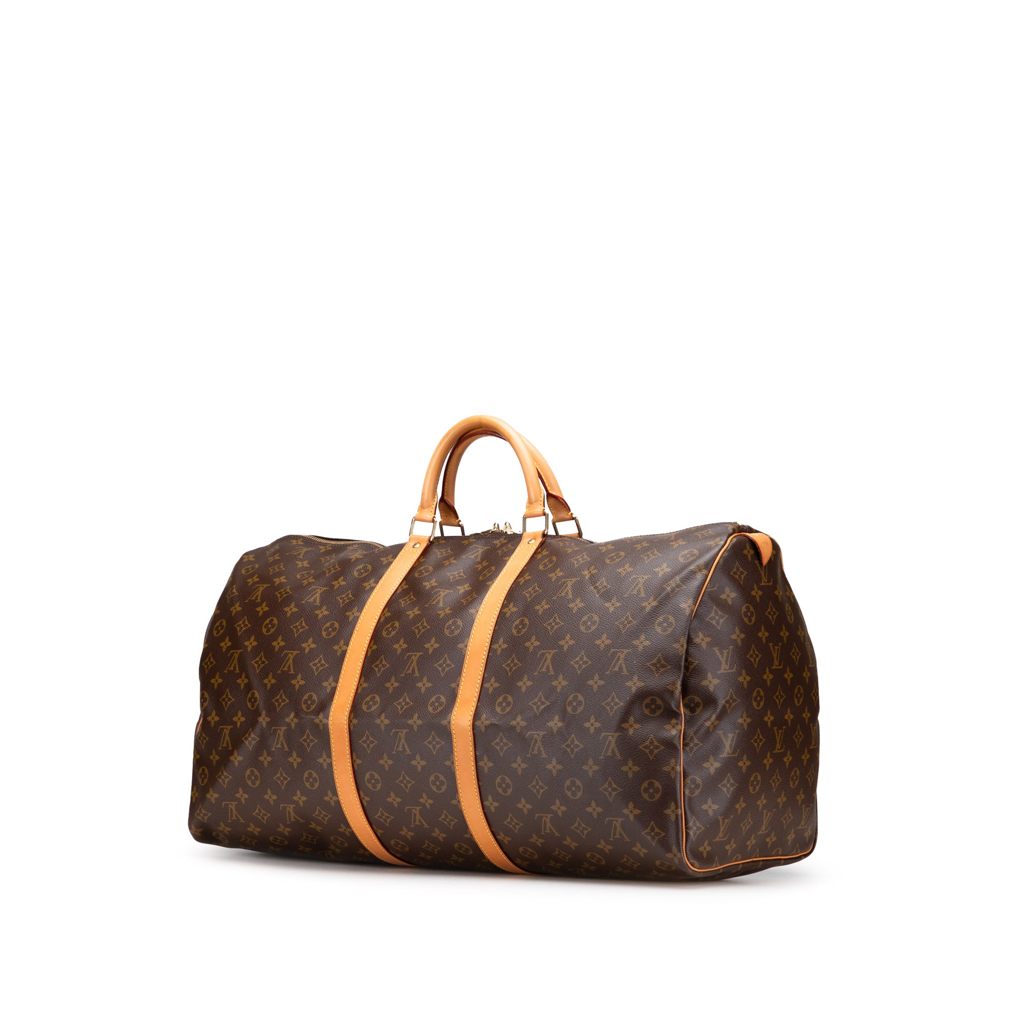The Keepall 60 features a monogram canvas body with vachetta leather trim, rolled vachetta leather handles, and a top zip closure. Retail Price: 1968.00