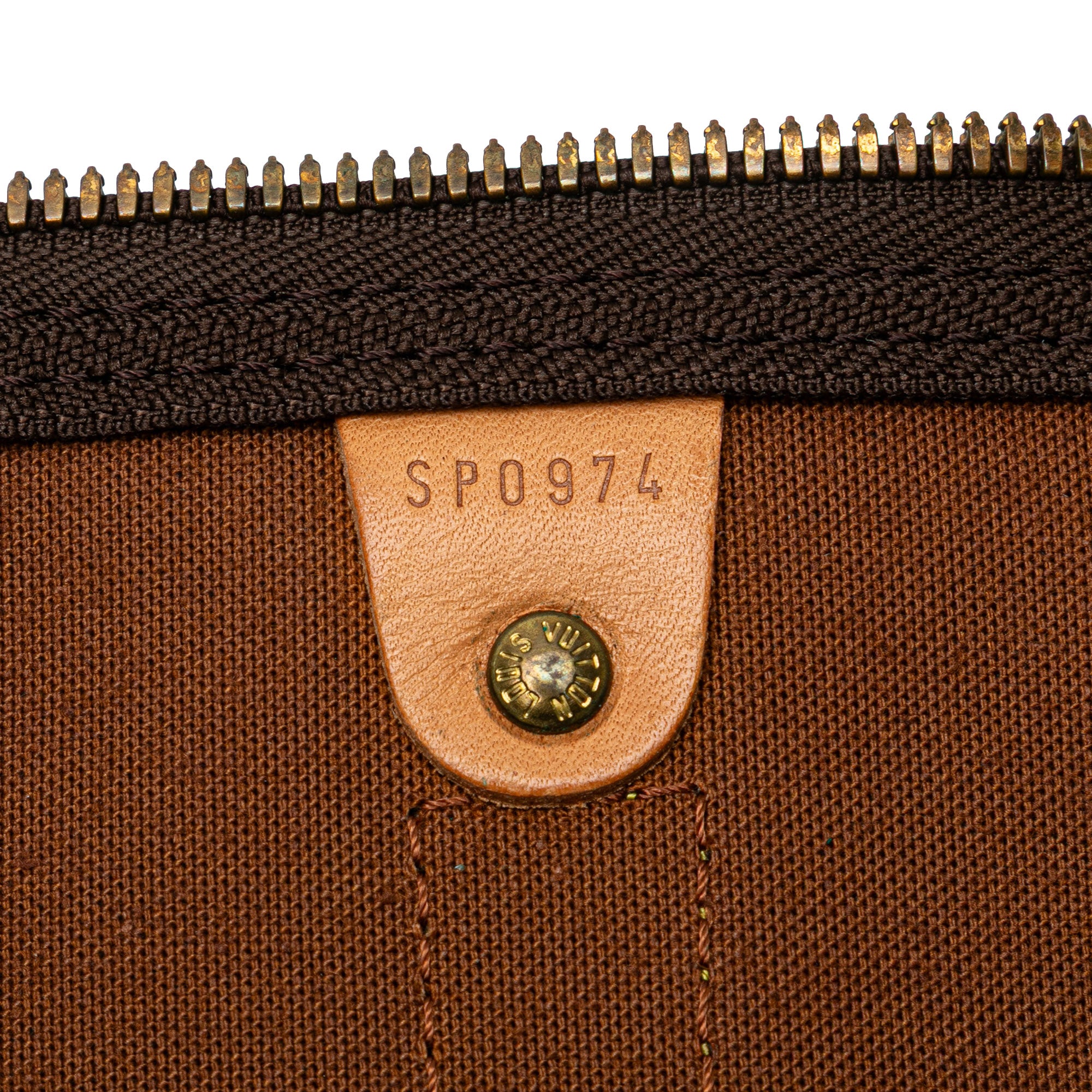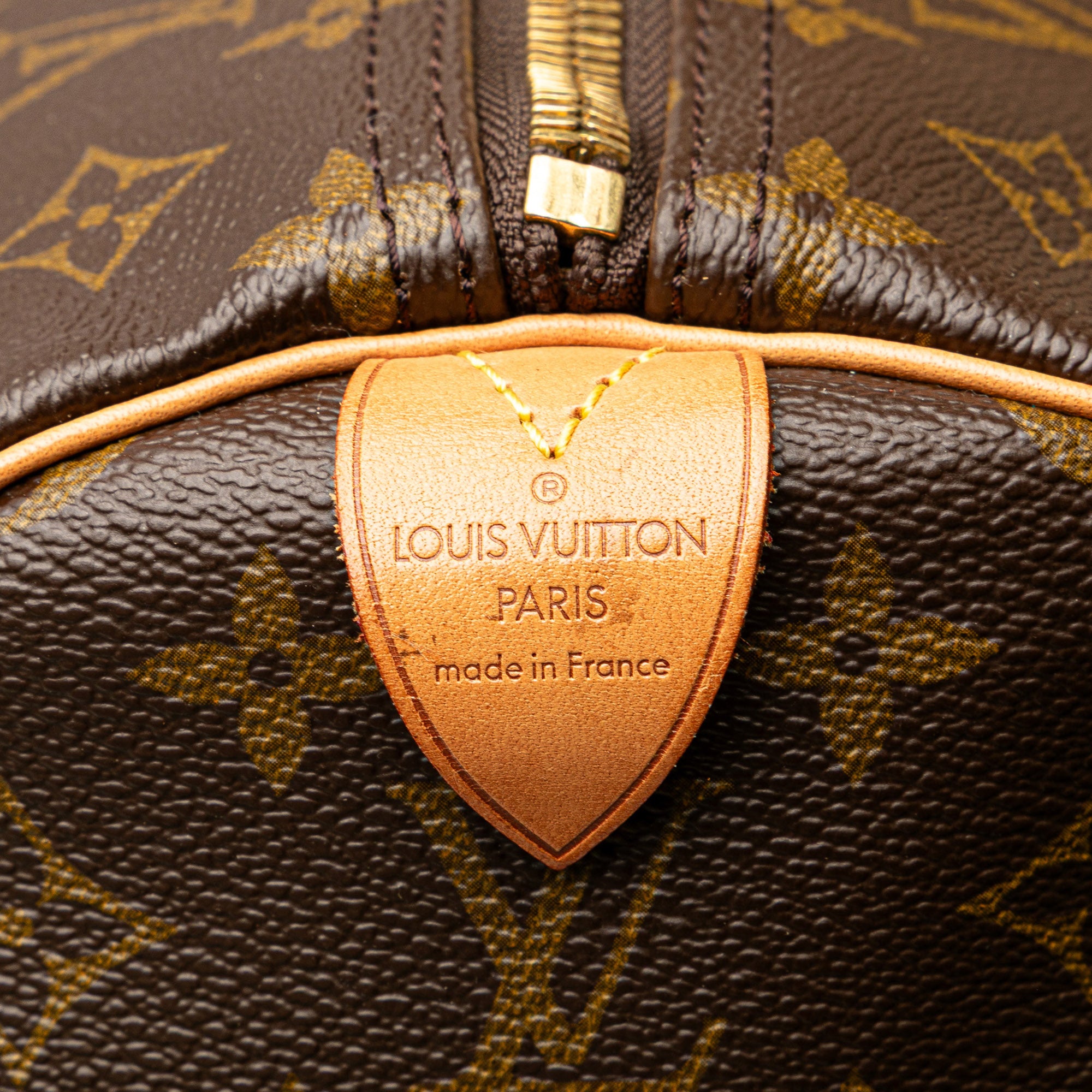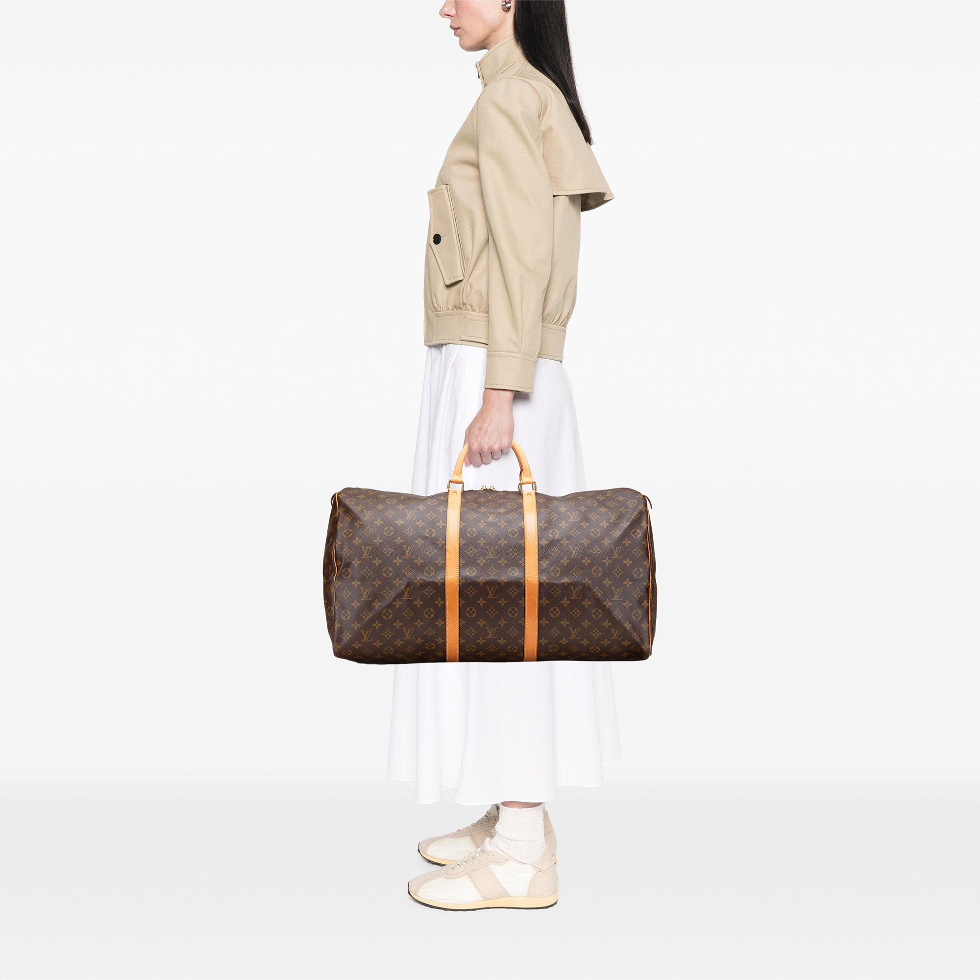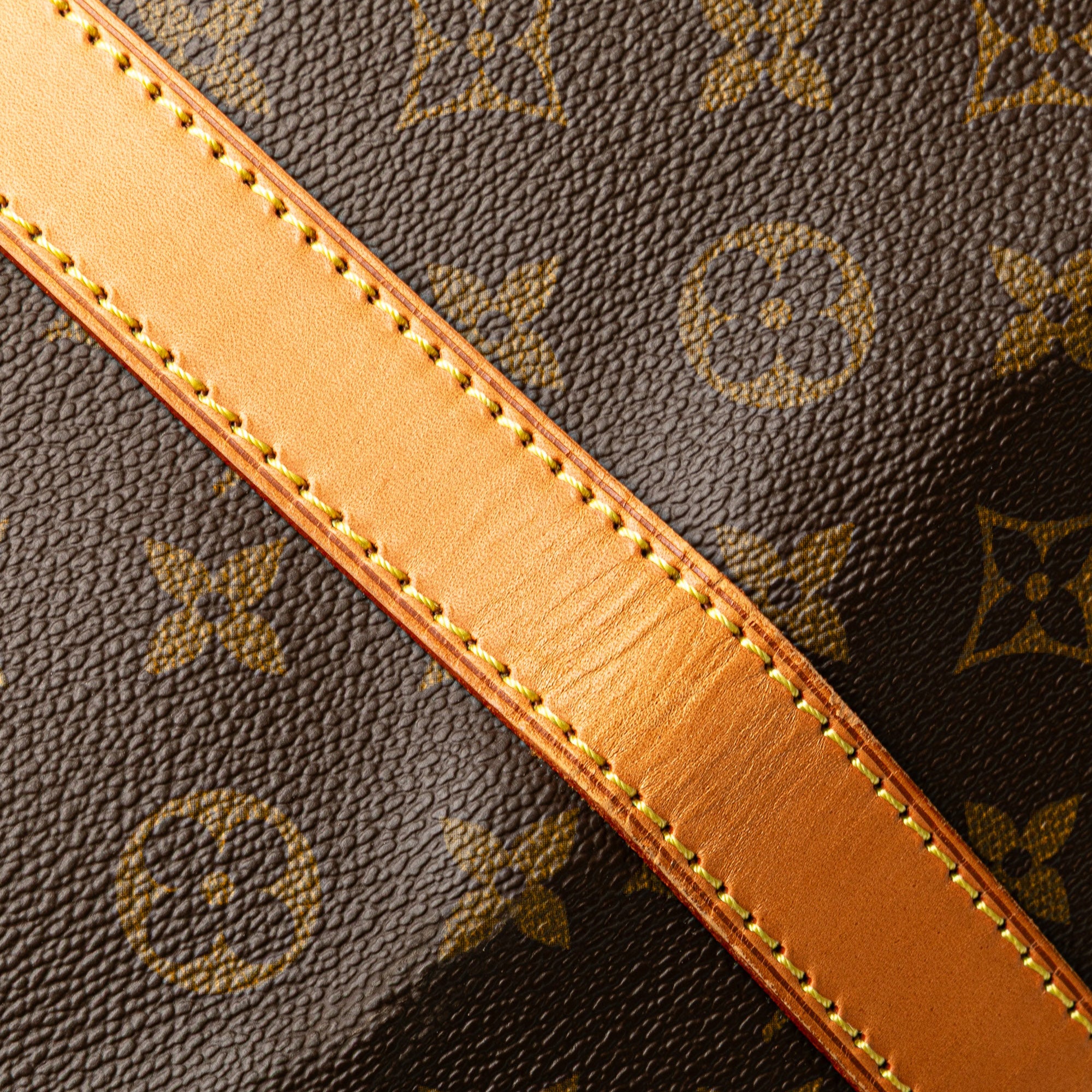 The Keepall 60 features a monogram canvas body with vachetta leather trim, rolled vachetta leather handles, and a top zip closure. Retail Price: 1968.00
