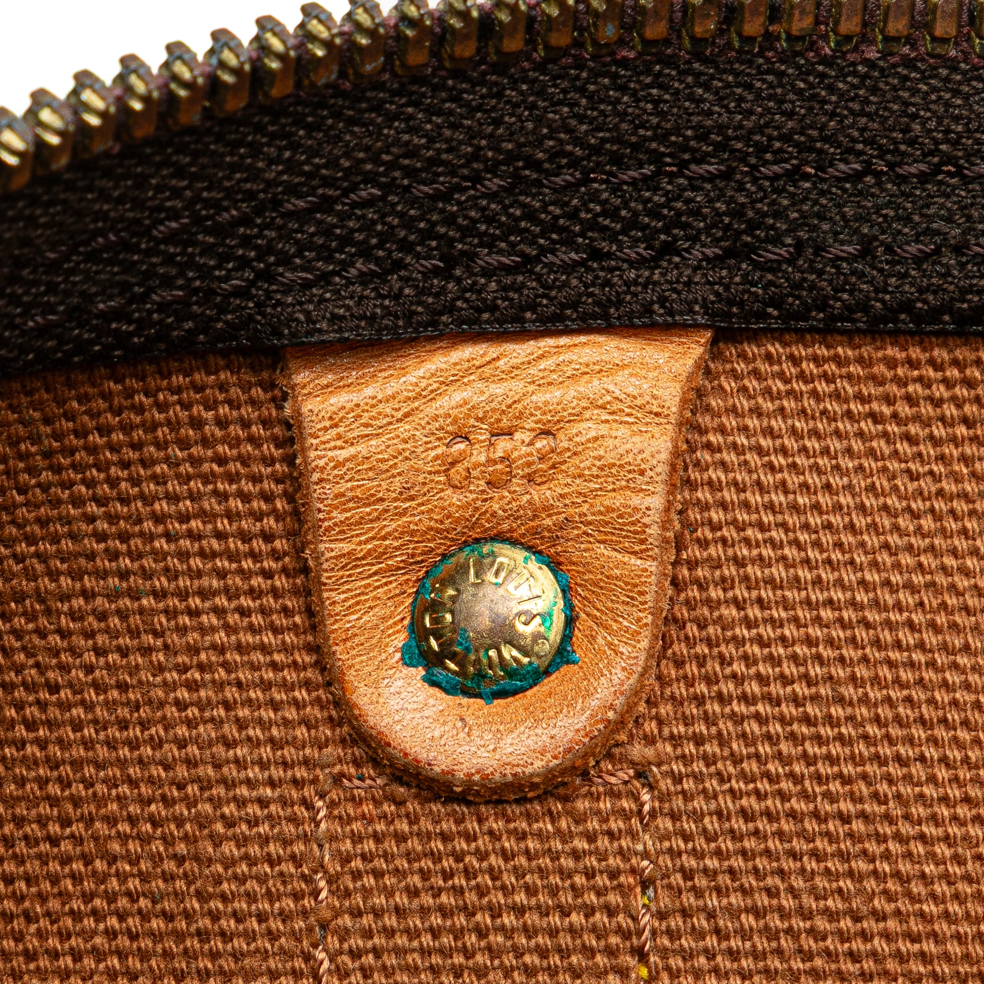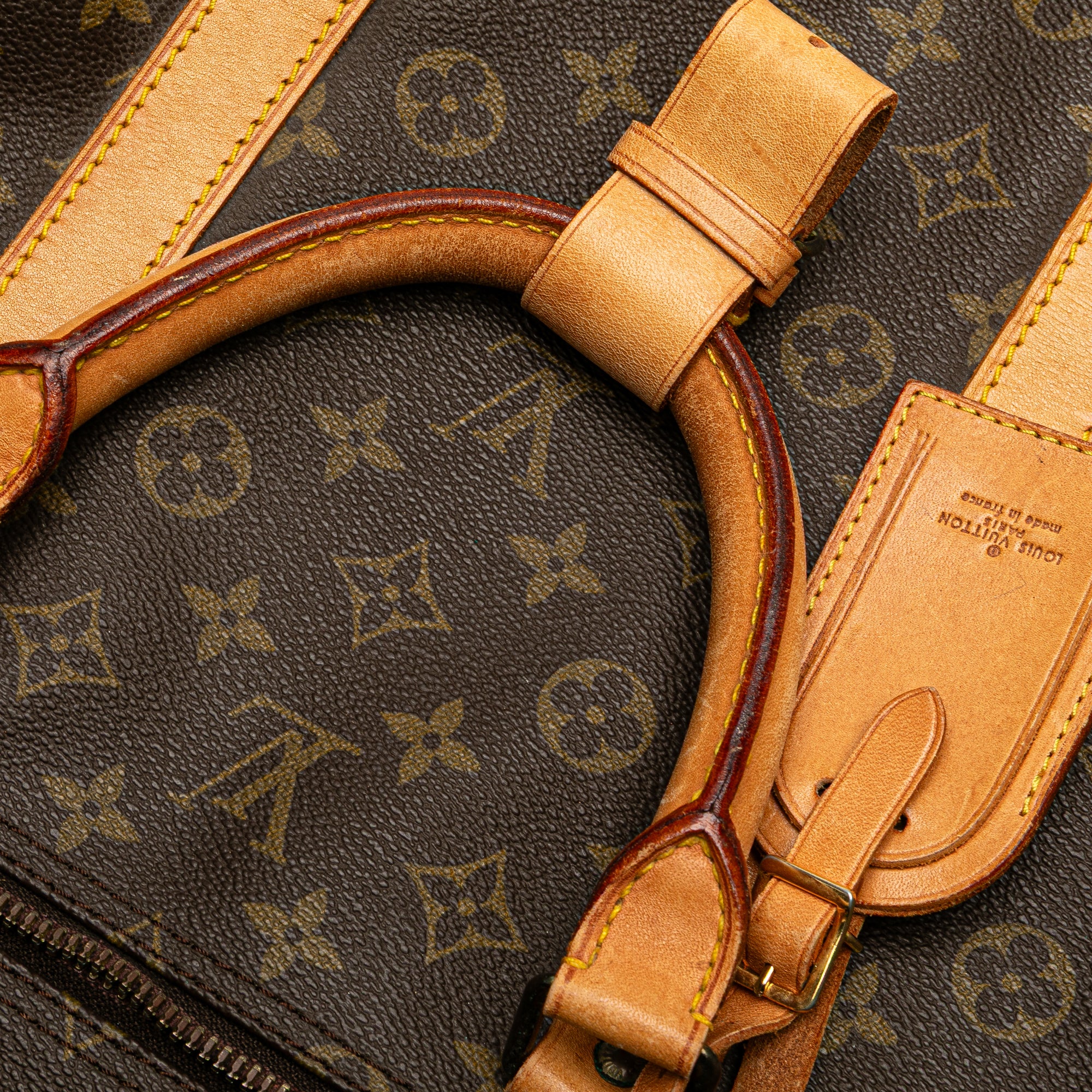 The Keepall 60 features a monogram canvas body with vachetta leather trim, rolled vachetta leather handles, and a top zip closure. Retail Price: 1968.00