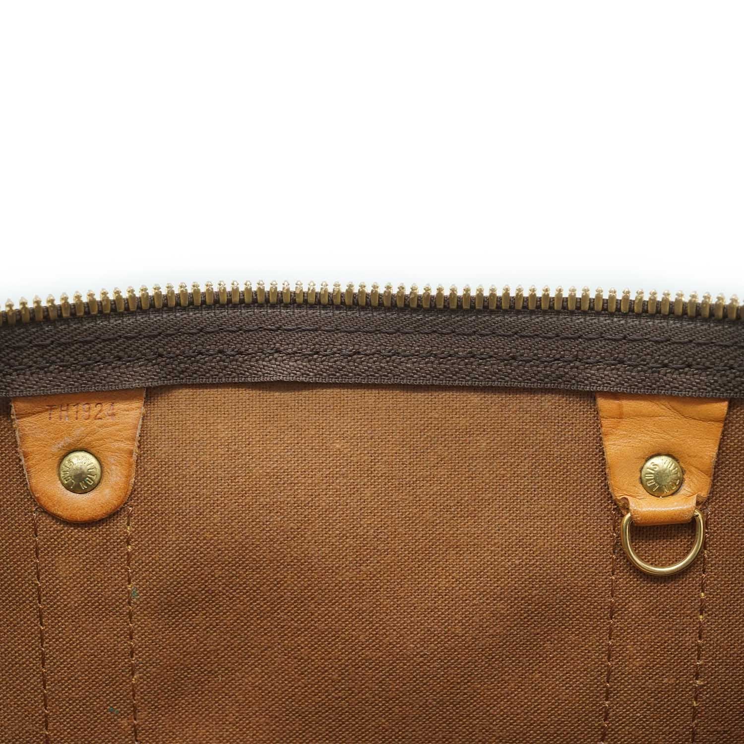 Monogram Keepall Bandouliere 45 Brown Canvas, LeatherDepth: 21cmHeight: 25.5cmWidth: 46.5cmHand Drop: 14cmOutside Rank: BInside Rank: BCStain: Water stains on the leather parts overall, white stains (mold) in the inside fabricDiscoloration: Some hardware tarnish (green mold)Peeling: Minor leather cracking and peeling on the top handles, slight scratches on the leather partsInclude: Padlock, 2 keys (the padlock CANNOT be open since the keys are attached to it)Missing: Shoulder strap (bandouliere) missingSerial code: TH1924