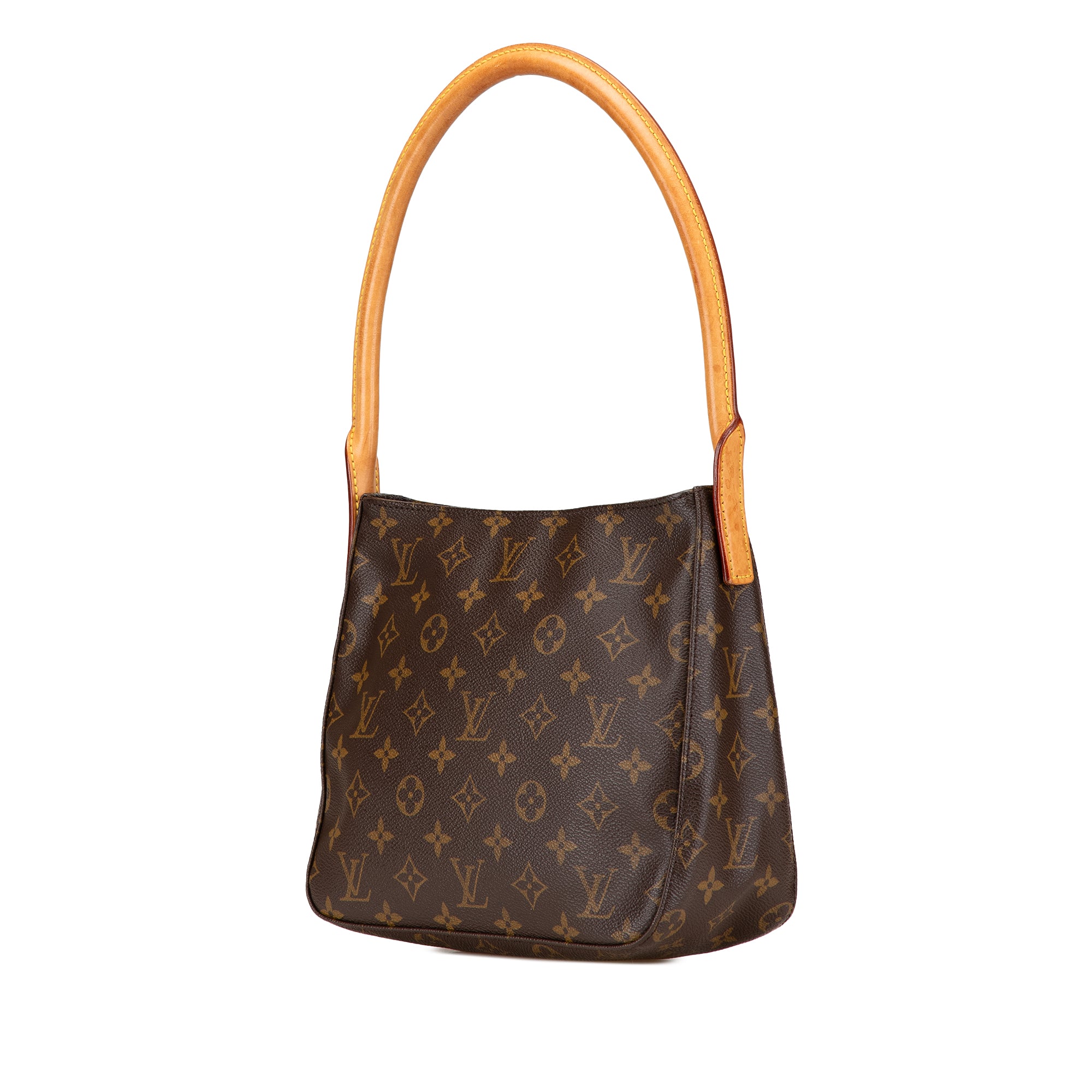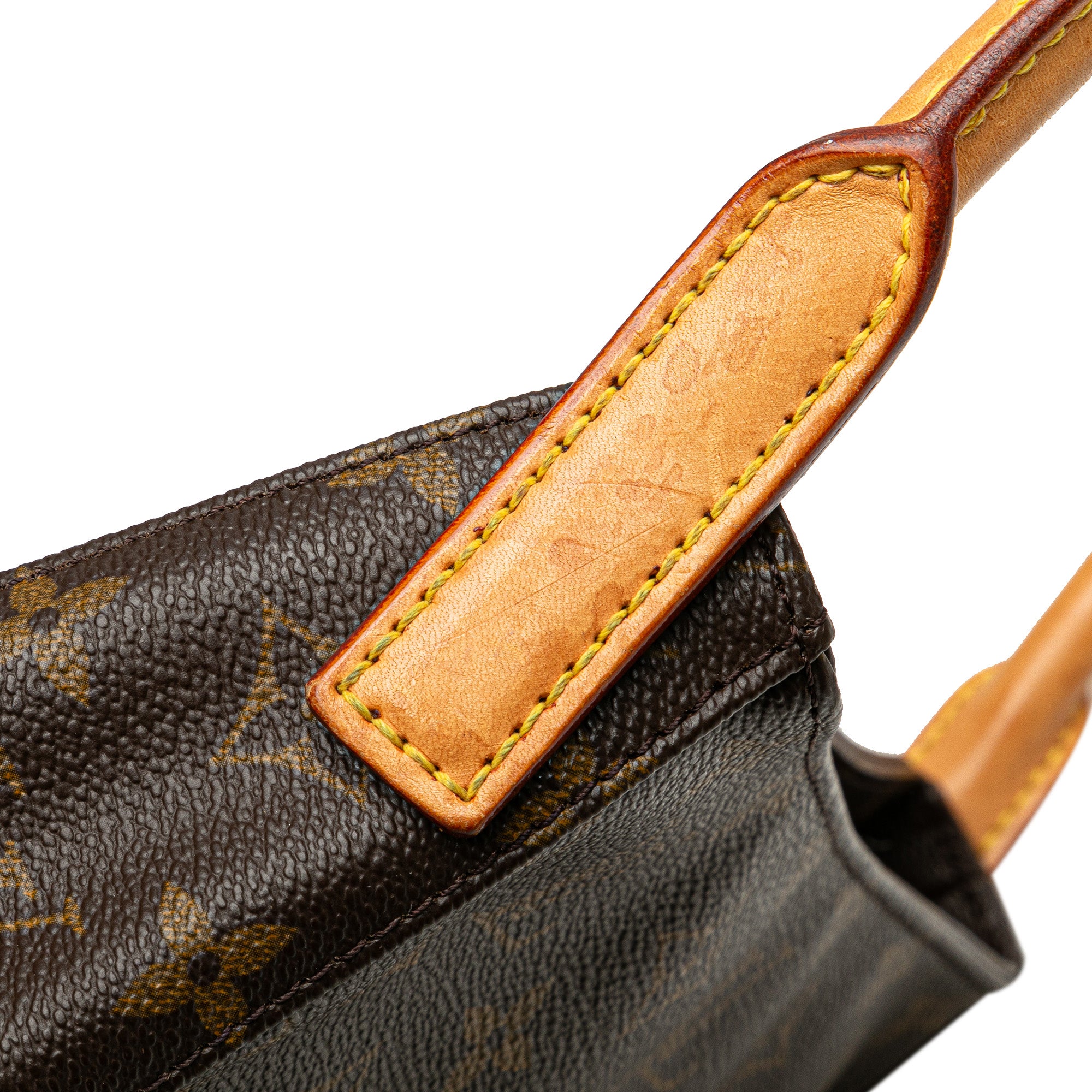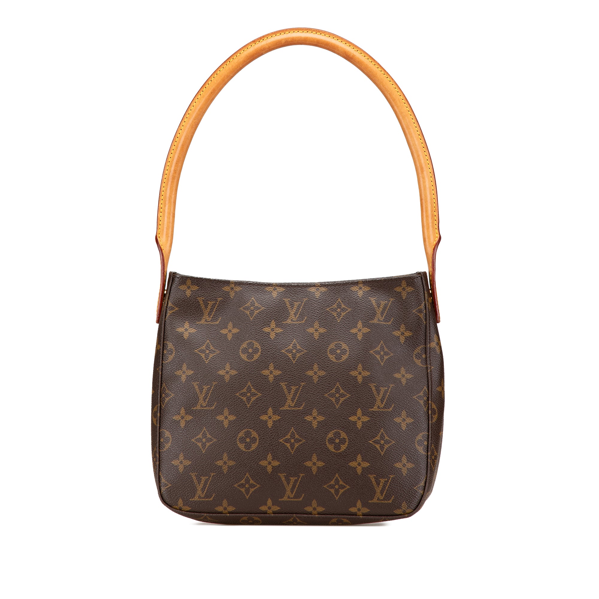 The Looping MM features a monogram canvas body, a rolled vachetta leather shoulder strap, a top zip closure, and interior zip and slip pockets. Retail Price: 1030.00