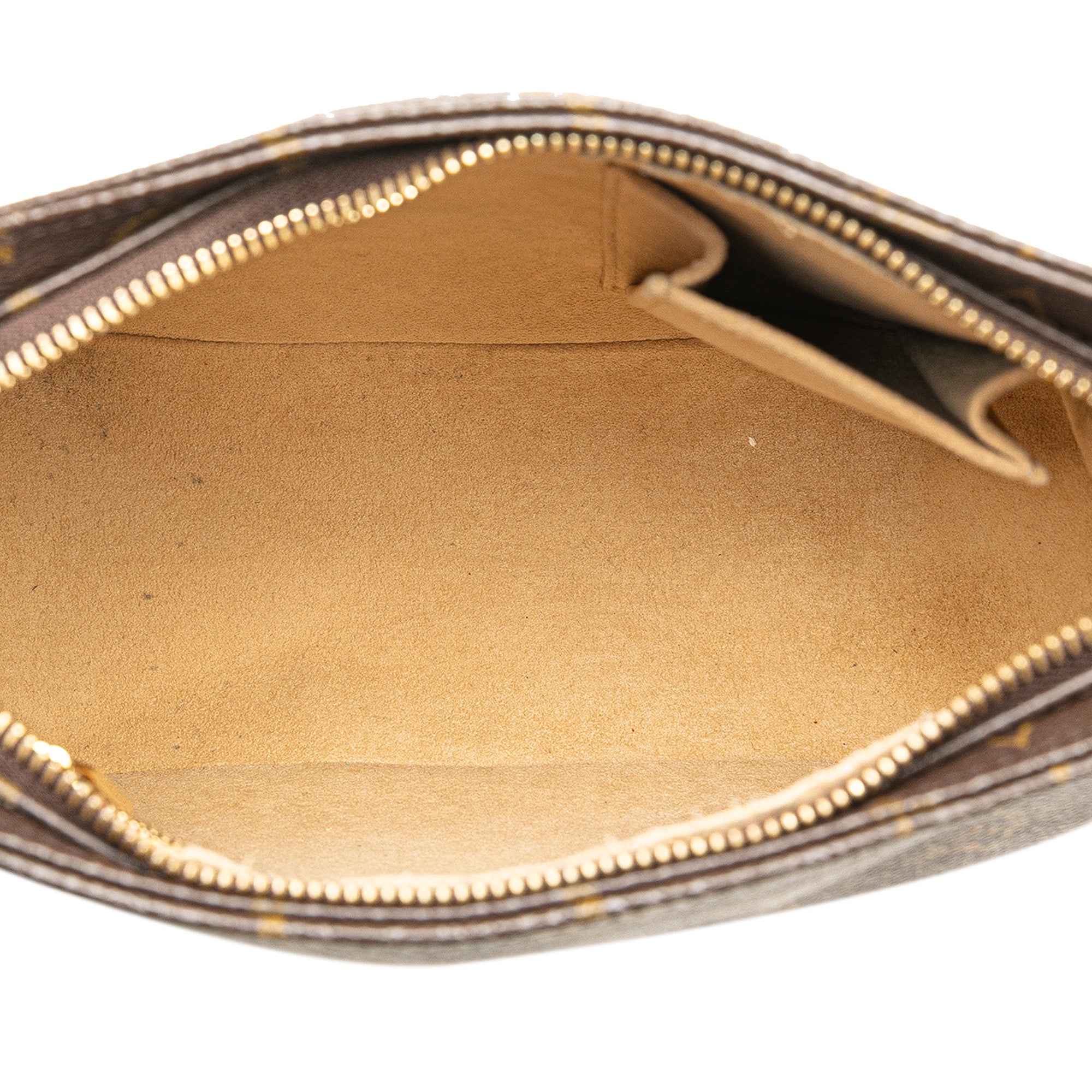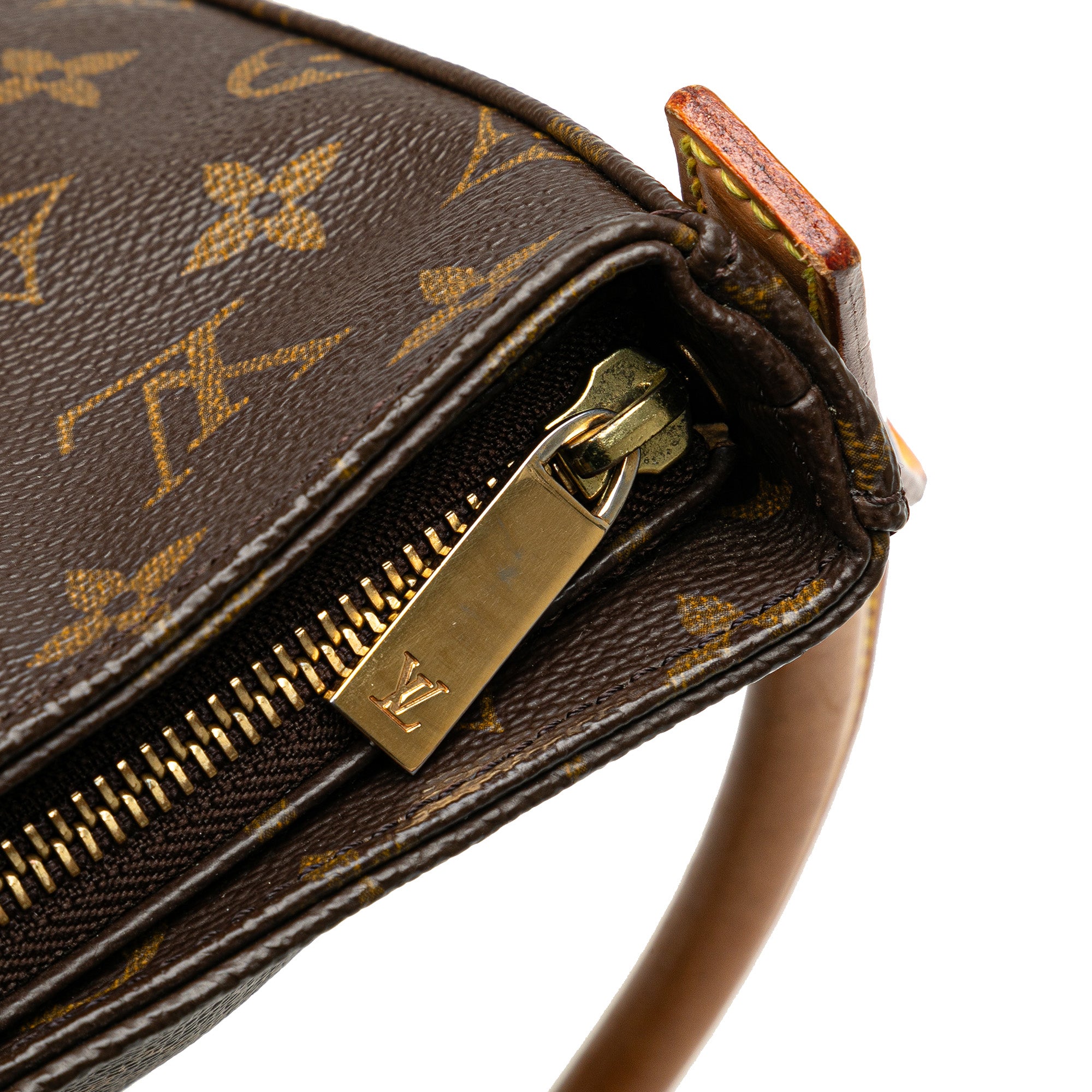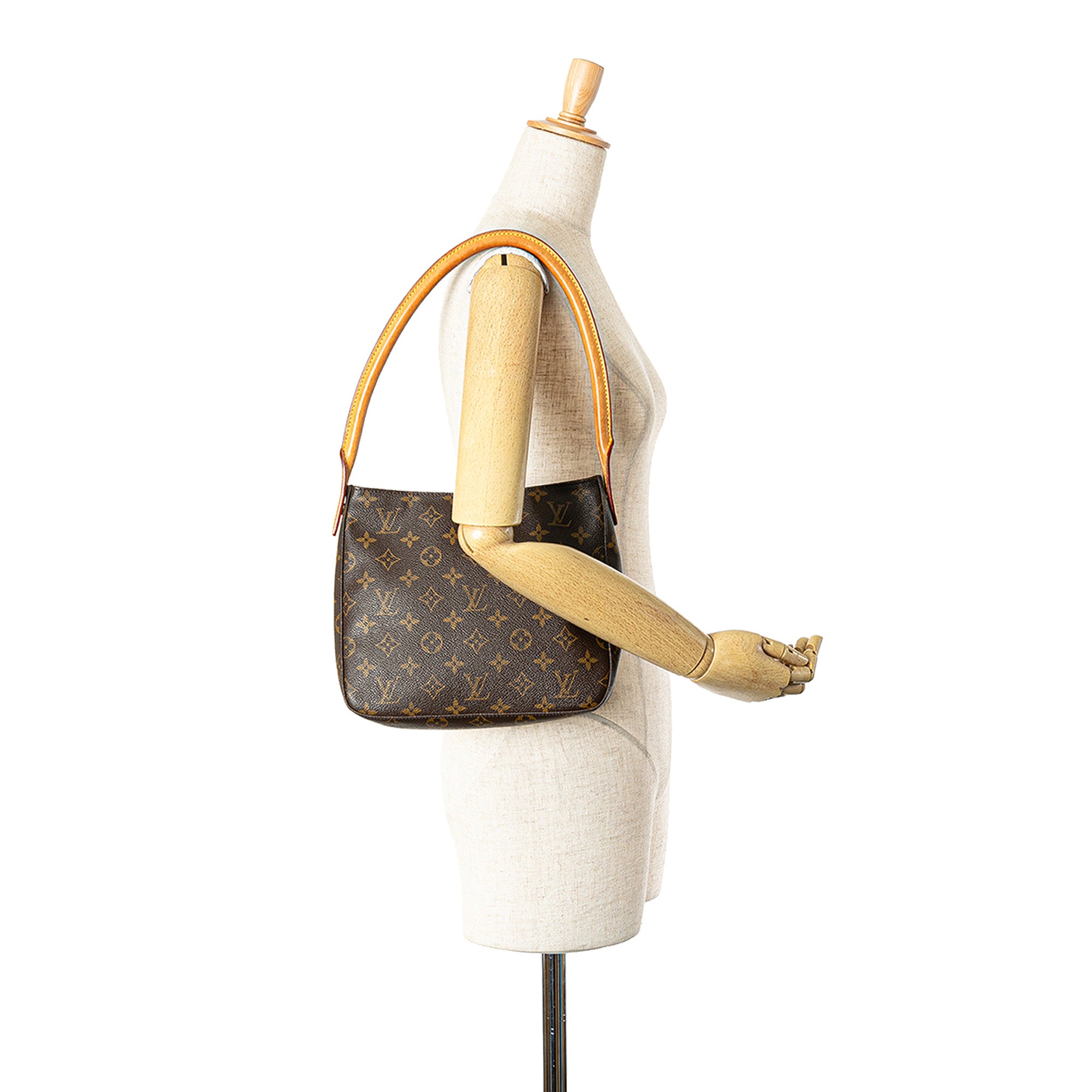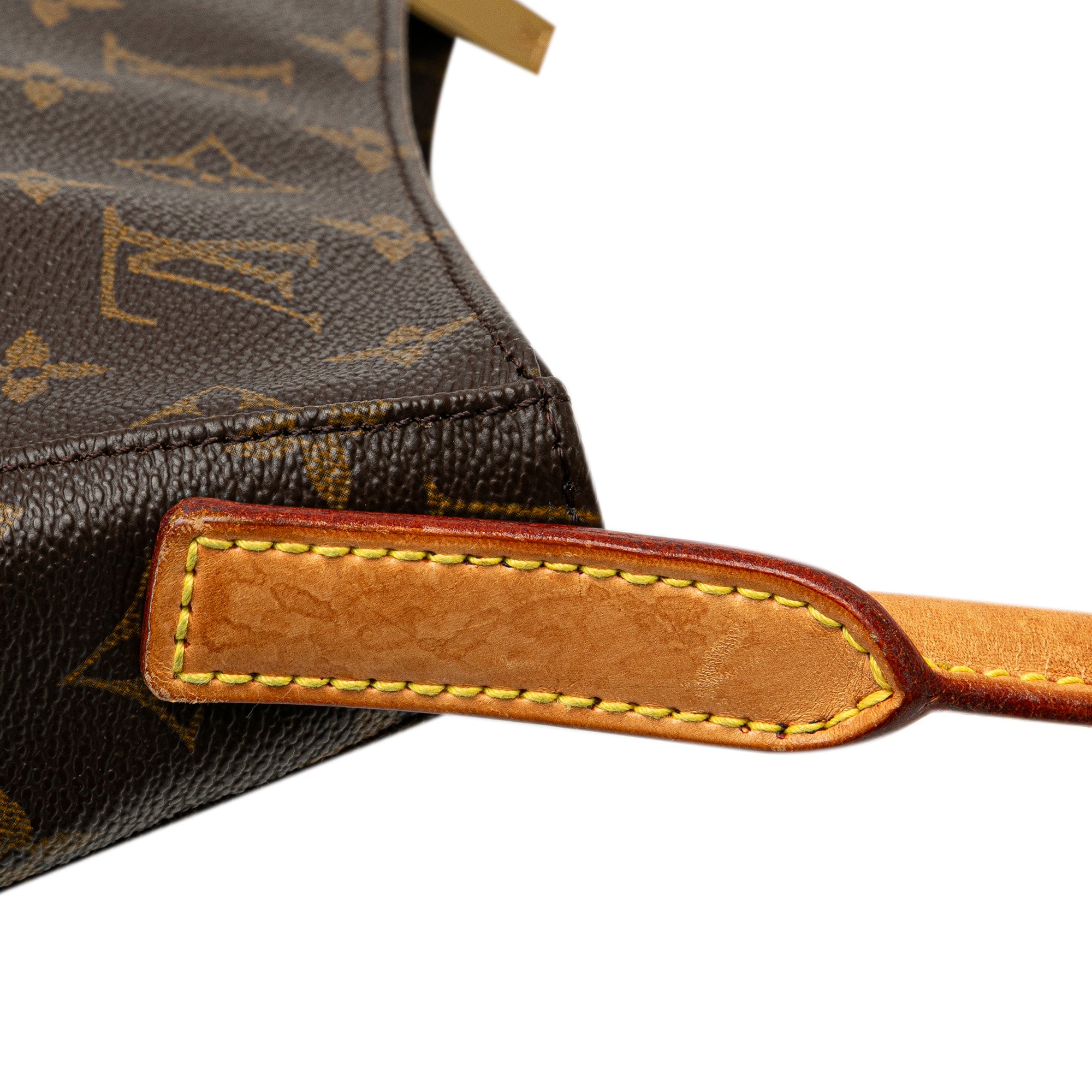 The Looping MM features a monogram canvas body, a rolled vachetta leather shoulder strap, a top zip closure, and interior zip and slip pockets. Retail Price: 1030.00