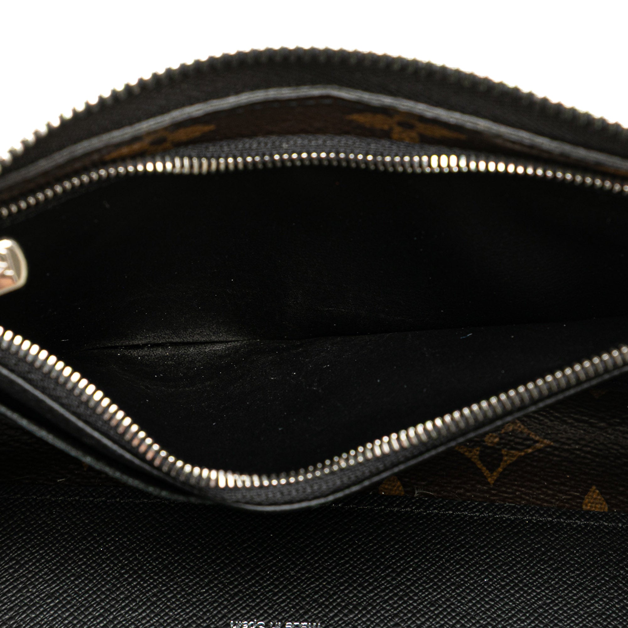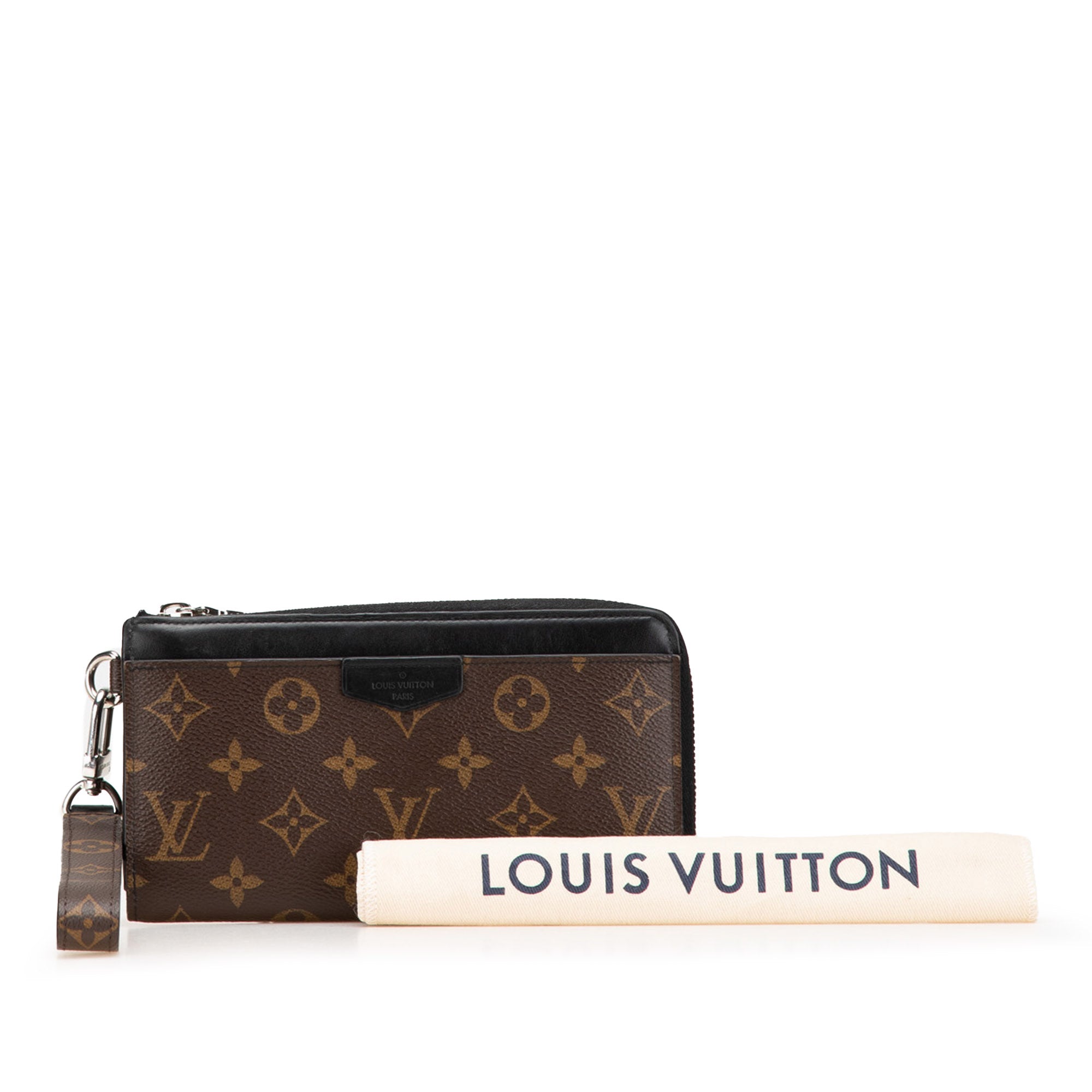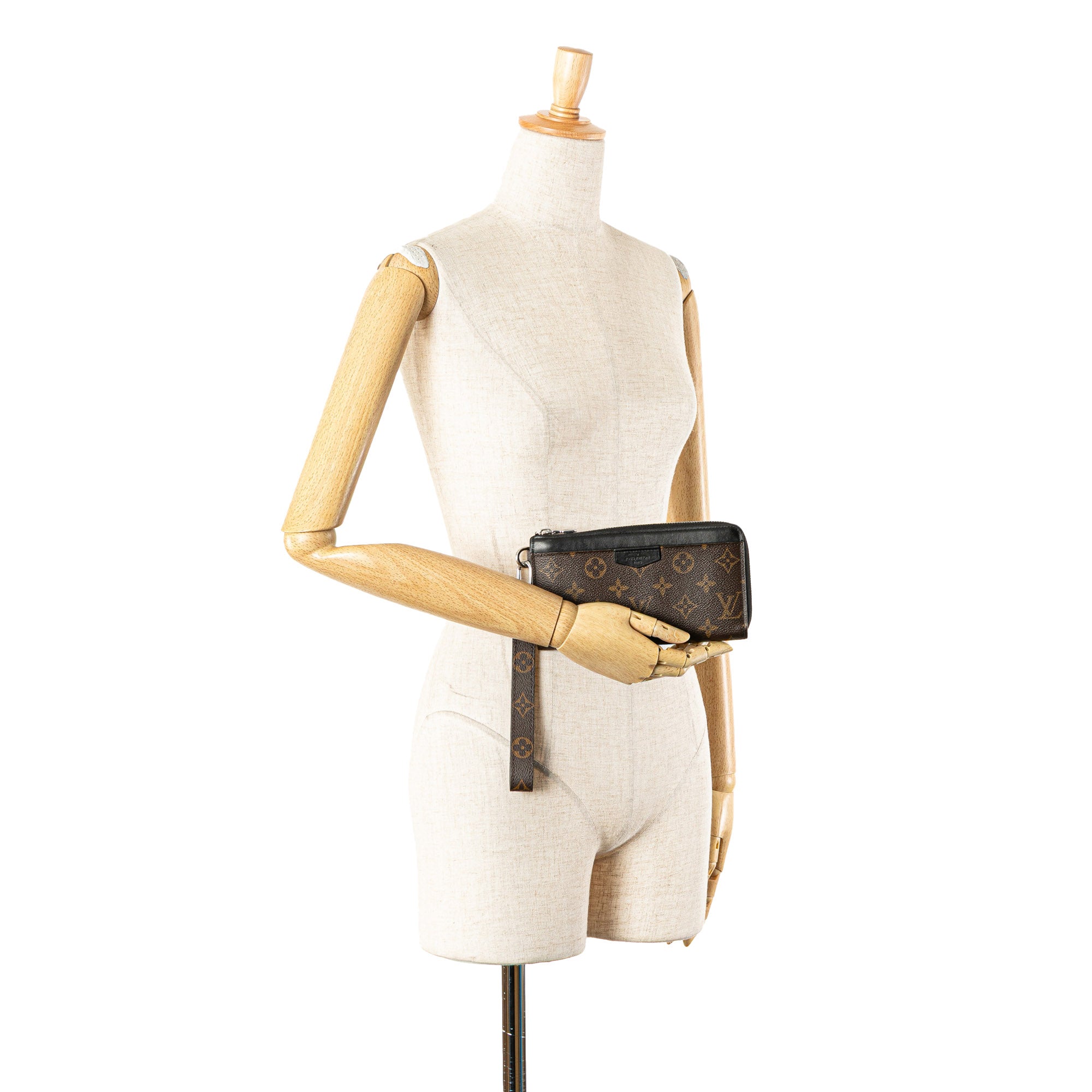 This wallet features a monogram canvas body with leather trim, a detachable wrist strap, a top zip closure, and interior zip and slip pockets and compartments. Inclusion: Dust bag. Retail Price: 1320.00
