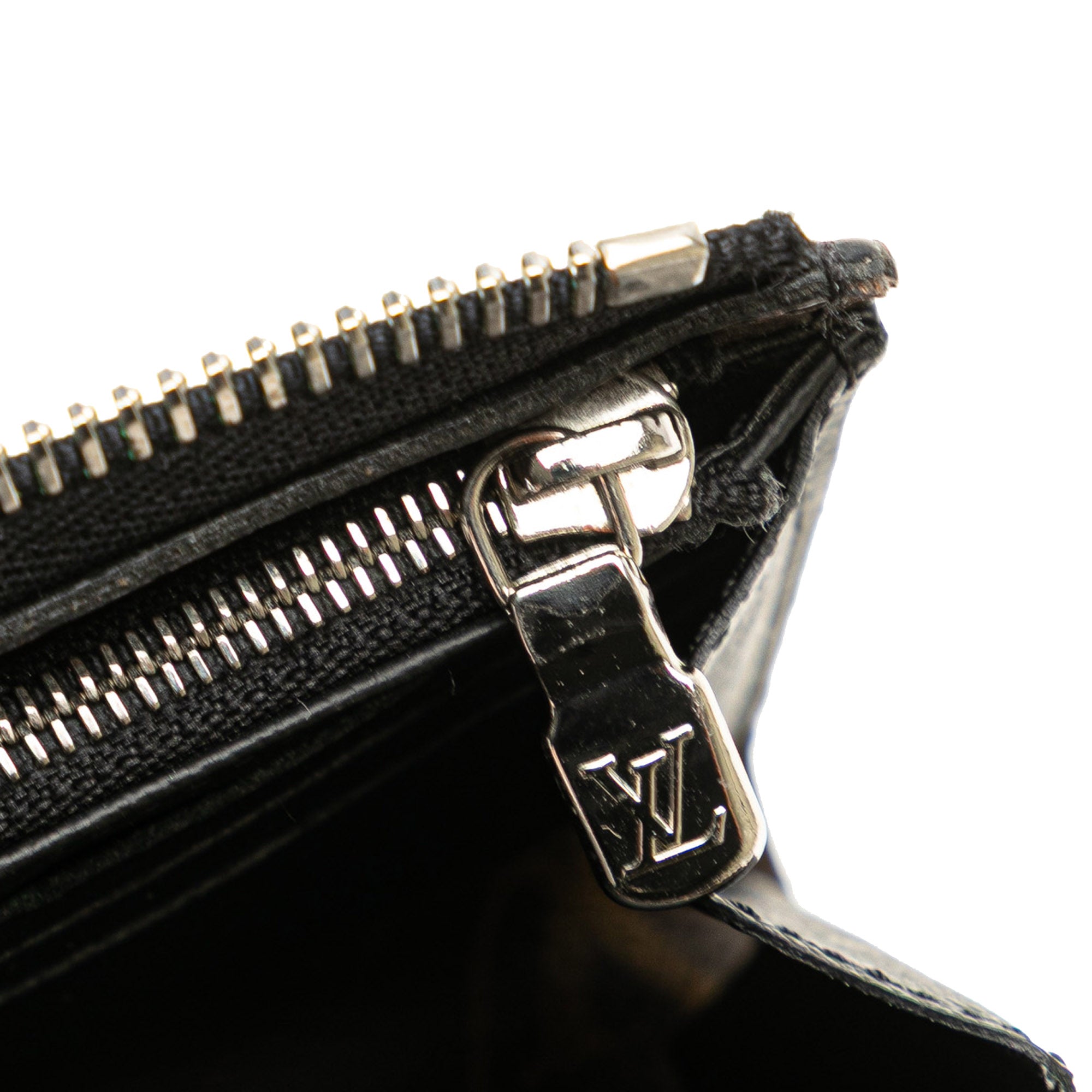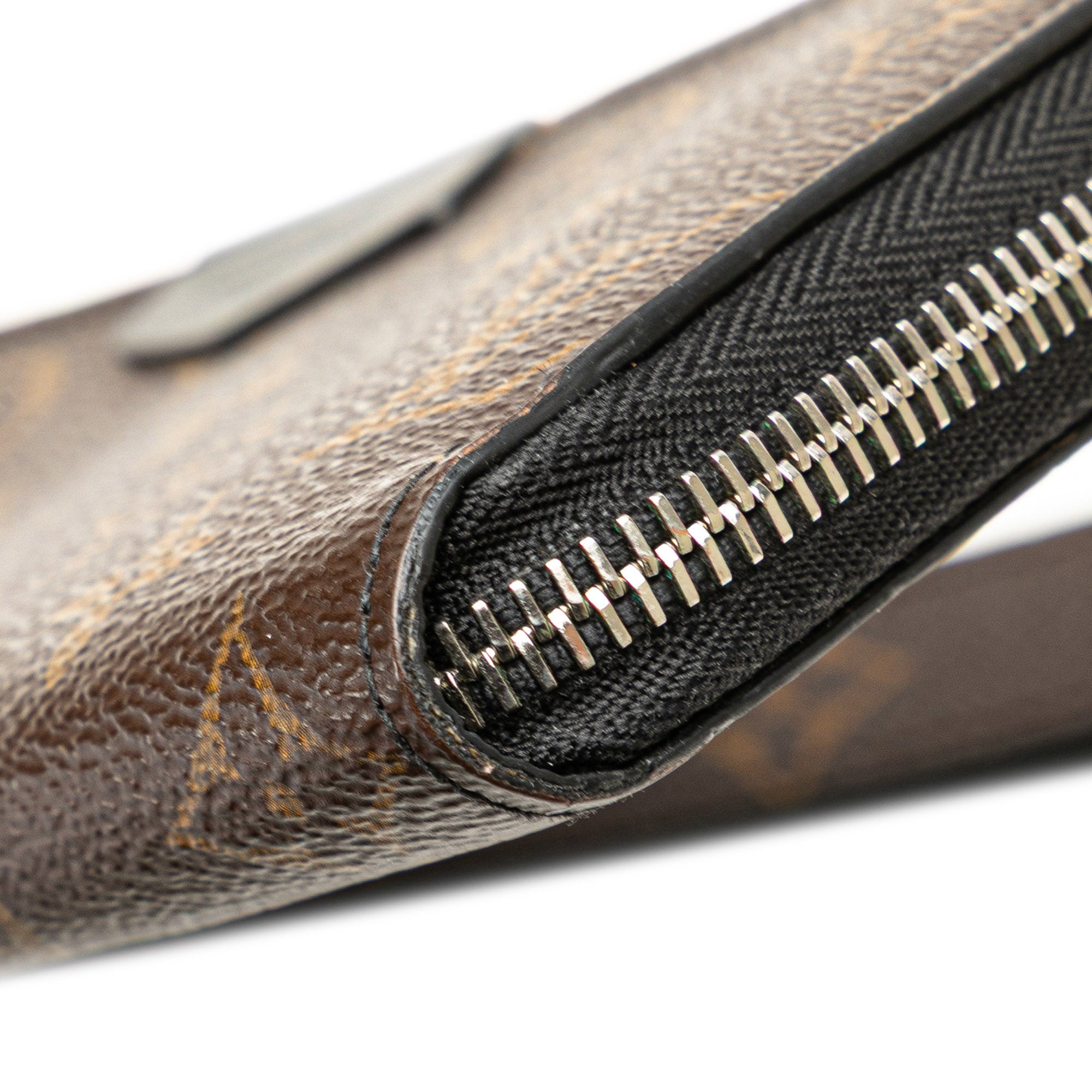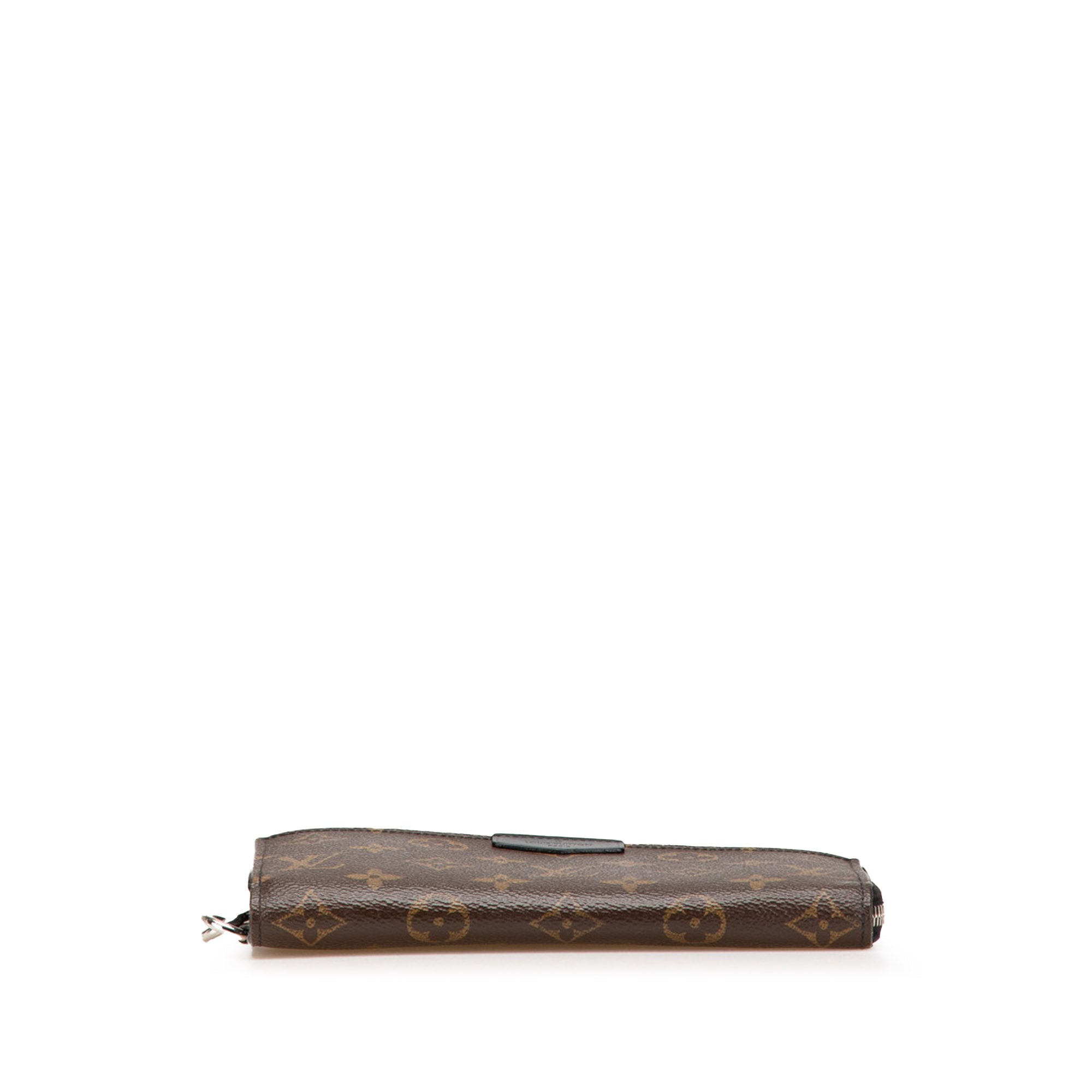 This wallet features a monogram canvas body with leather trim, a detachable wrist strap, a top zip closure, and interior zip and slip pockets and compartments. Inclusion: Dust bag. Retail Price: 1320.00