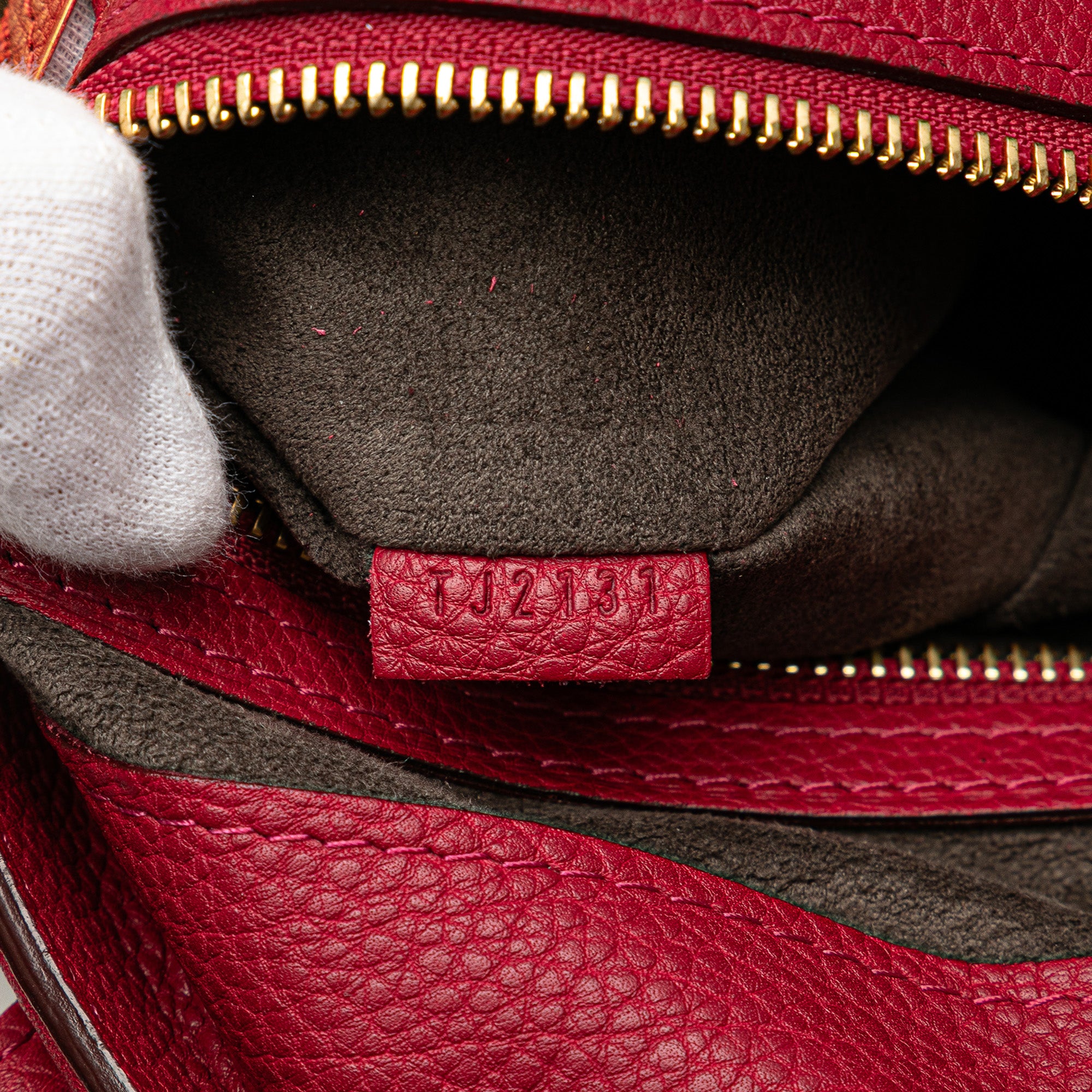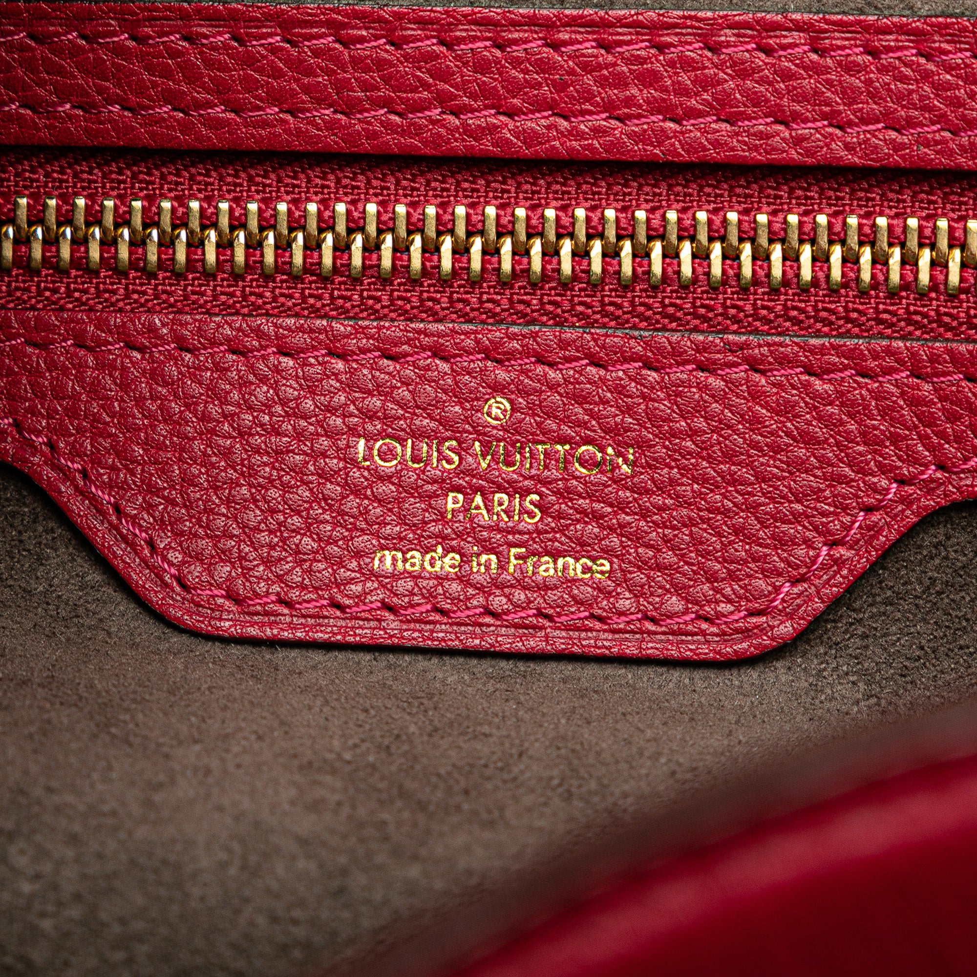 The Cirrus PM features a monogram mahina leather body, flat leather handles, a flat strap with a push lock closure, and interior zip and slip pockets. Retail Price: 3800.00