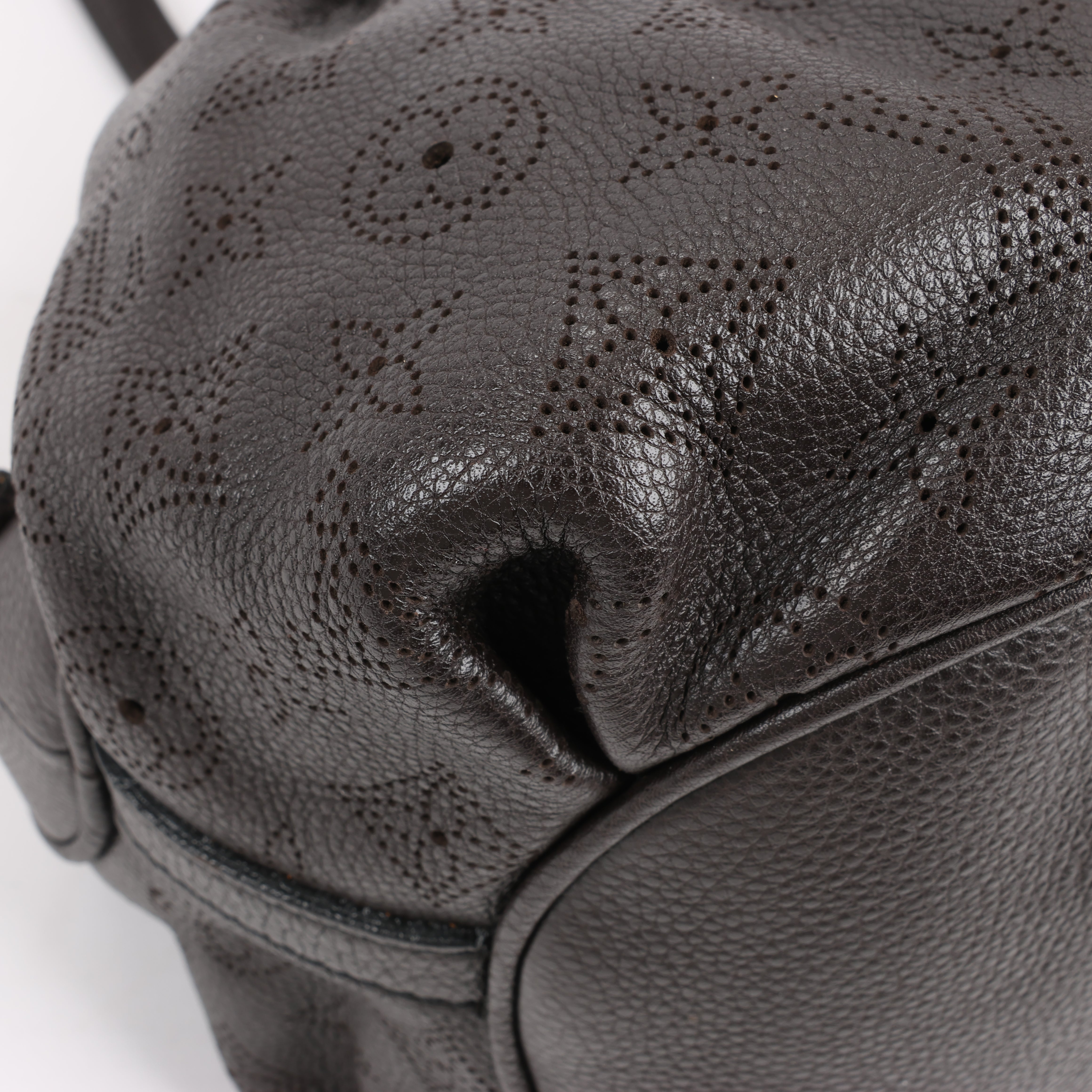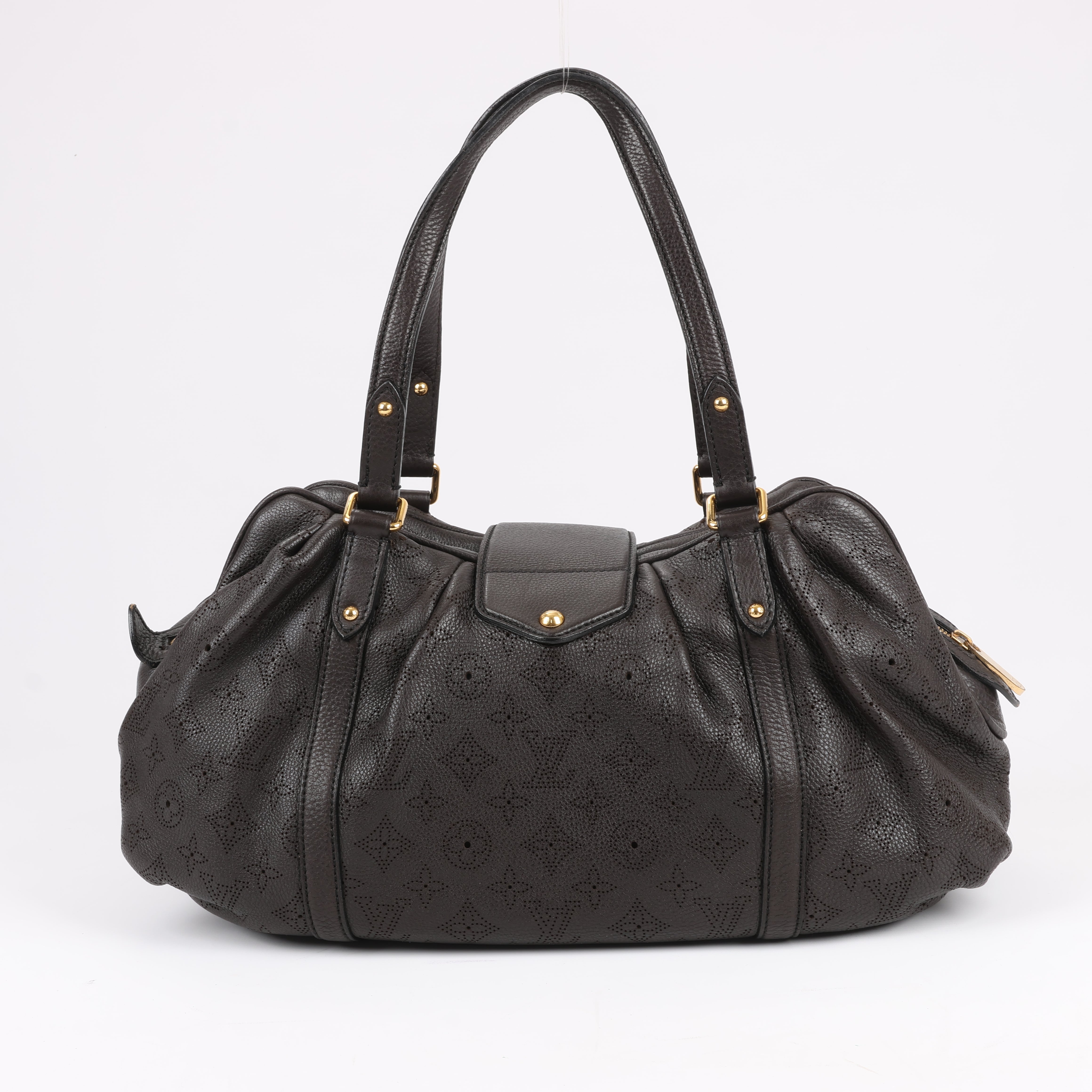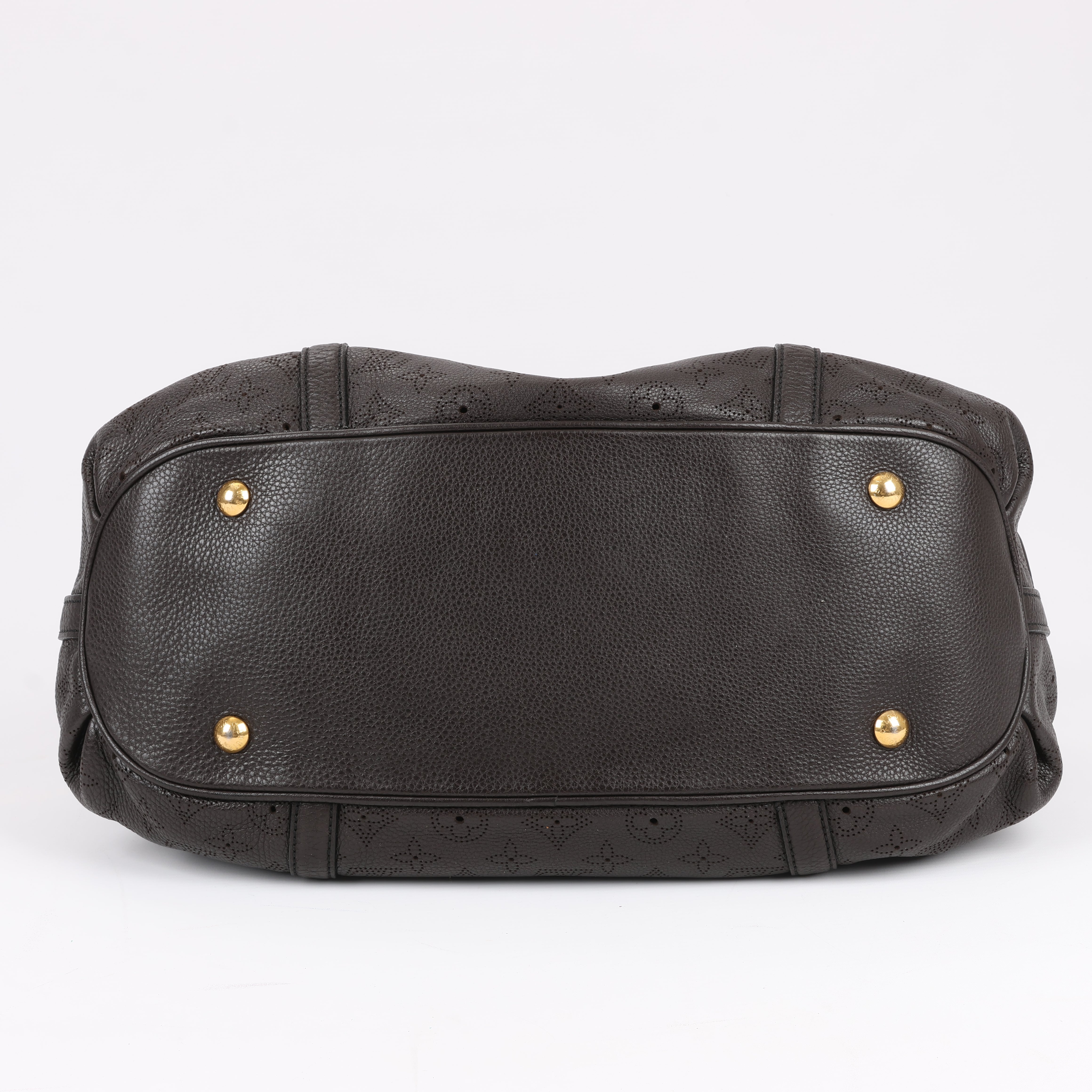 Louis Vuitton Monogram Mahina Leather Lunar GM handbag M97052 in brown. This spacious and elegant bag features the iconic perforated Monogram Mahina leather, pleated details, and gold-tone hardware. A sophisticated everyday carry with dual handles and a secure push-lock closure.