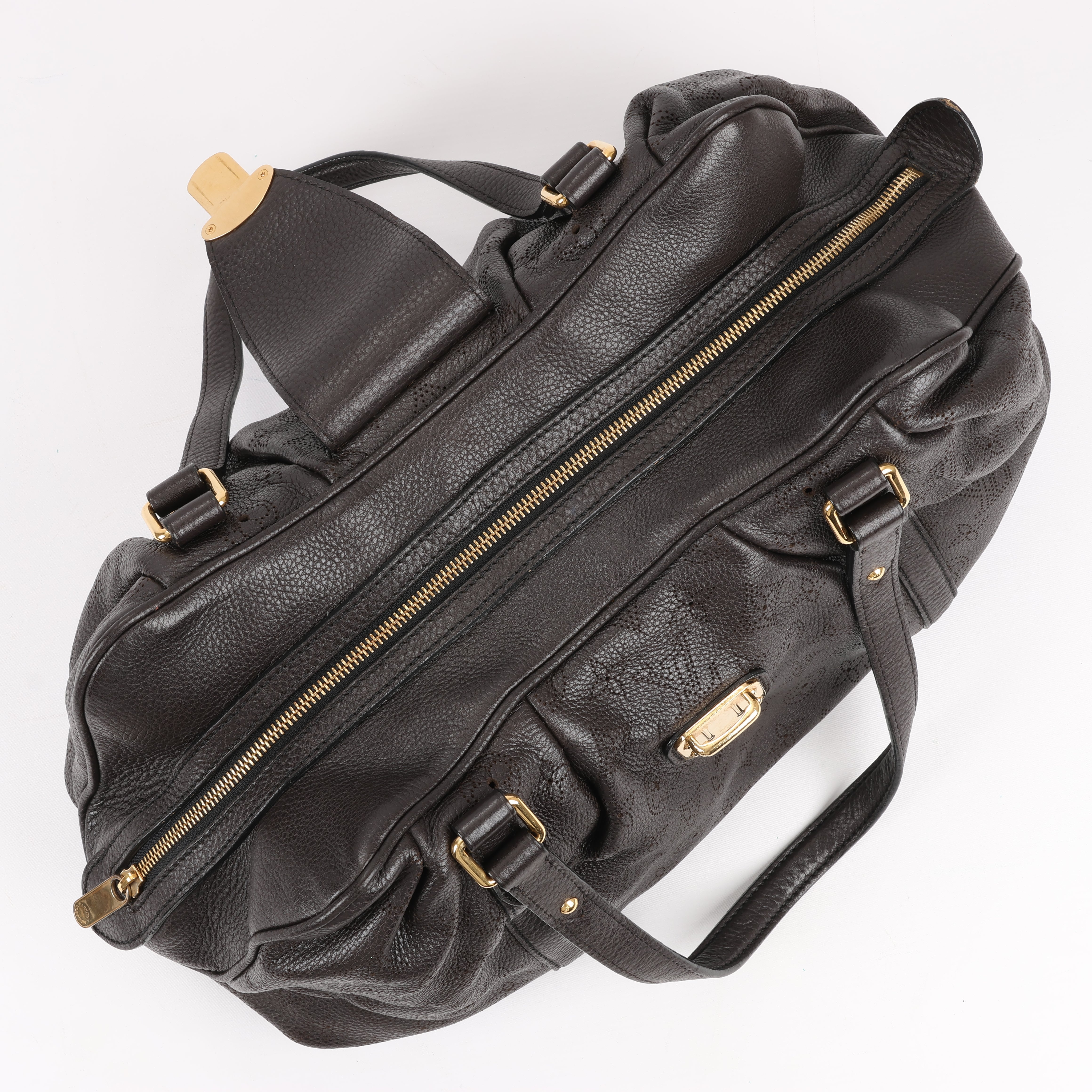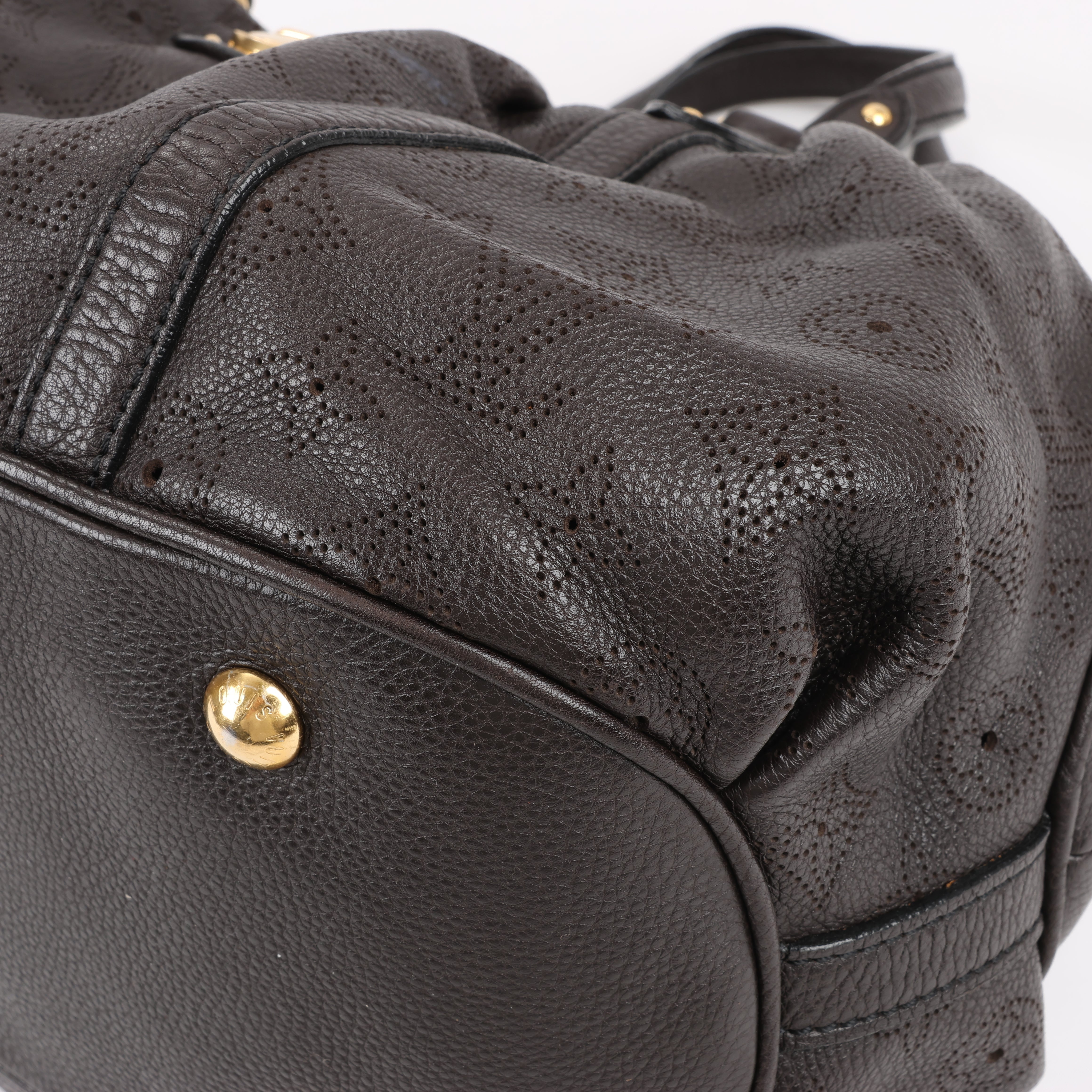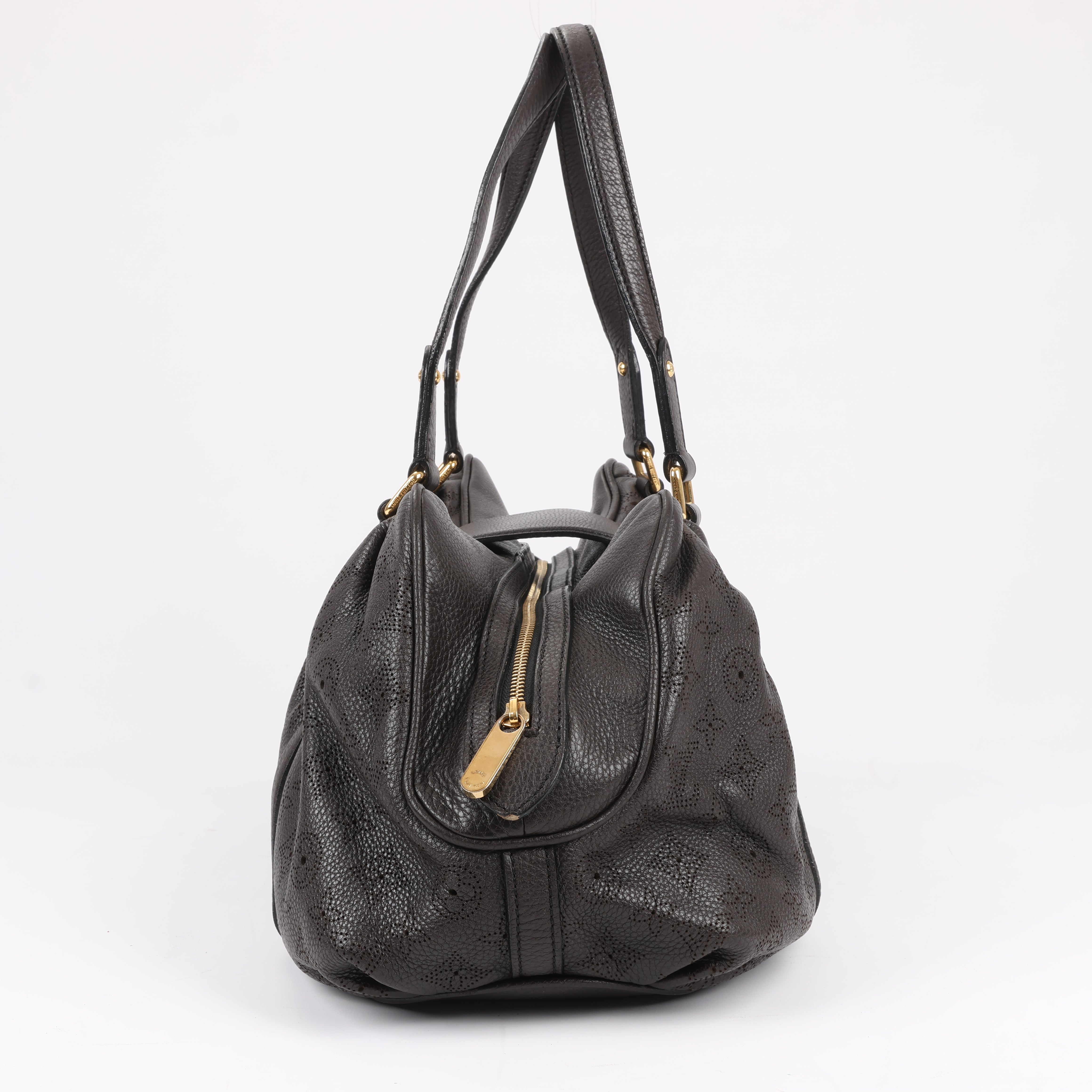 Louis Vuitton Monogram Mahina Leather Lunar GM handbag M97052 in brown. This spacious and elegant bag features the iconic perforated Monogram Mahina leather, pleated details, and gold-tone hardware. A sophisticated everyday carry with dual handles and a secure push-lock closure.