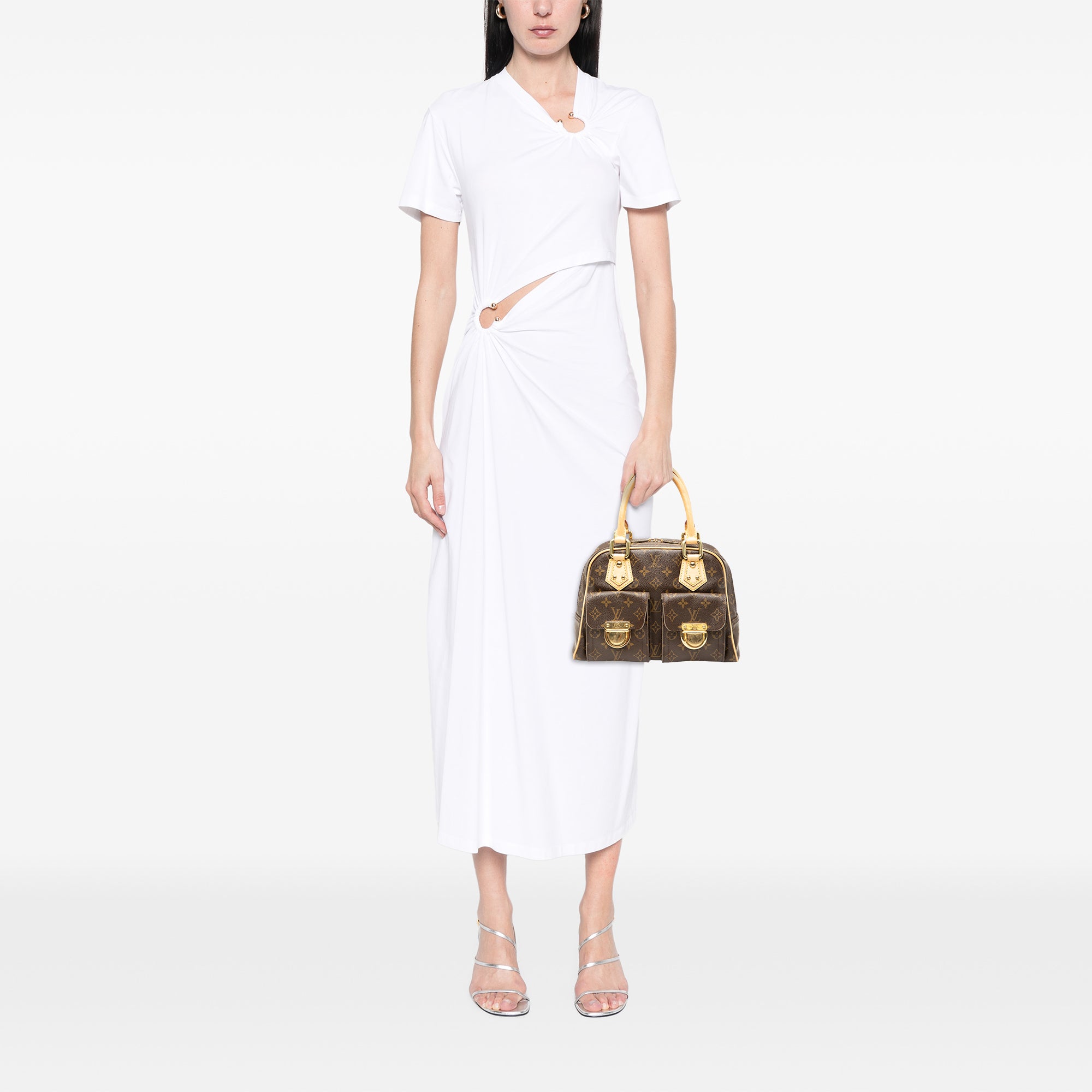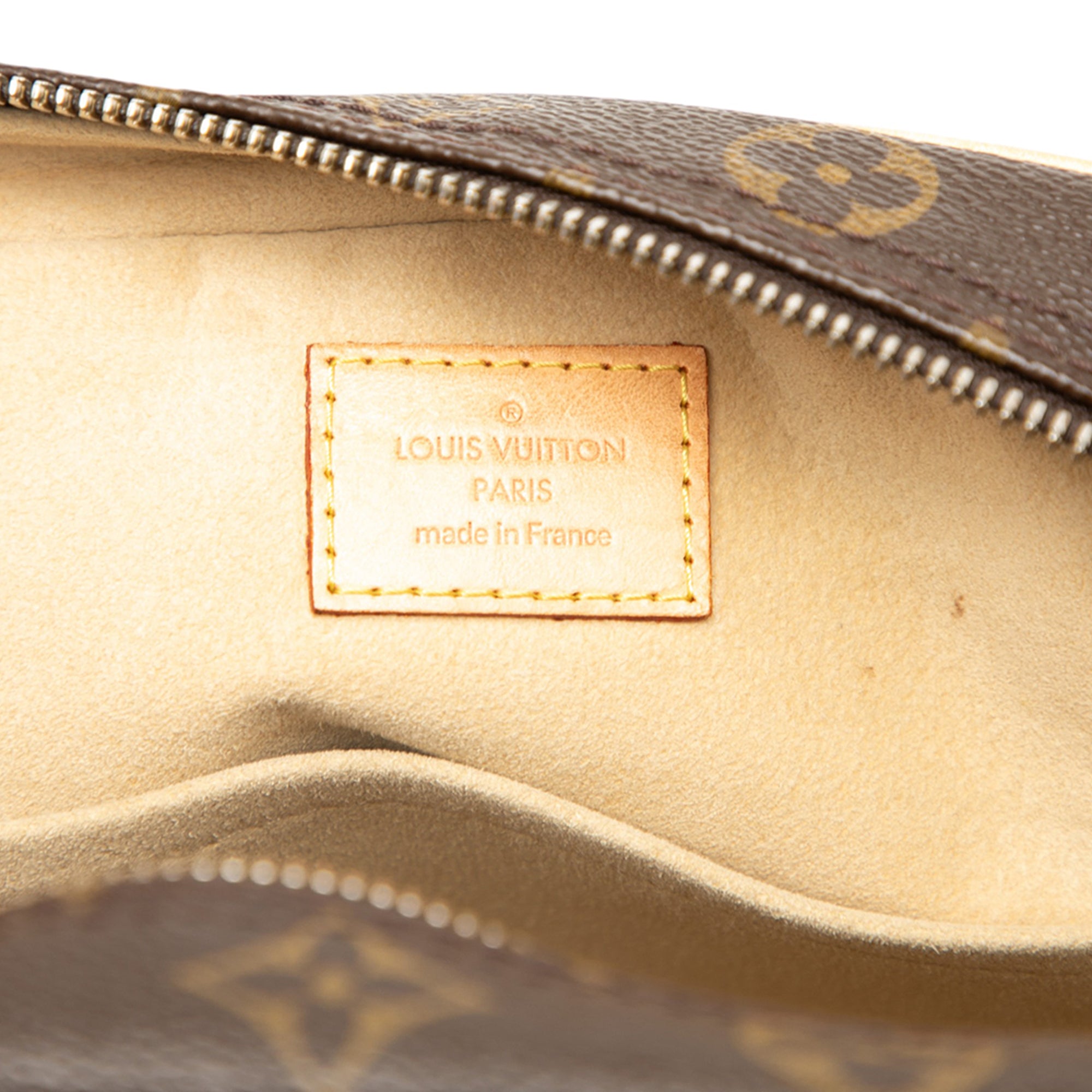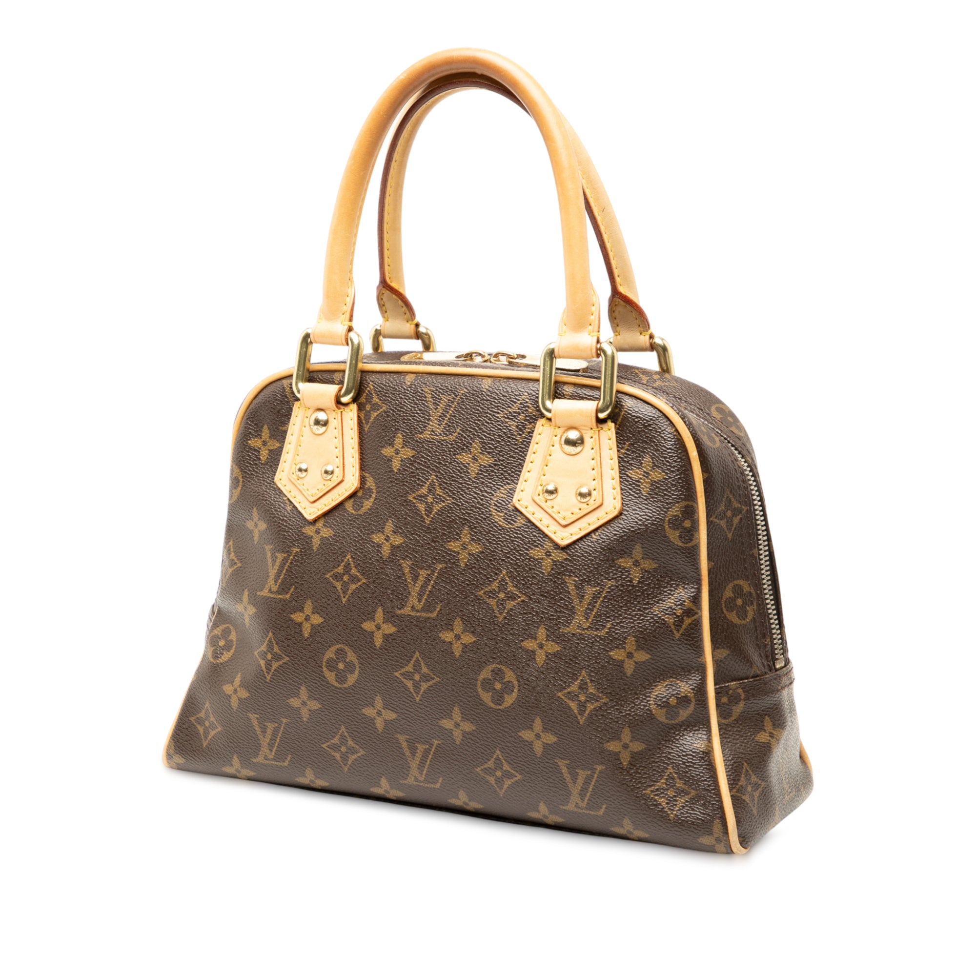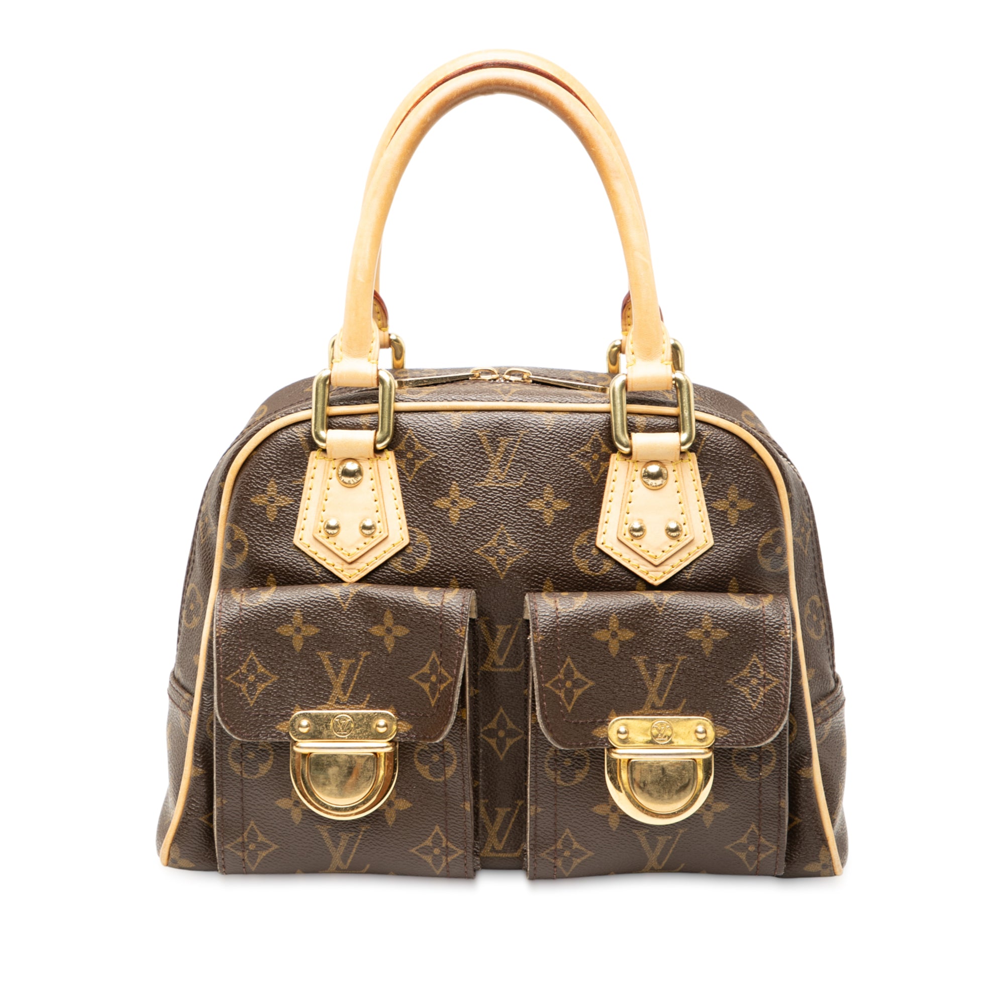 The Manhattan PM features a monogram canvas body with vachetta leather trim, rolled vachetta leather handles, a top zip closure, exterior flap pockets with push lock closures, and an interior slip pocket. Retail Price: 1413.00