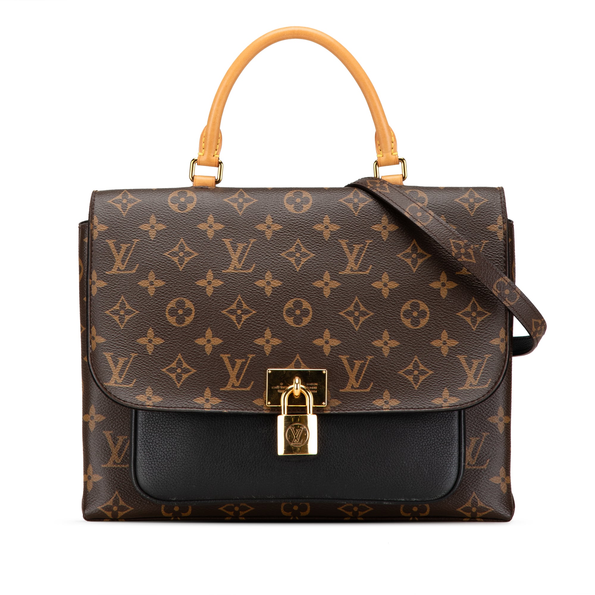 The Marignan features a monogram canvas body, a rolled vachetta leather top handle, a detachable flat monogram canvas shoulder strap, a front flap with magnetic snap button closure, and interior pockets. Retail Price: 2230.00