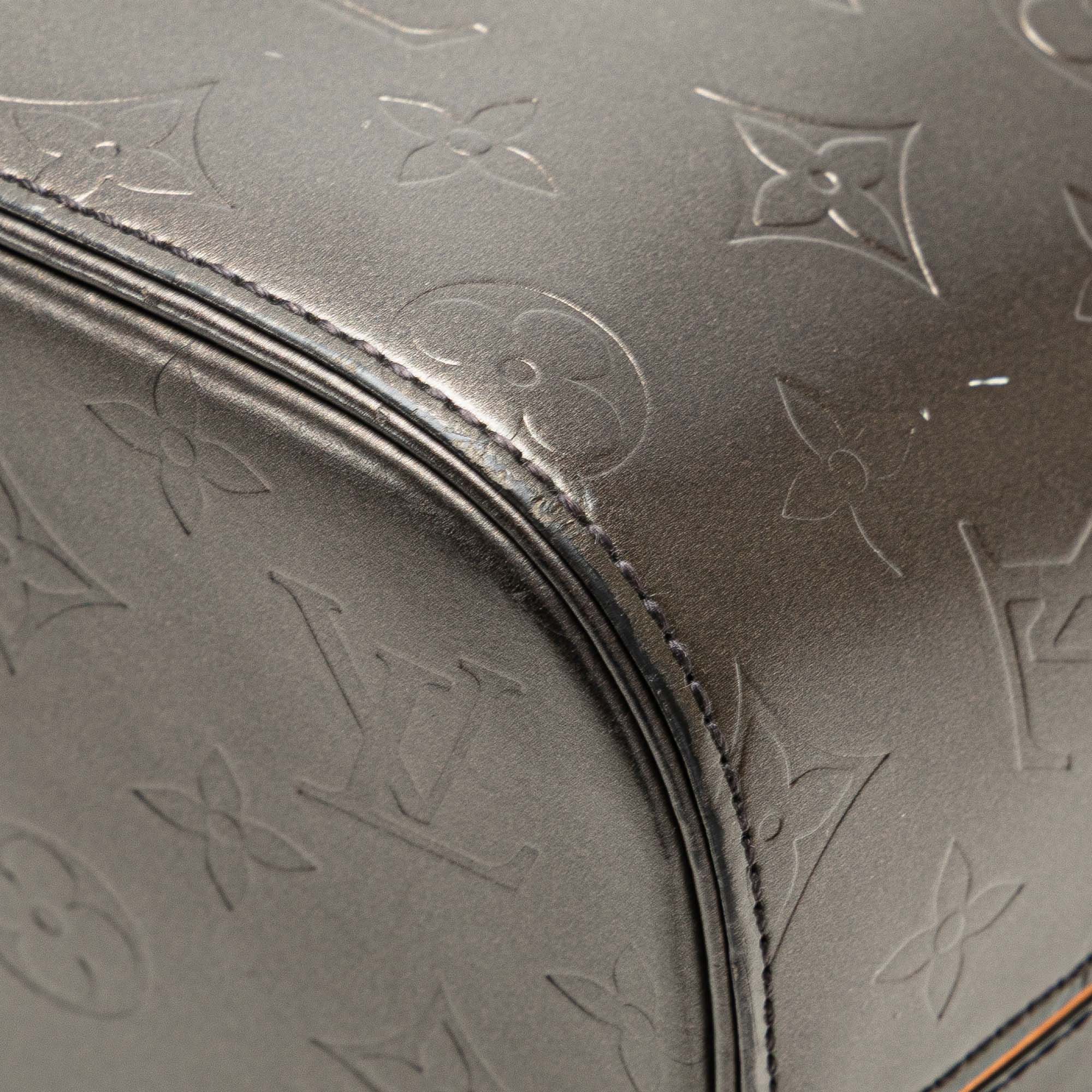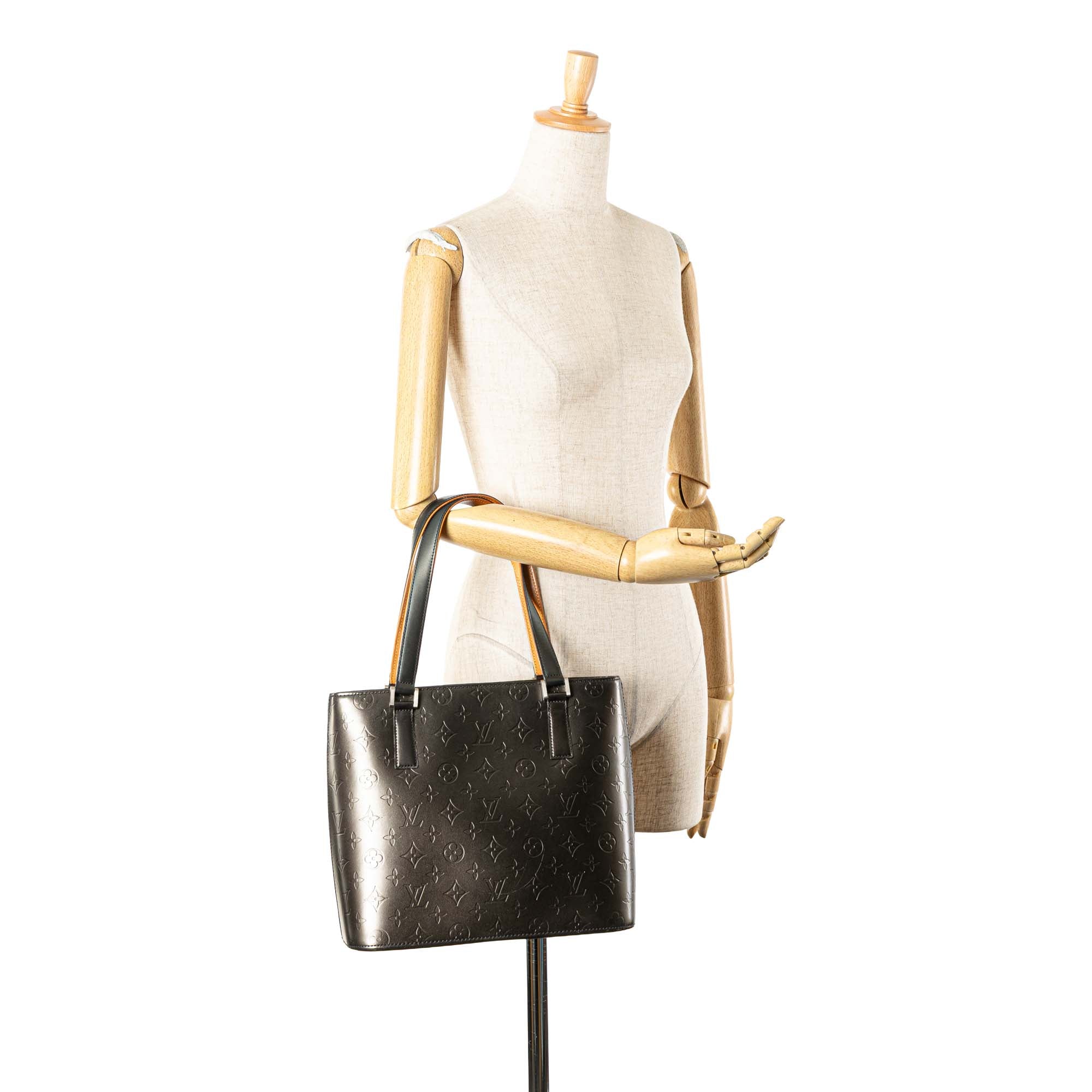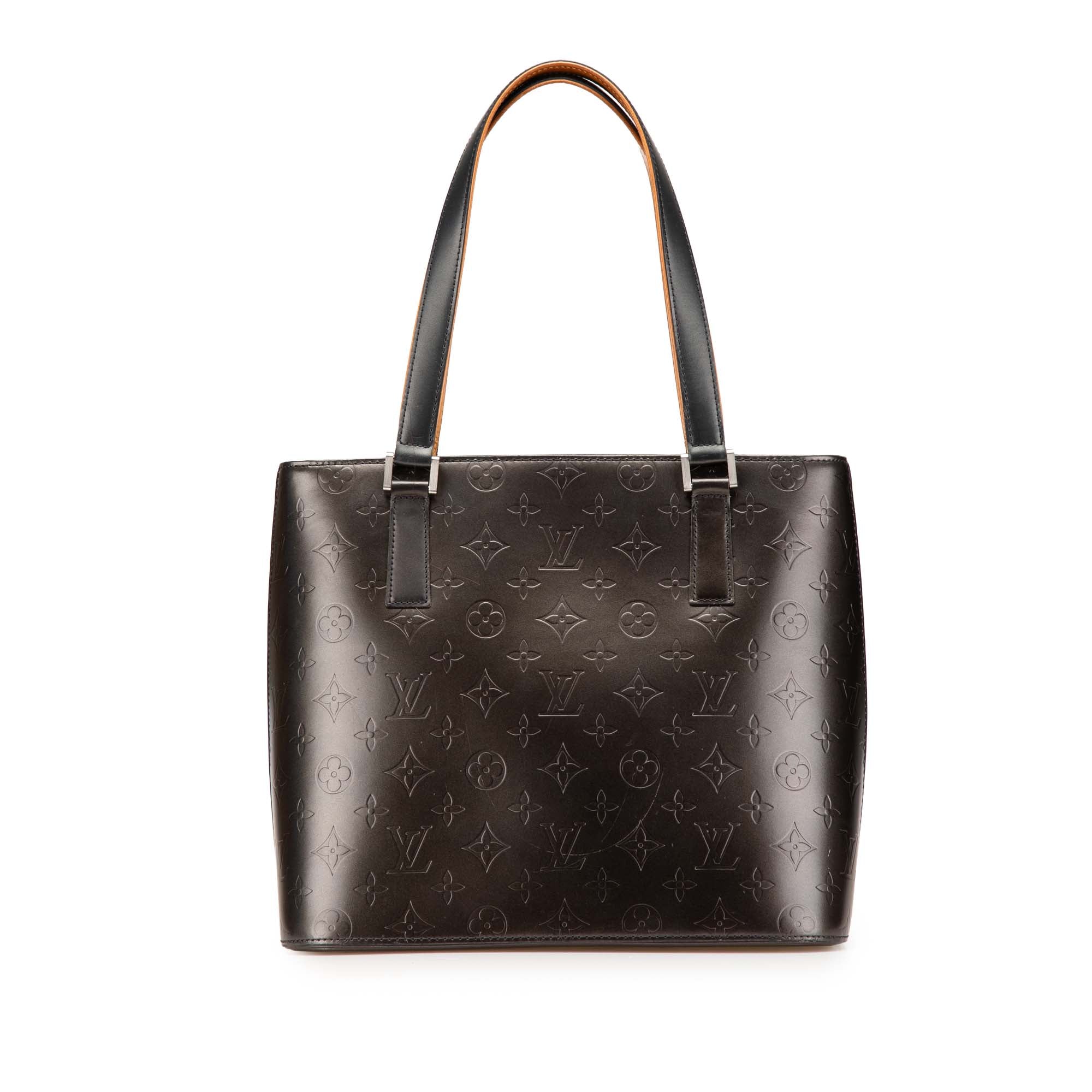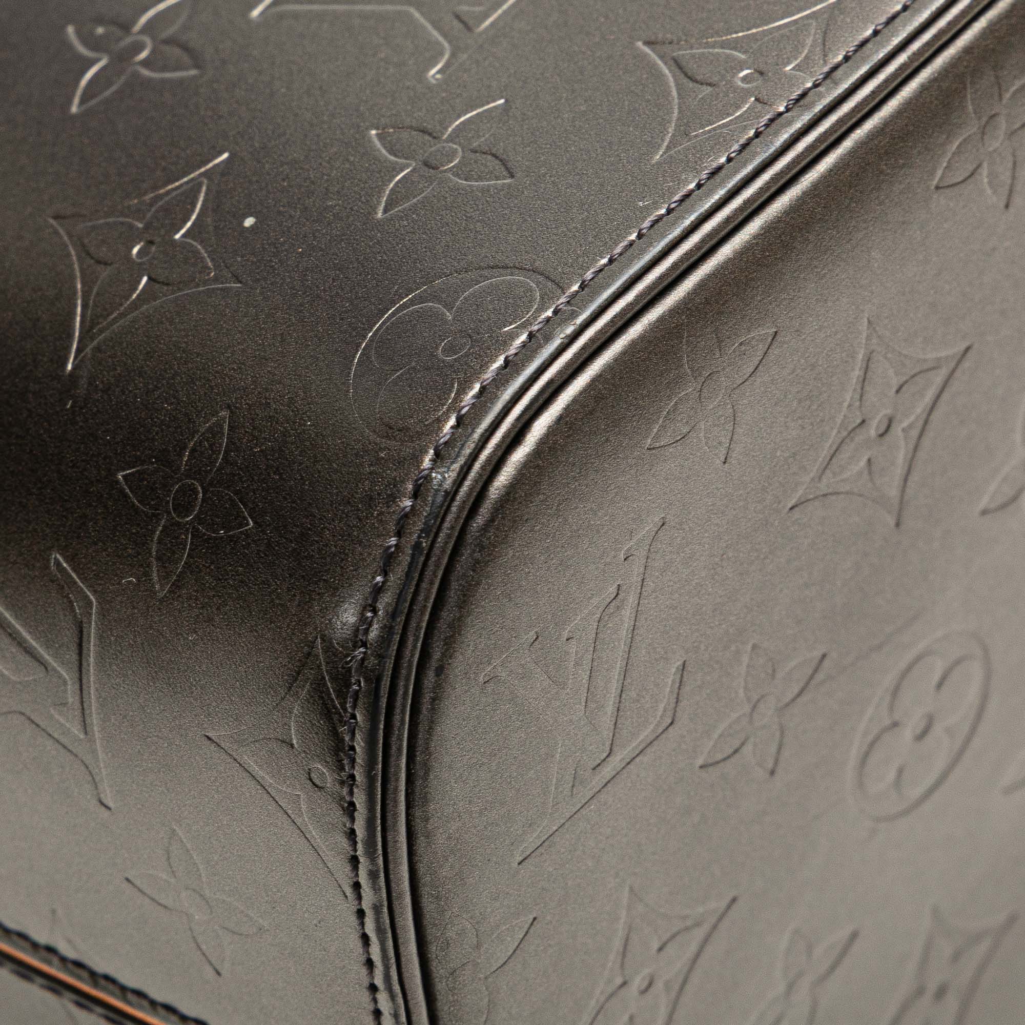 The Mat Stockton features a monogram mat leather body, flat leather handles, a top zip closure, and interior zip and slip pockets. Retail Price: 1250.00