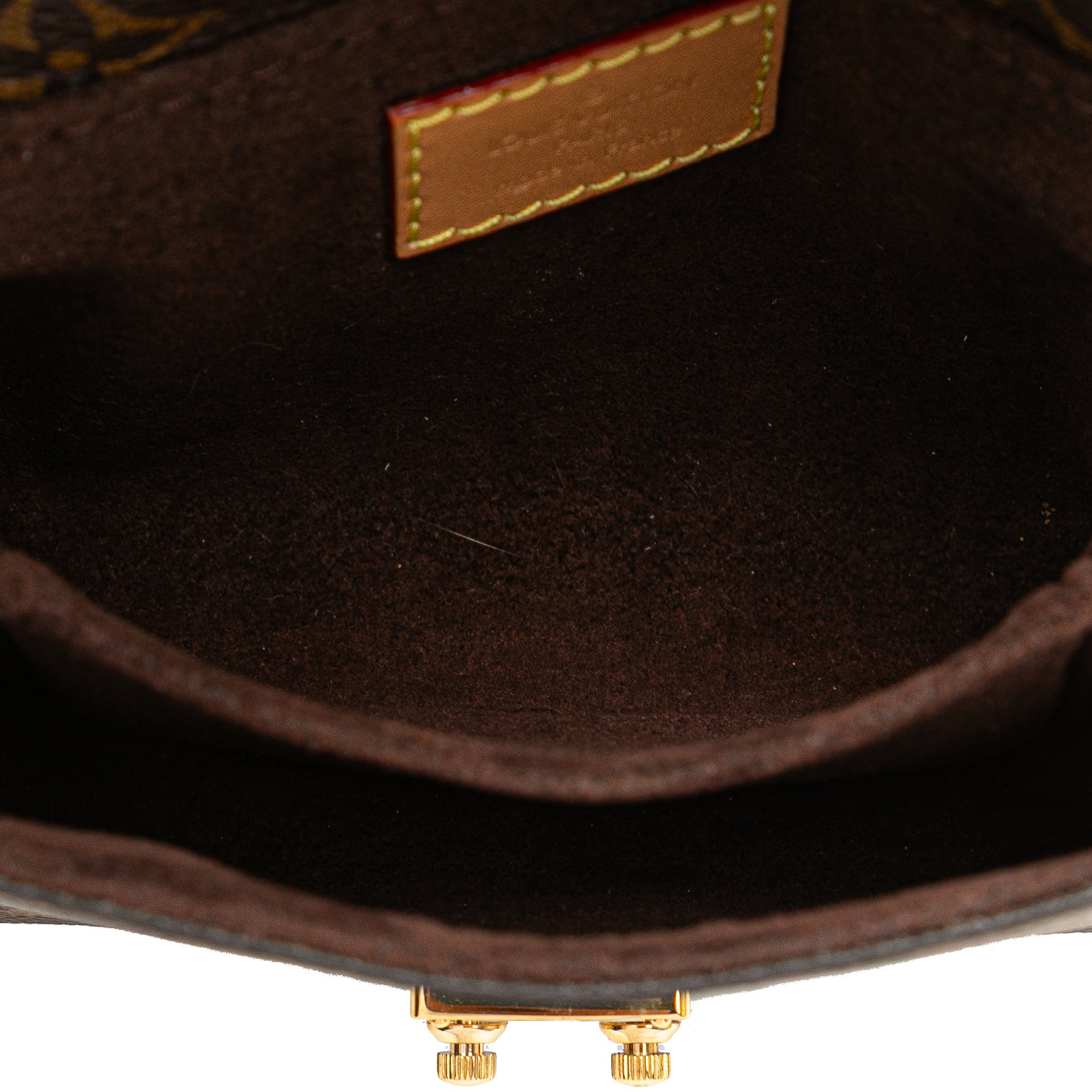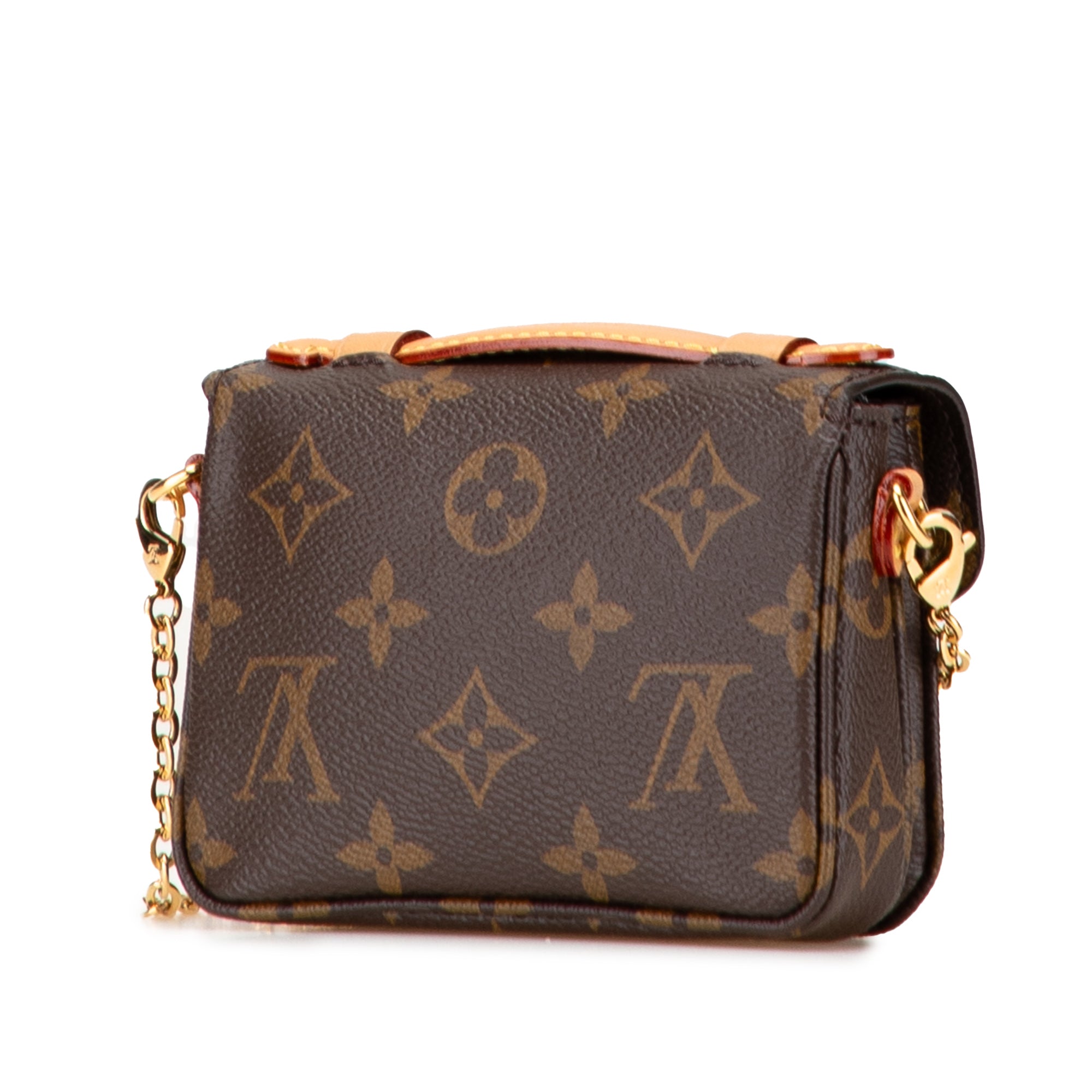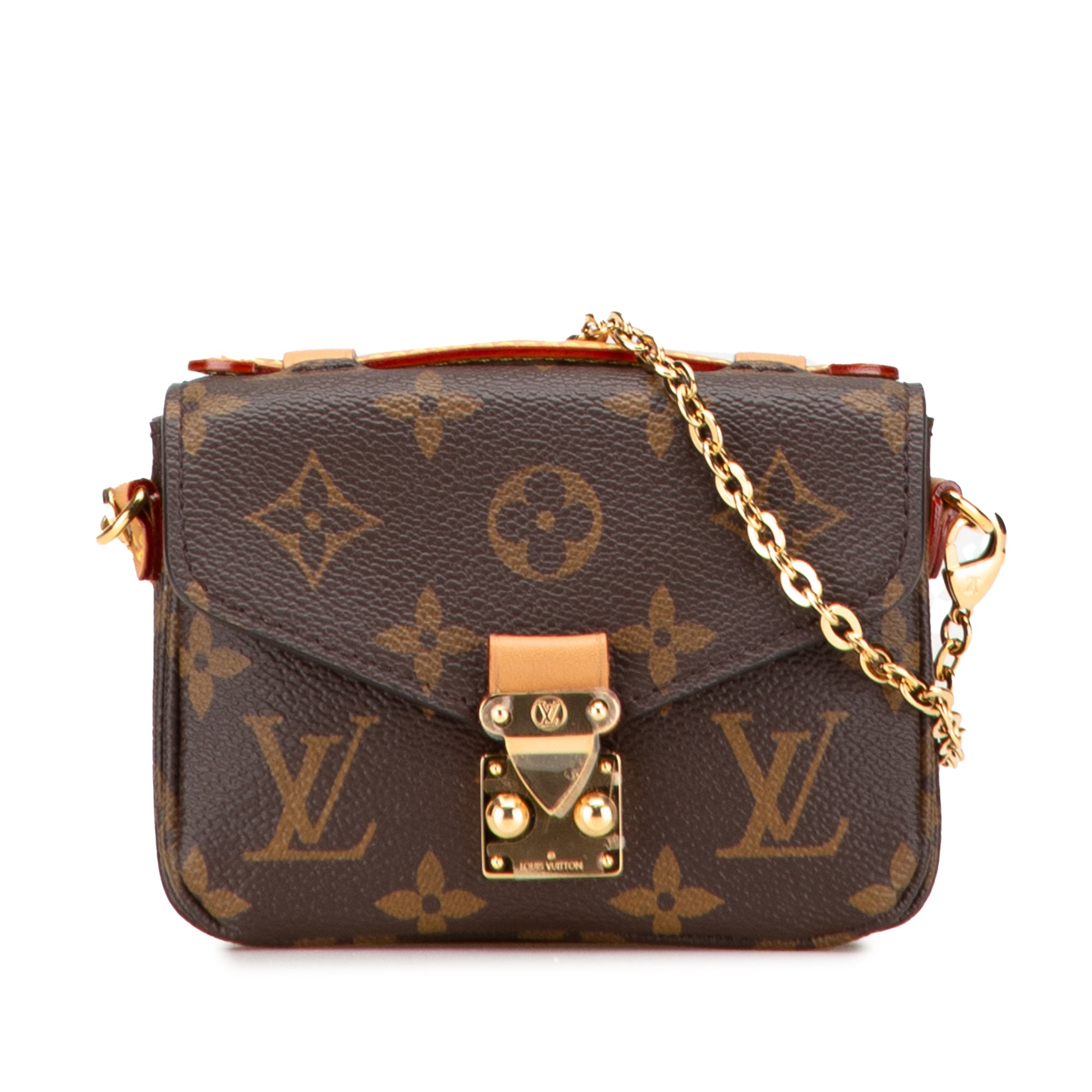 The Micro Metis features a monogram canvas body, a flat vachetta leather top handle, a detachable gold-tone chain shoulder strap, and a front flap with S-lock closure. Retail Price: 2243.00