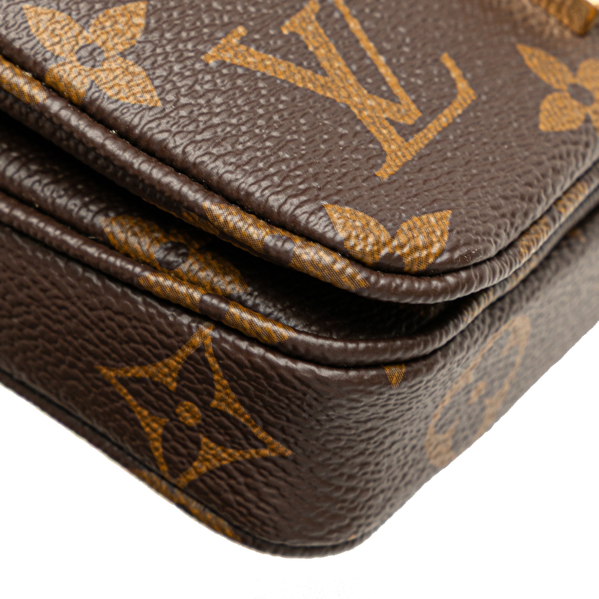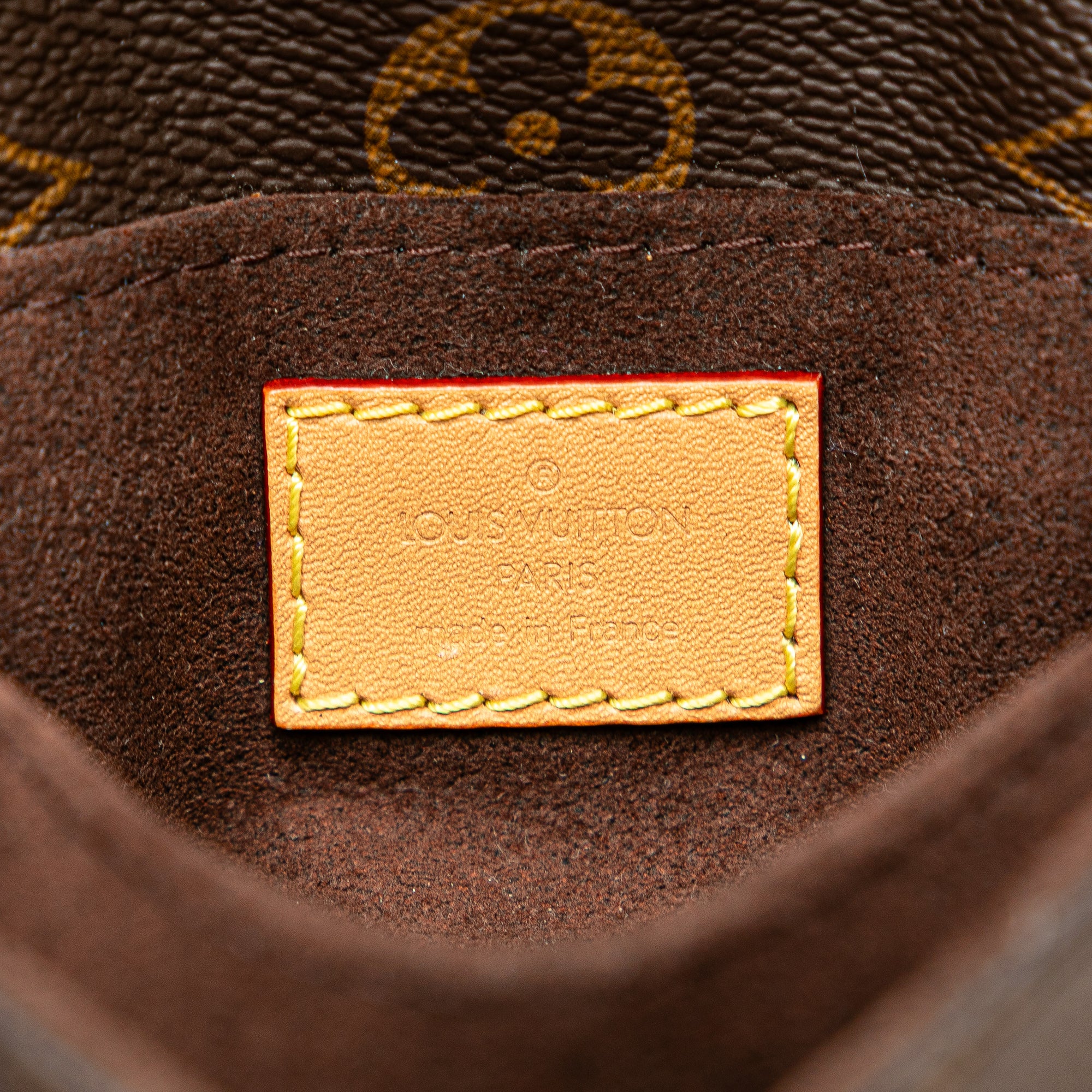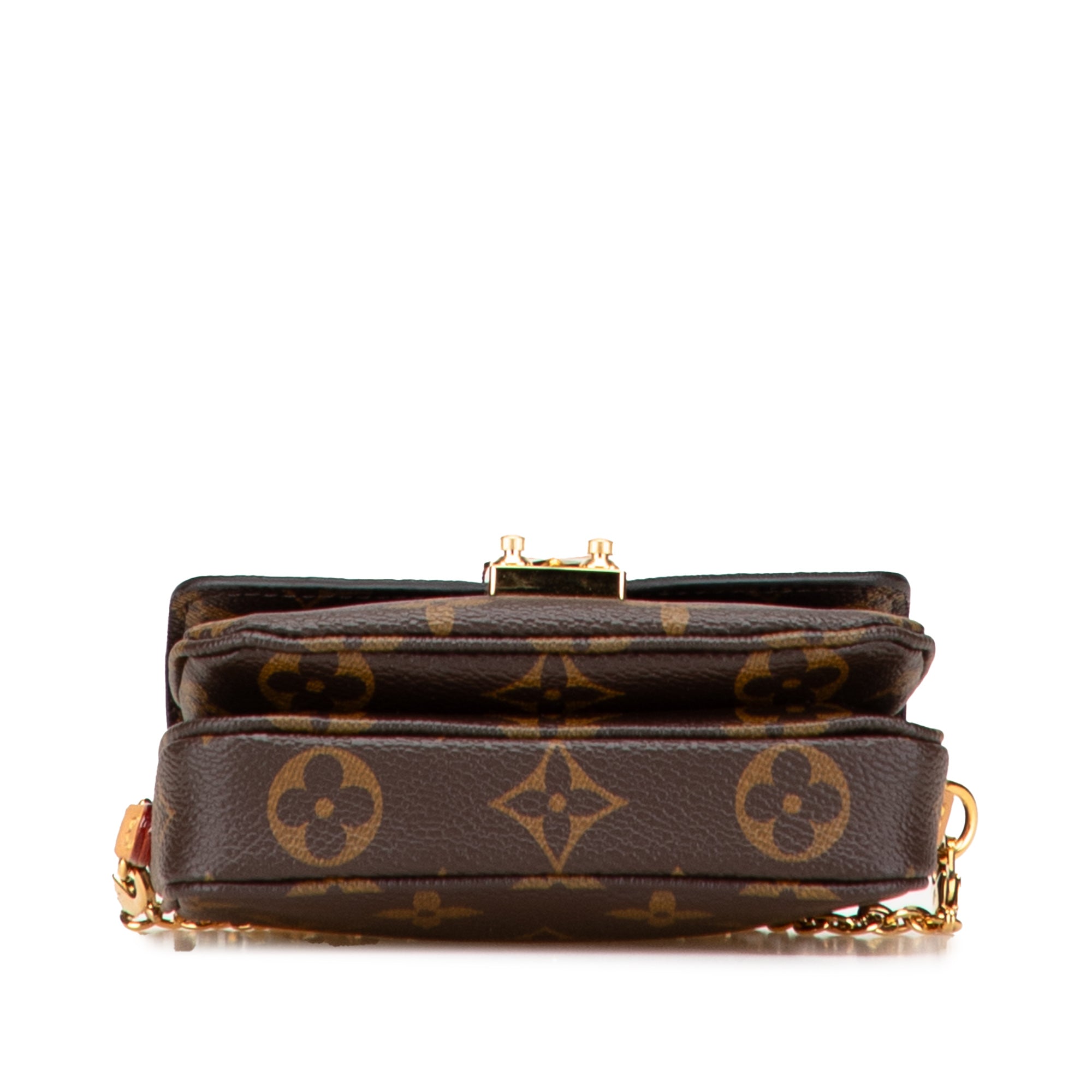 The Micro Metis features a monogram canvas body, a flat vachetta leather top handle, a detachable gold-tone chain shoulder strap, and a front flap with S-lock closure. Retail Price: 2243.00