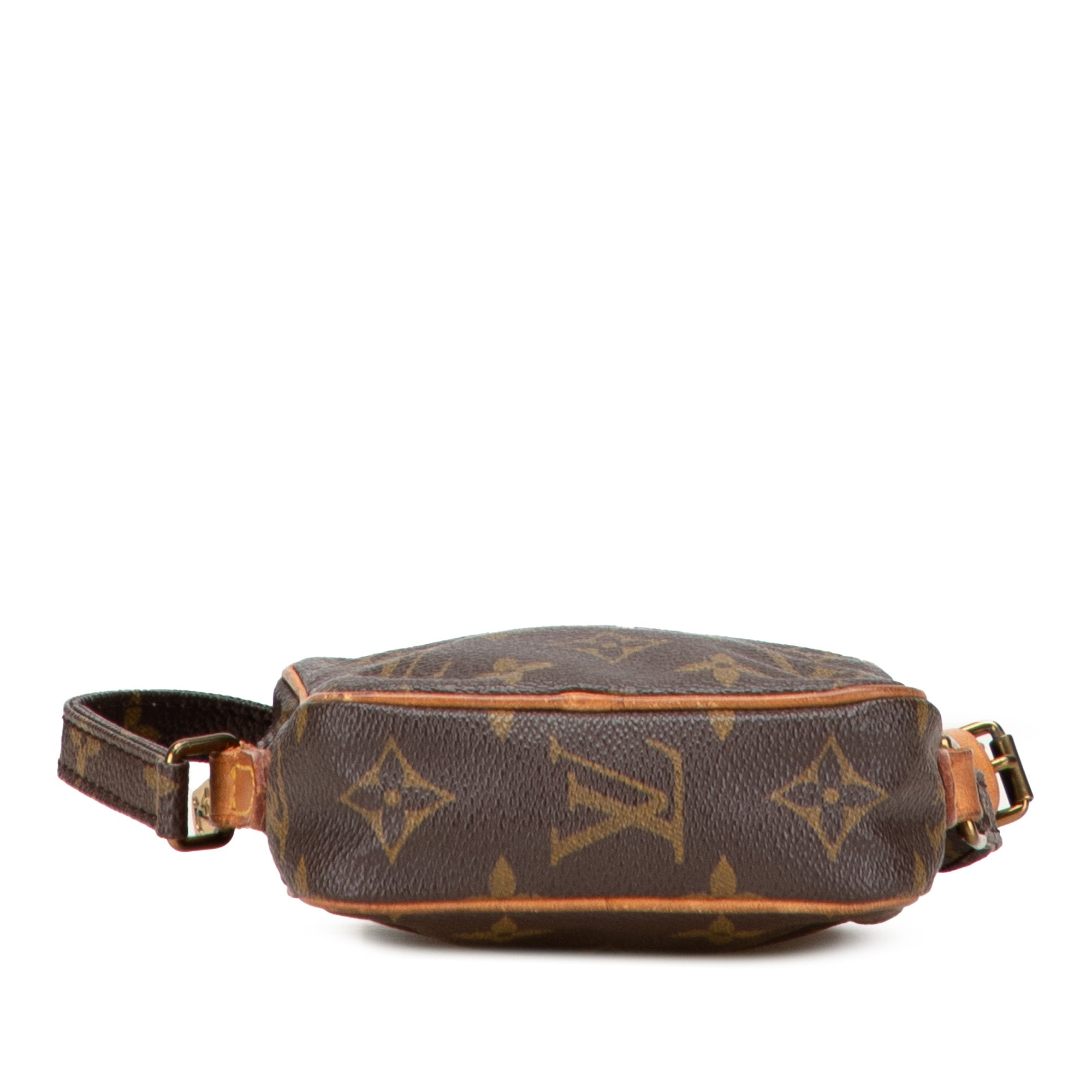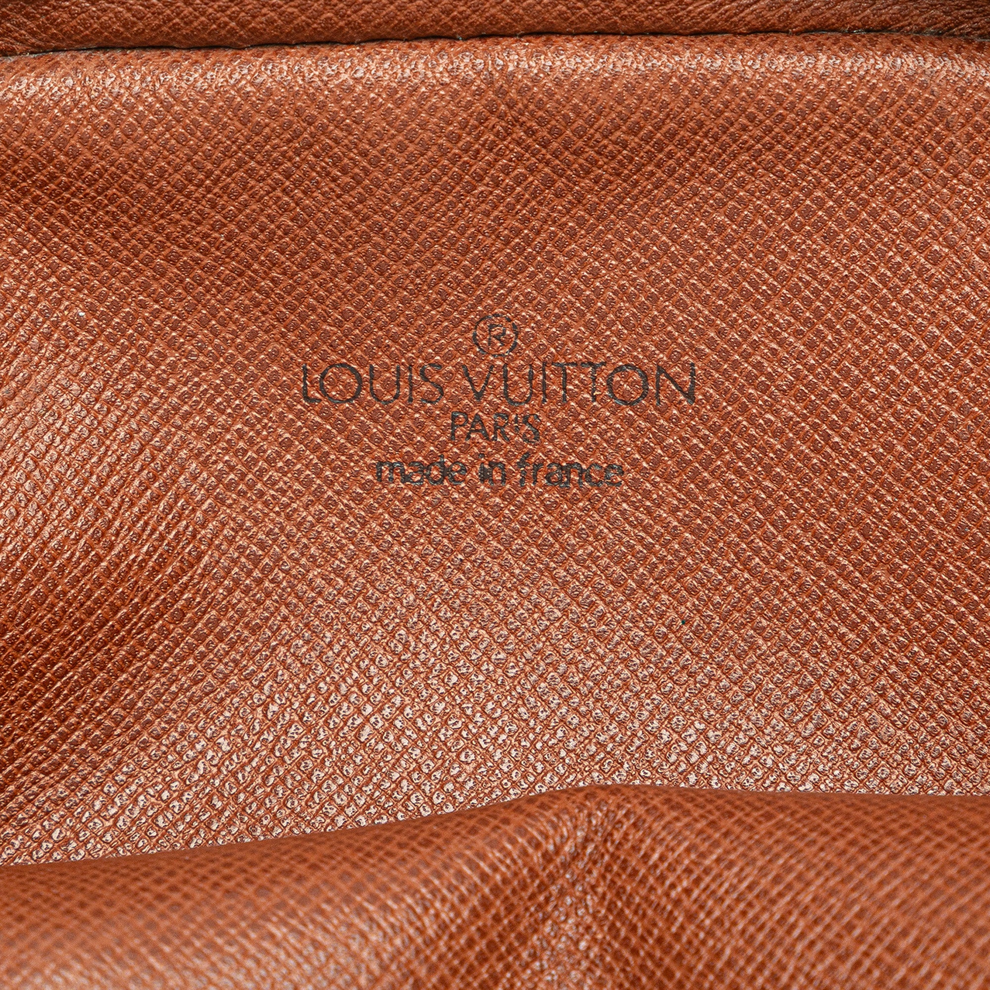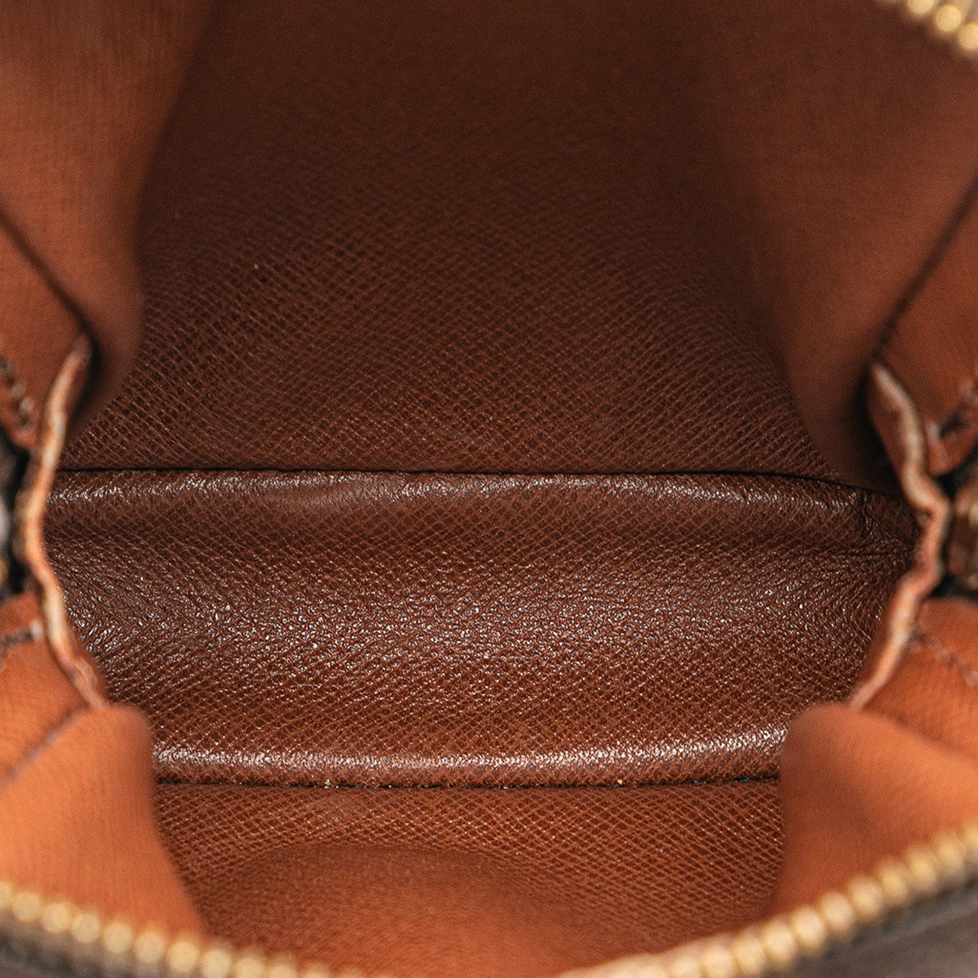 The Mini Danube features a monogram canvas body with vachetta leather trim, an adjustable flat leather shoulder strap, and a top zip closure. Retail Price: 700.00