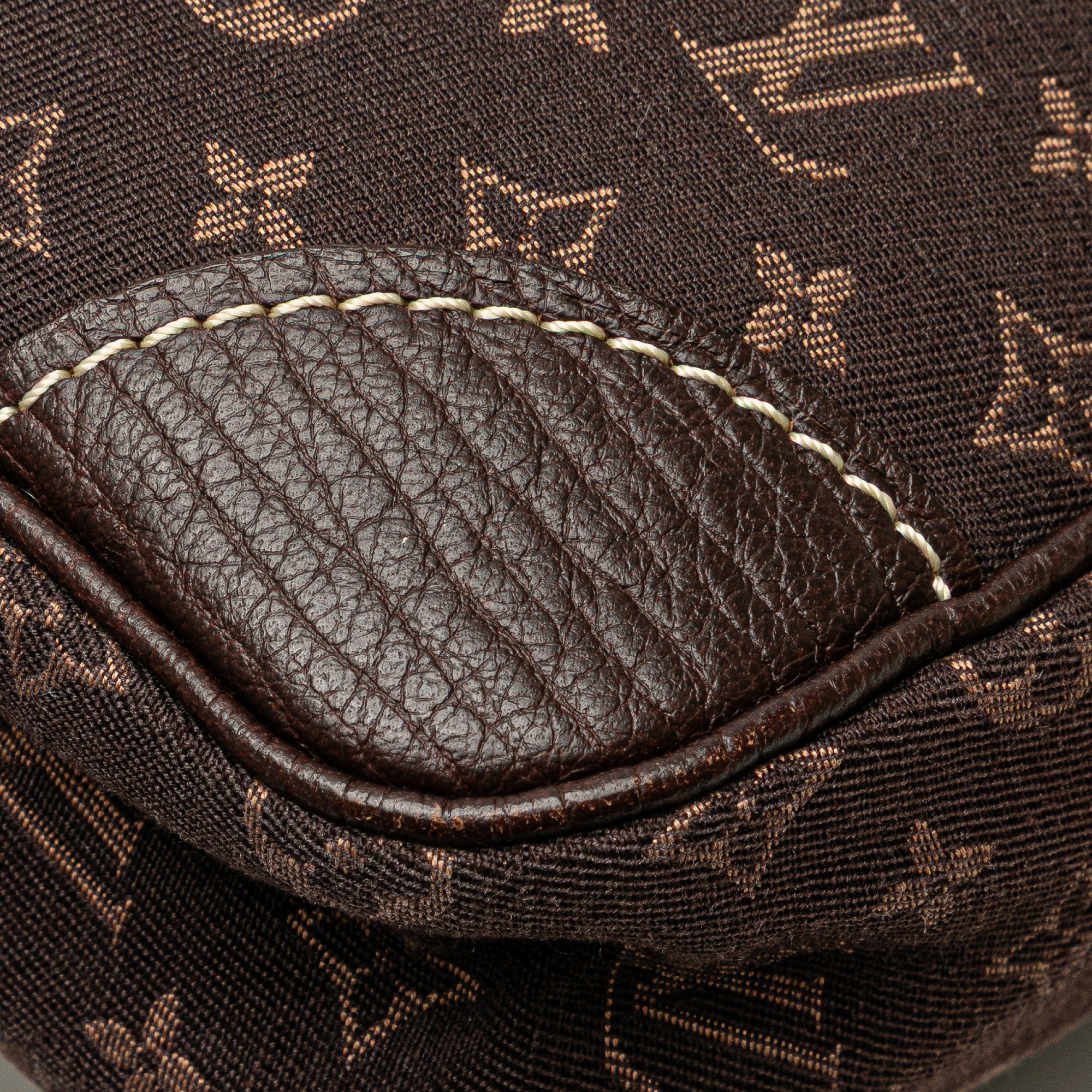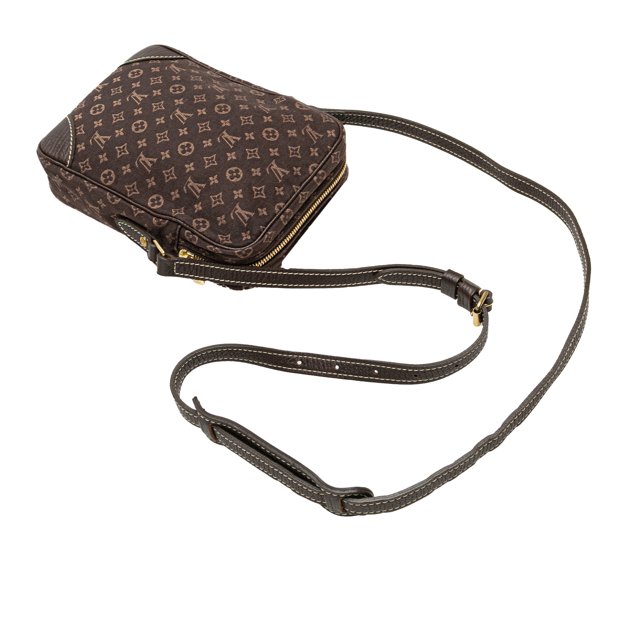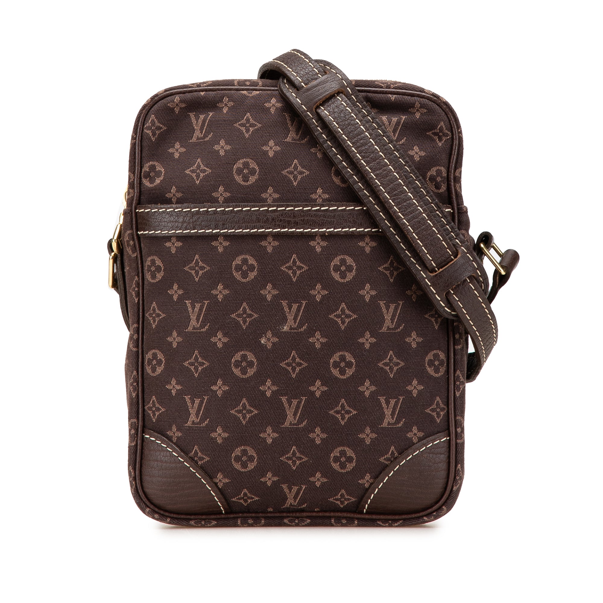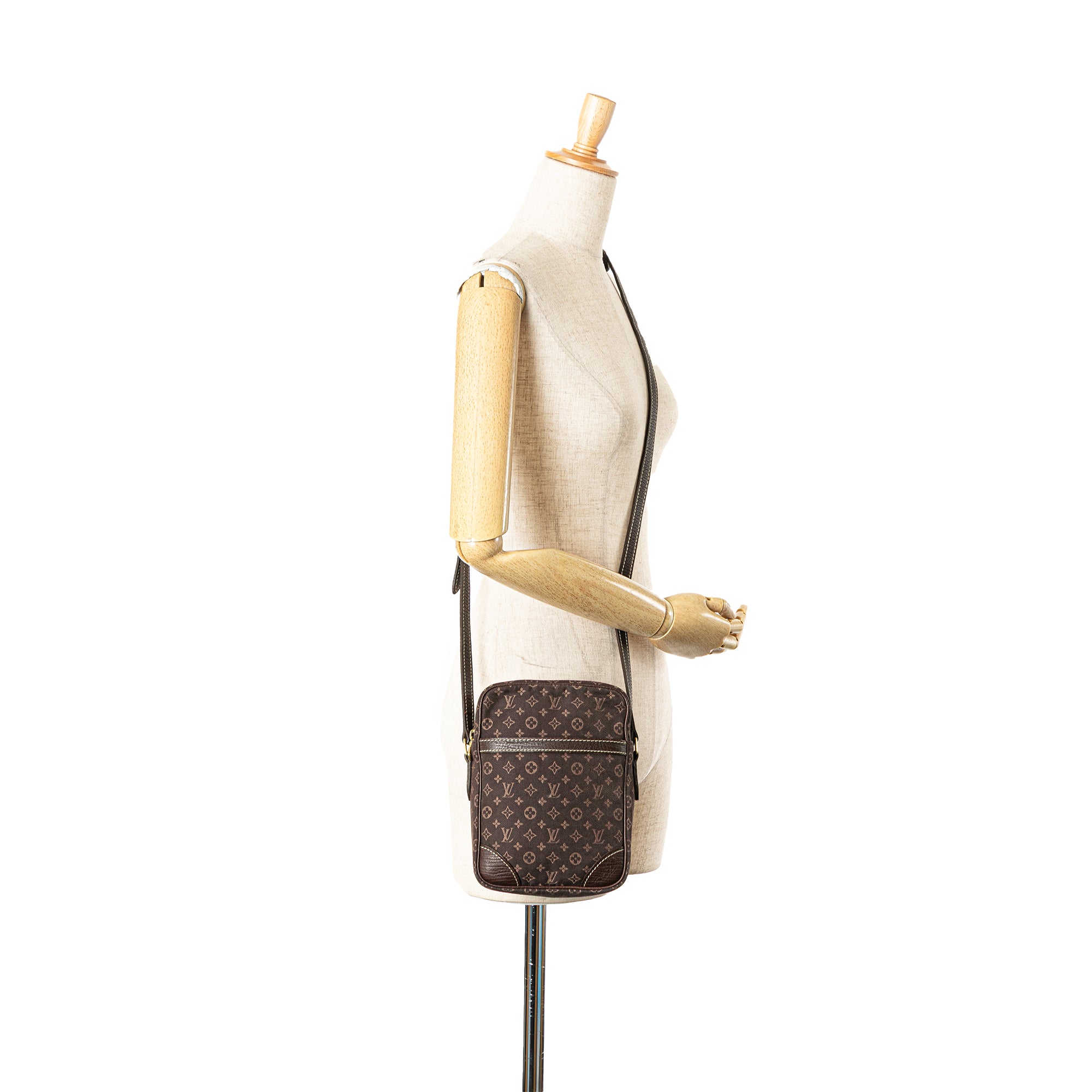 The Danube features a monogram mini lin body with leather trim, an adjustable flat leather strap, a top zip closure, an exterior slip pocket, and an interior slip pocket. Retail Price: 855.00