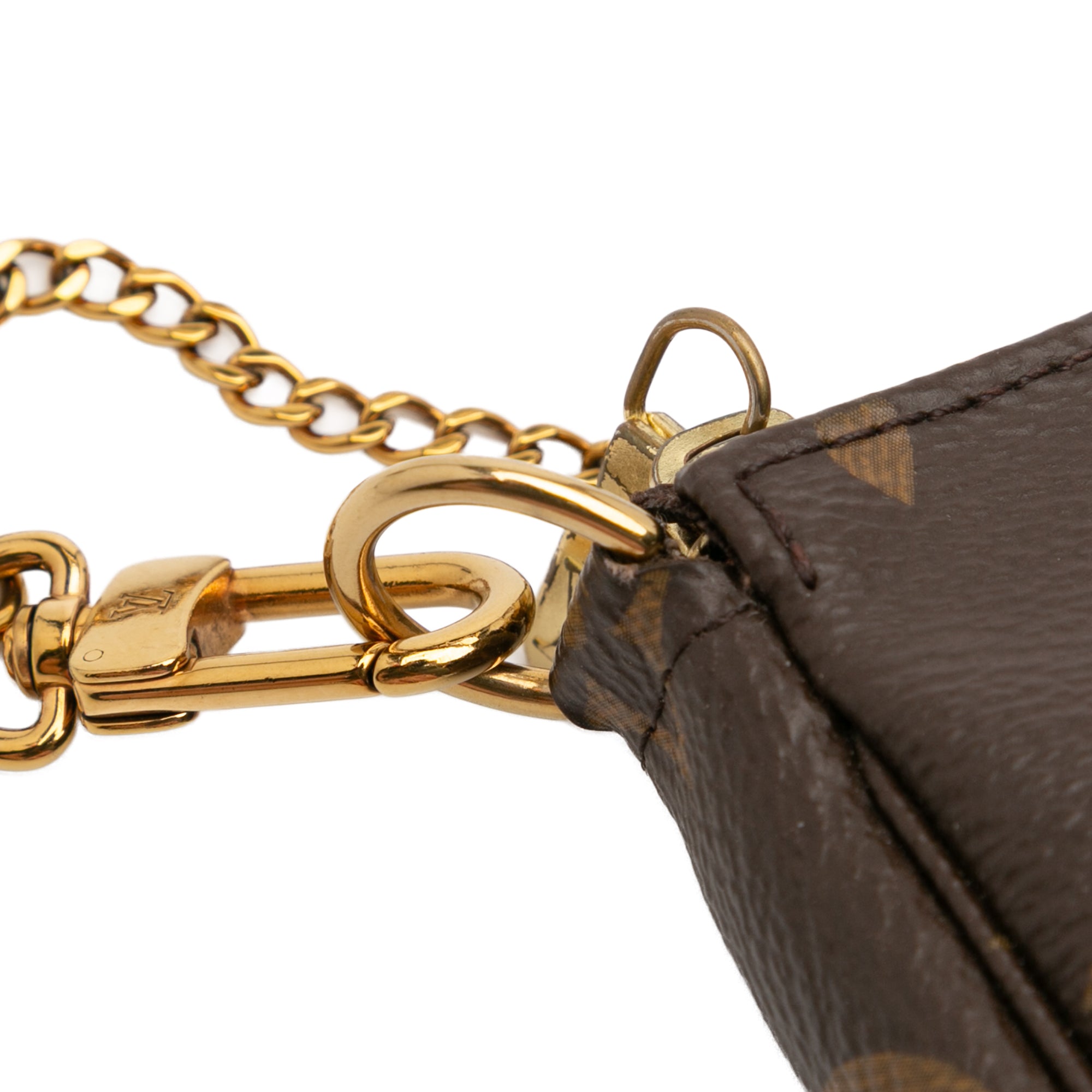 The Mini Pochette Accessoires features a monogram canvas body, a gold-tone chain strap, and a top zip closure. Retail Price: 868.00