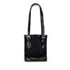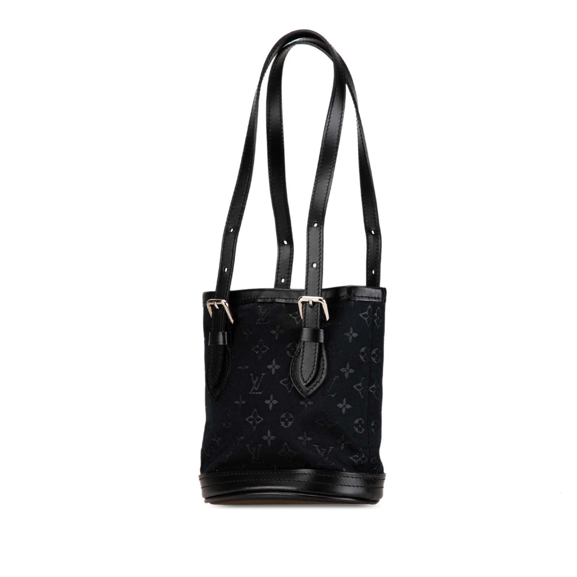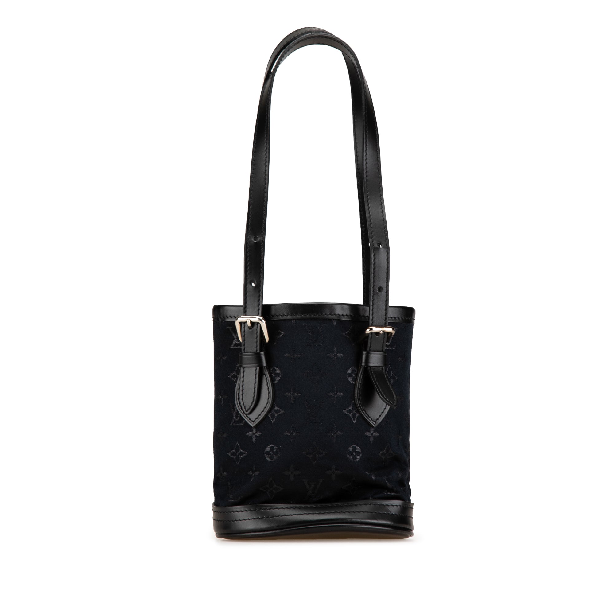 This bucket bag features a monogram satin body with leather trim, flat leather straps, and an open top. Retail Price: 790.00