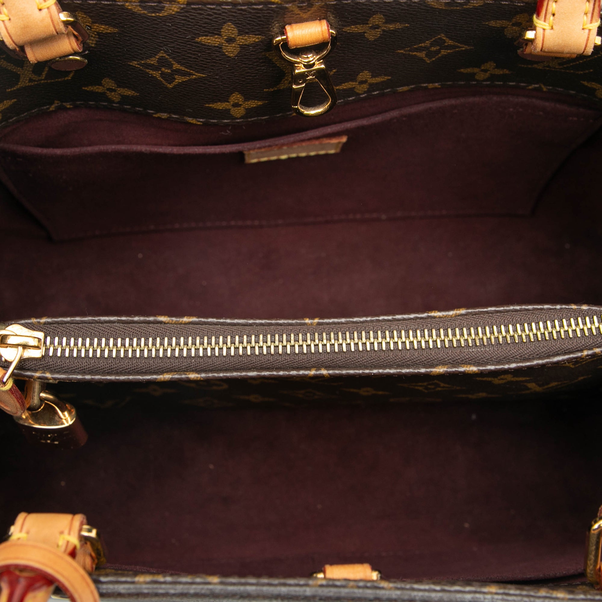 The Montaigne MM features a monogram canvas body, rolled vachetta handles, an open top with a clasp closure, an interior zip compartment, and interior slip pockets. Inclusion: Dust bag. Retail Price: 2593.00