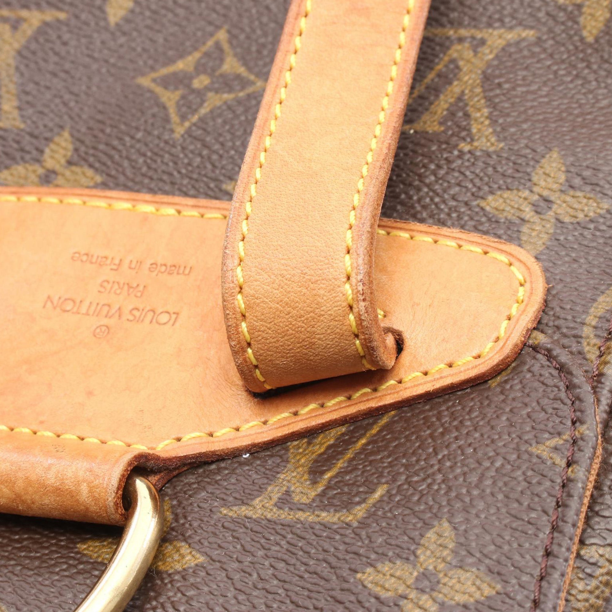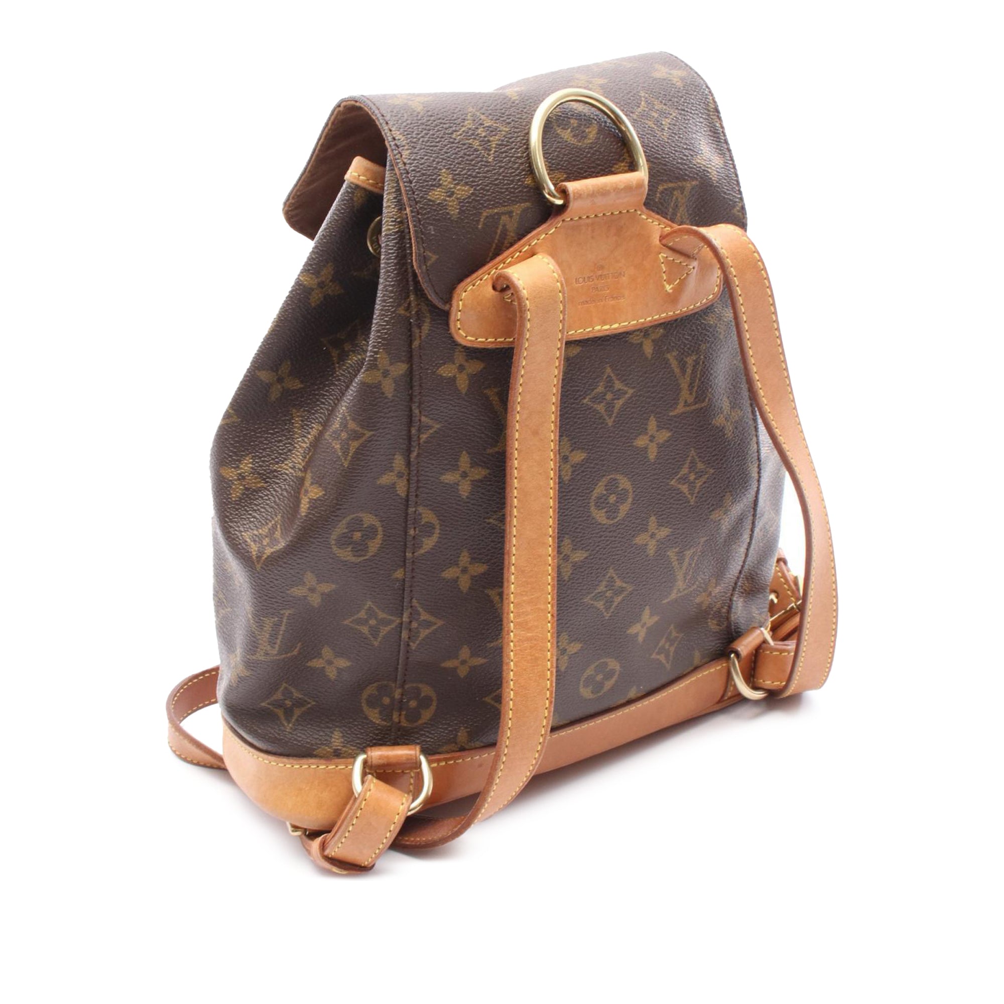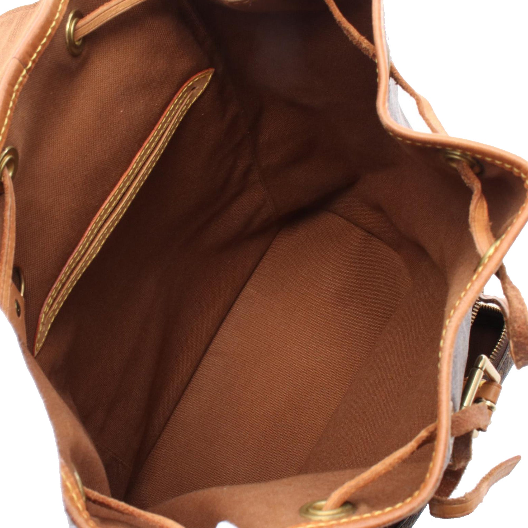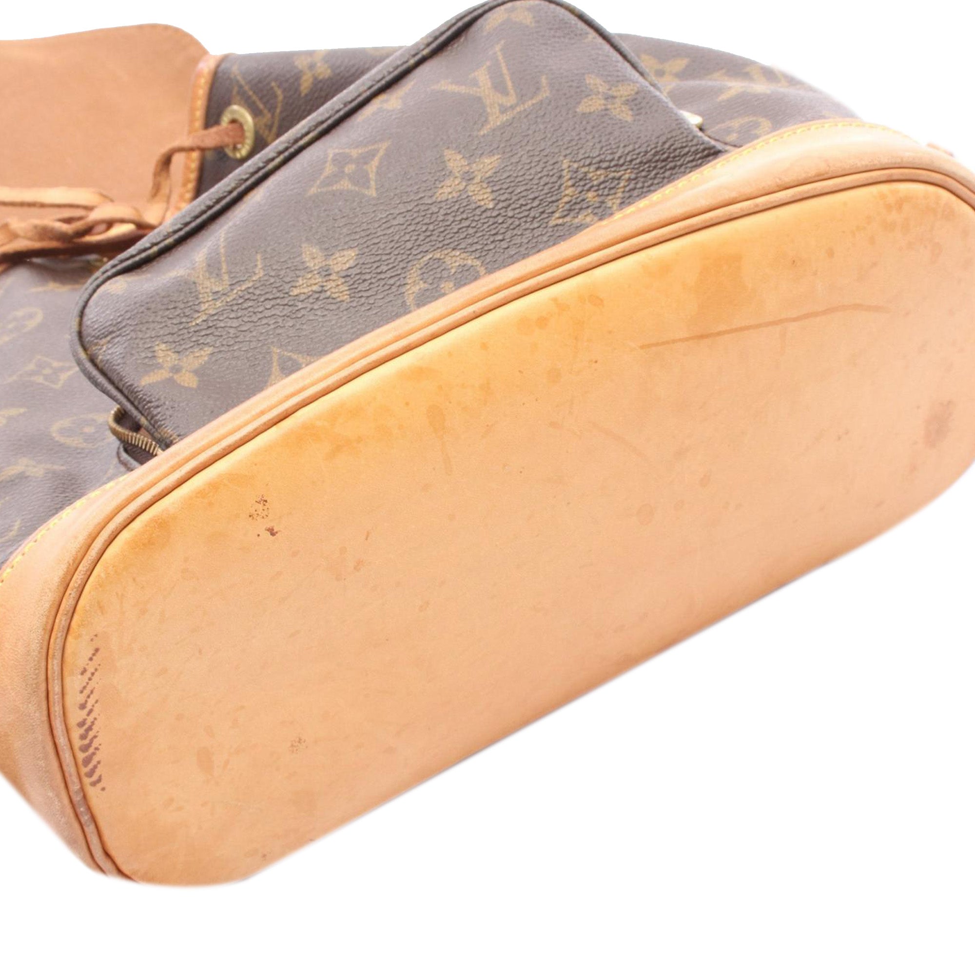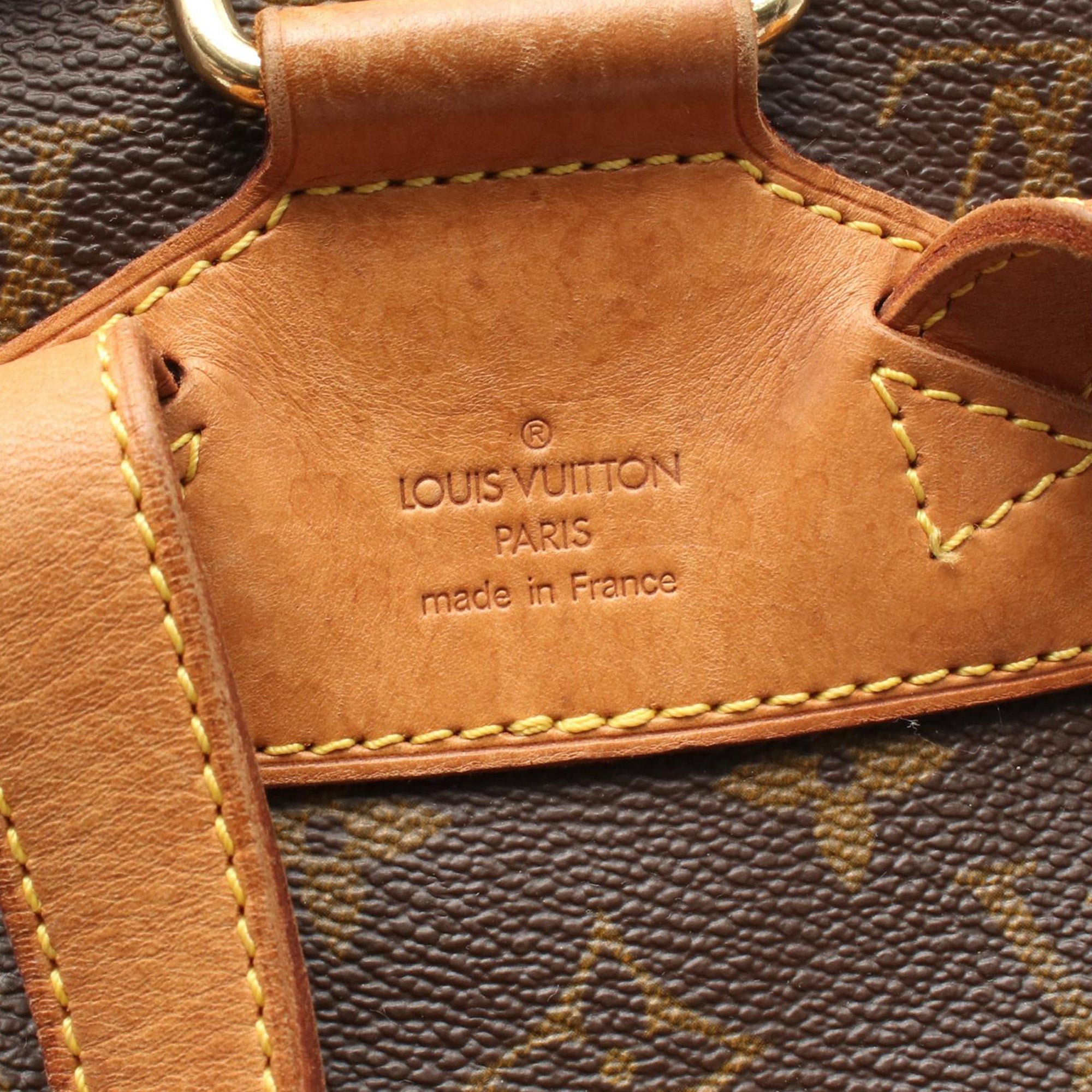 The Montsouris MM features a monogram canvas body with vachetta leather trim, a front flap with a belt buckle detail, a top drawstring closure, an exterior zip pocket, and an interior slip pocket. Retail Price: 1385.00