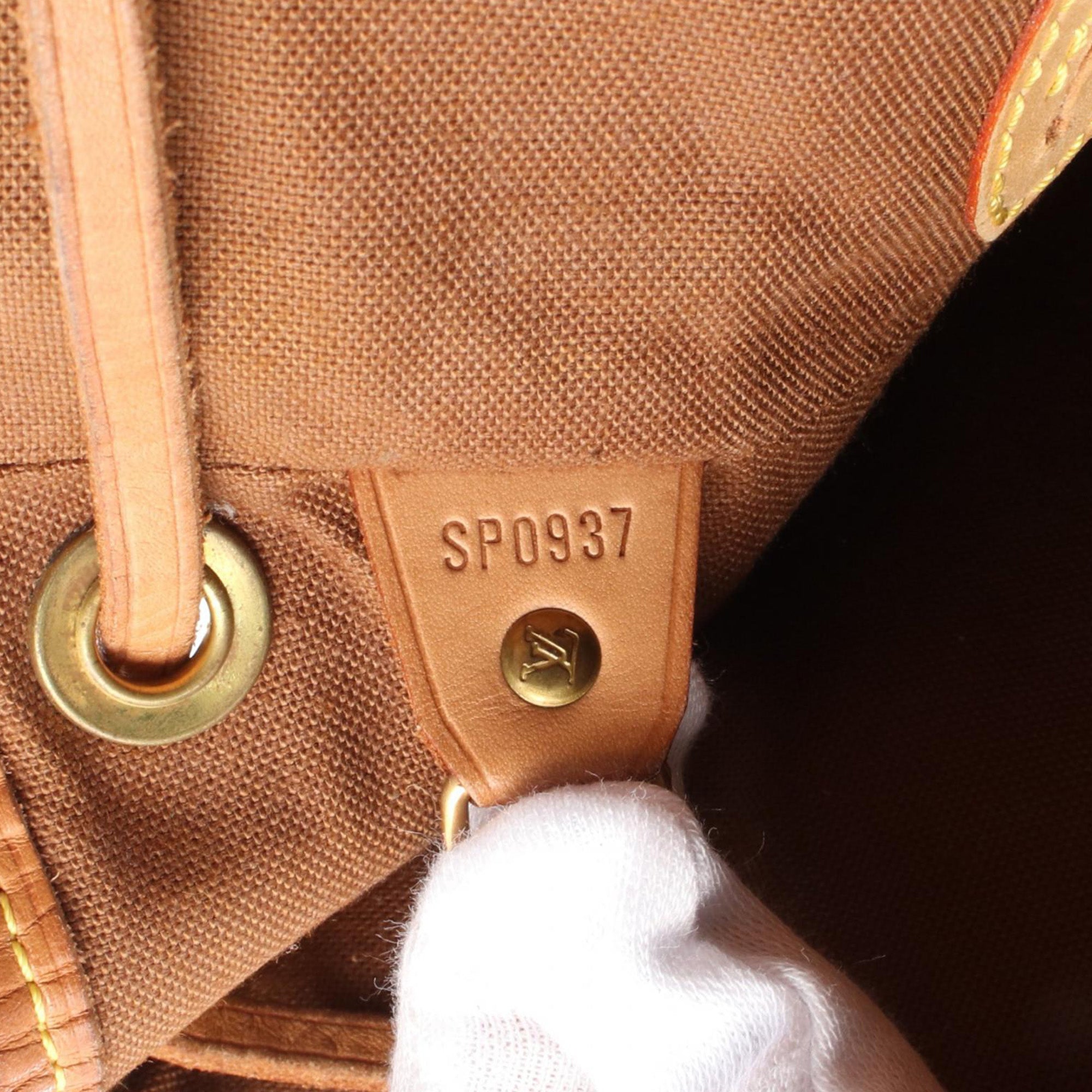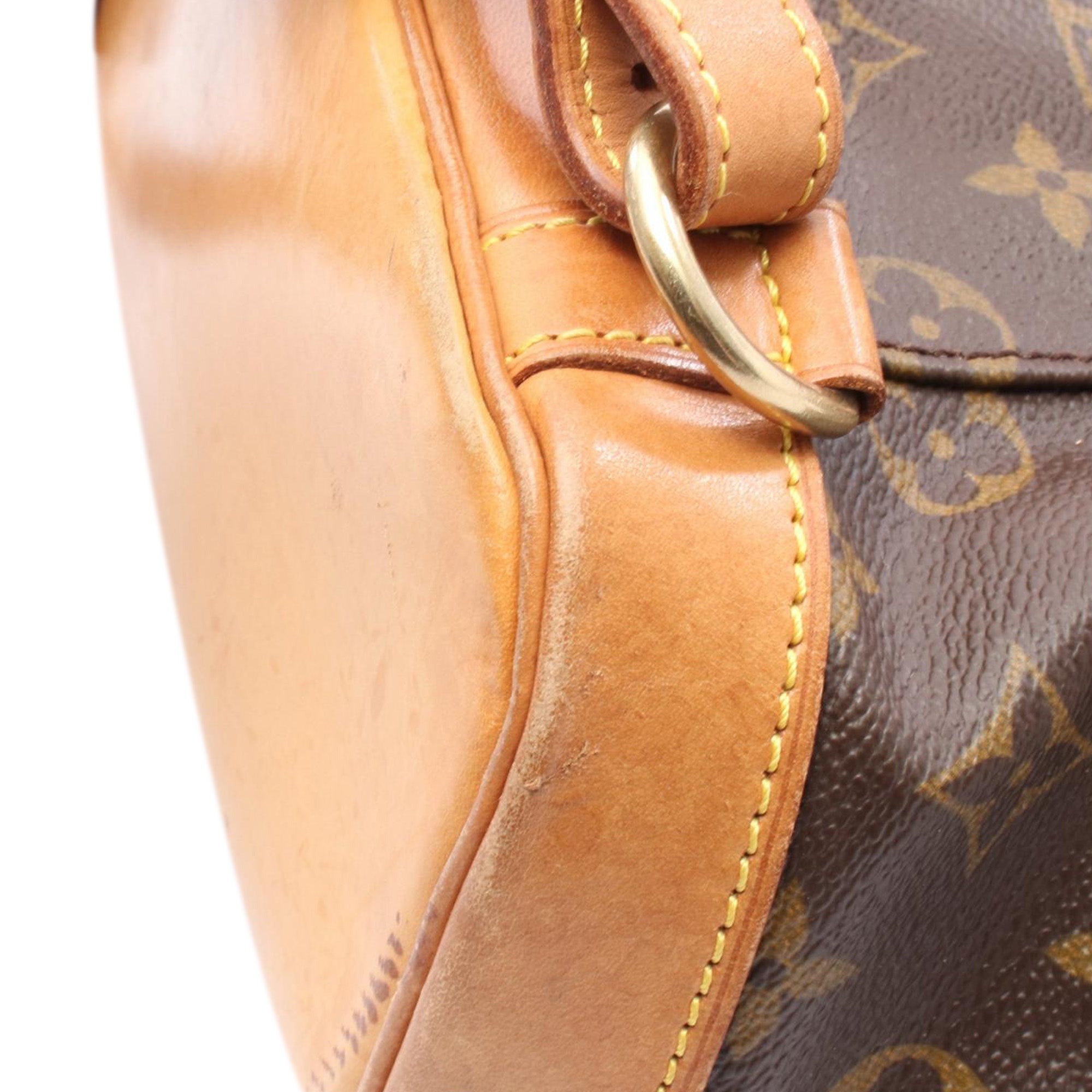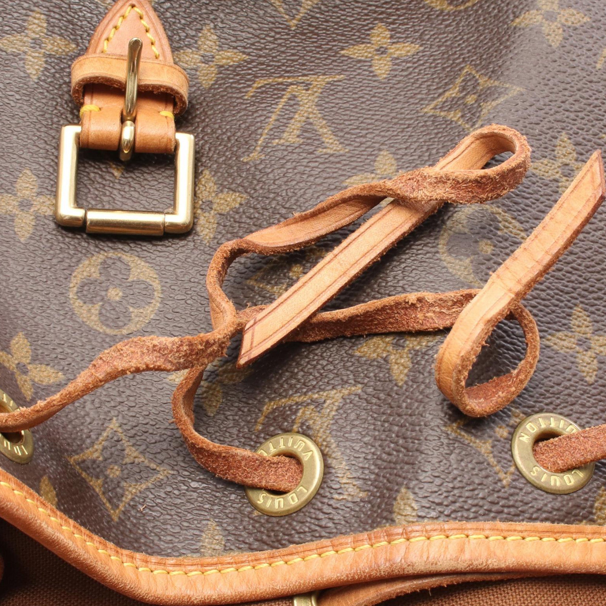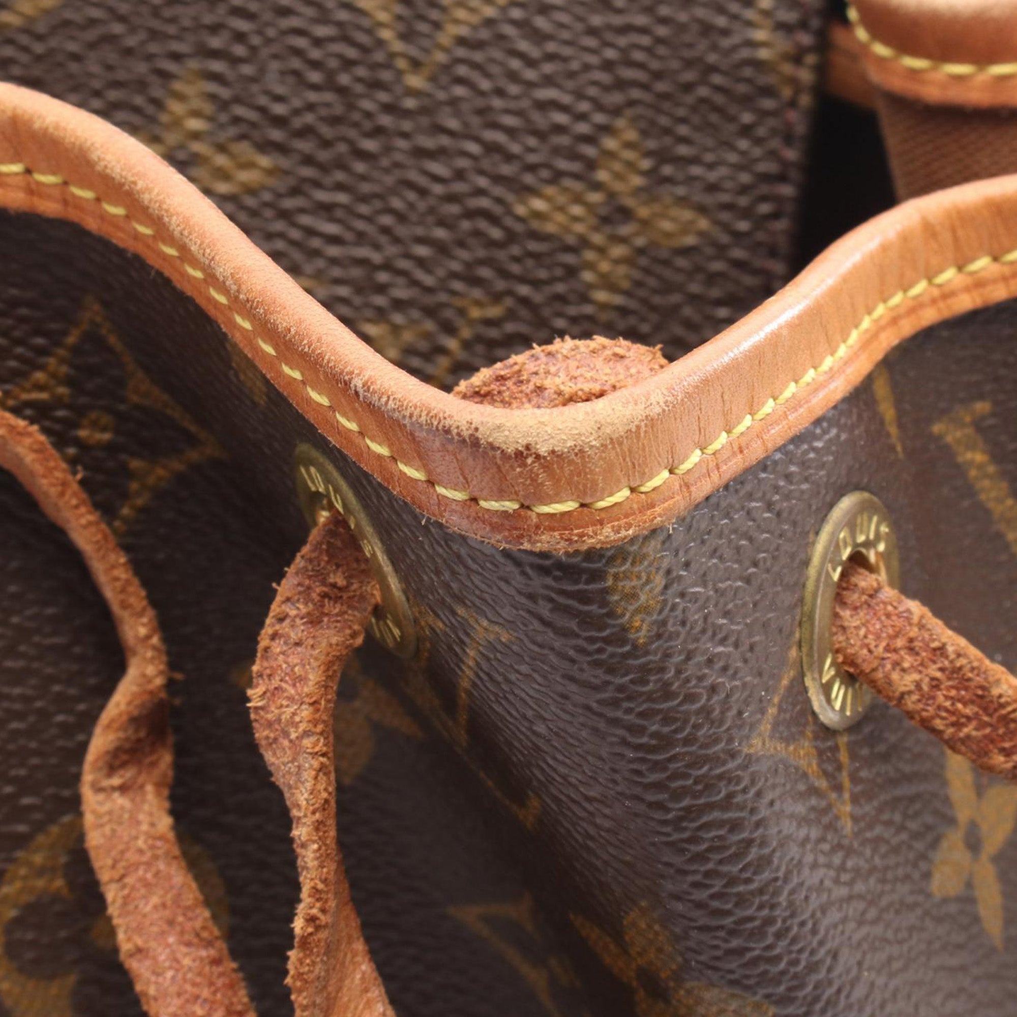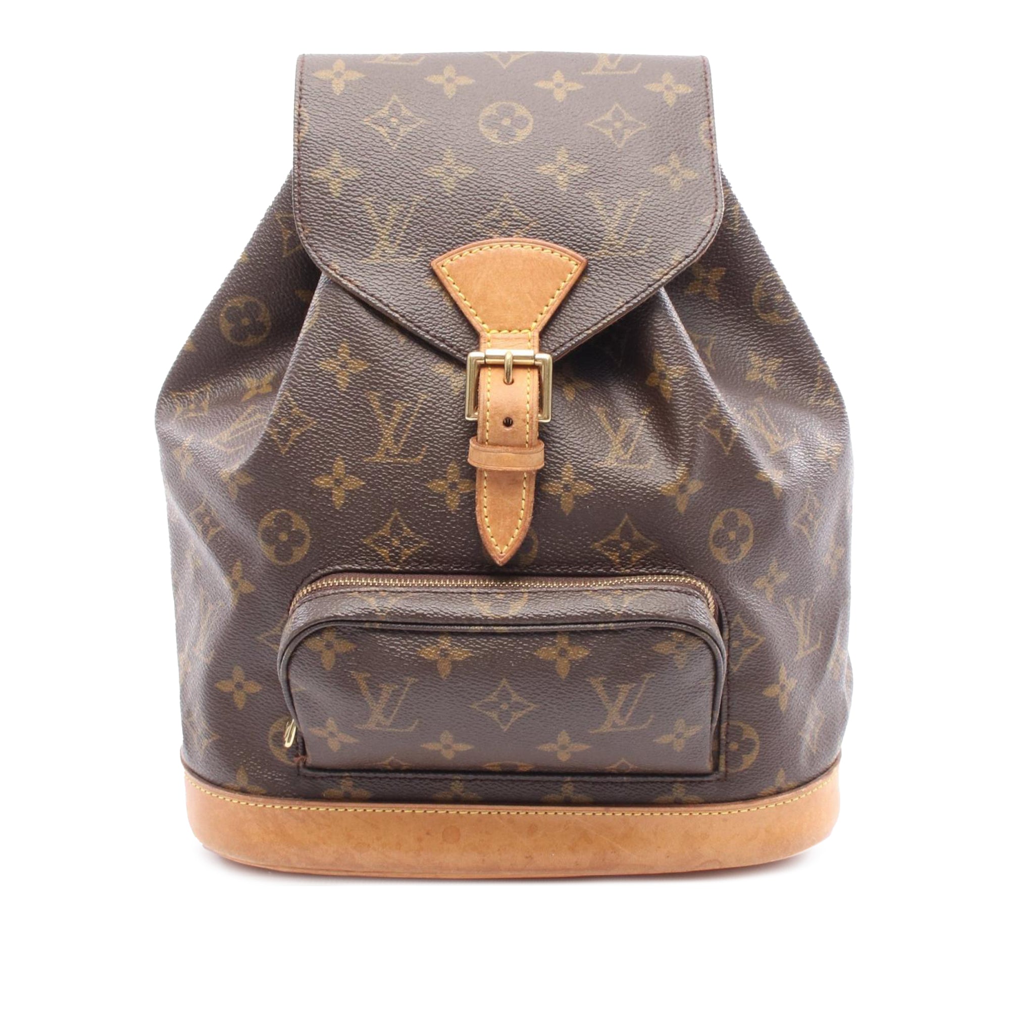 The Montsouris MM features a monogram canvas body with vachetta leather trim, a front flap with a belt buckle detail, a top drawstring closure, an exterior zip pocket, and an interior slip pocket. Retail Price: 1385.00